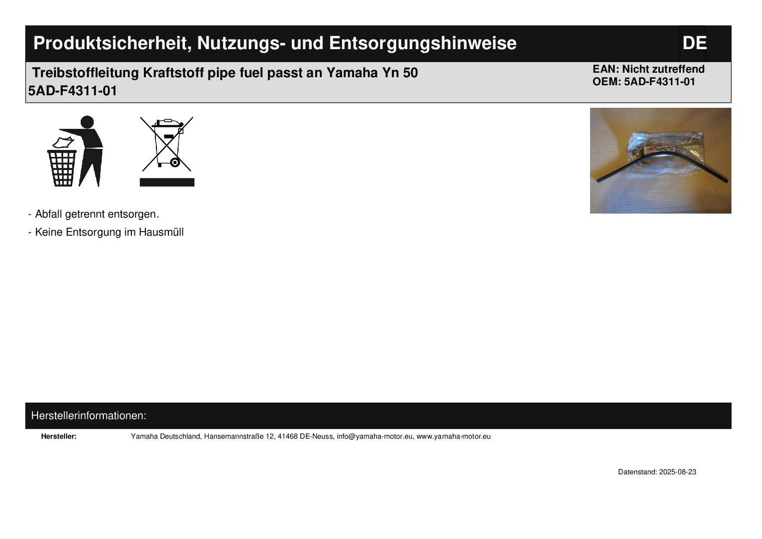 Treibstoffleitung Kraftstoff pipe fuel passt an Yamaha Yn 50 5AD-F4311-01 In dieser Auktion gibt es folgenden Artikel zu kaufen: Treibstoffleitung (siehe Foto) Modell: passend für Yamaha YN 50 Bj.: 01 - 06 Lieferumfang: 1 Stück Artikelzustand: neu aus Geschäftsauflösung, mit minimalen Lagerspuren; Z