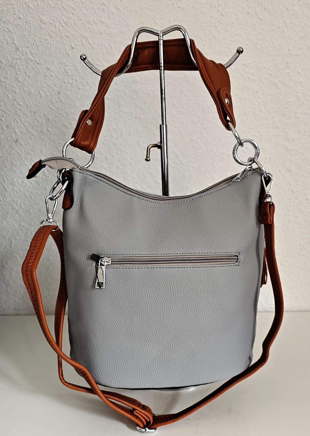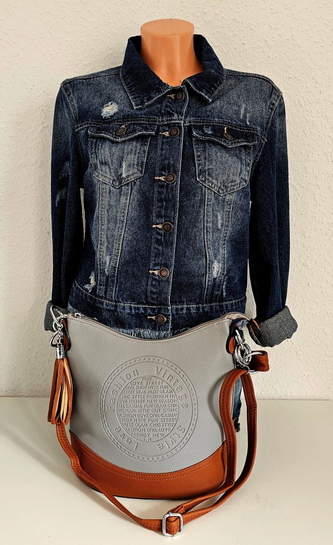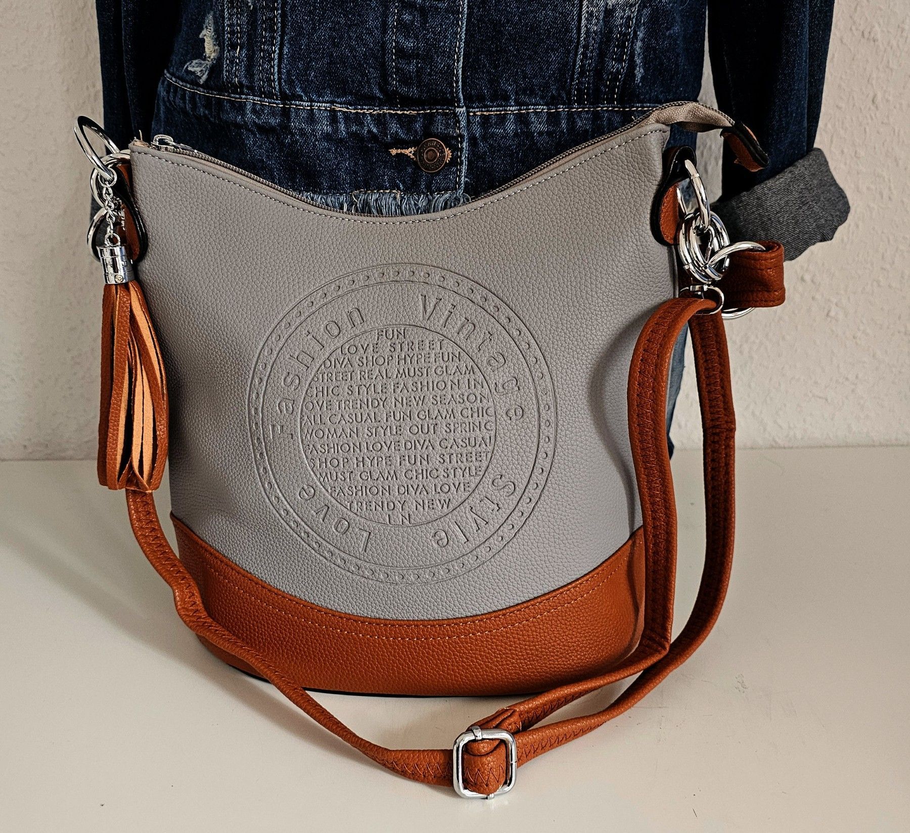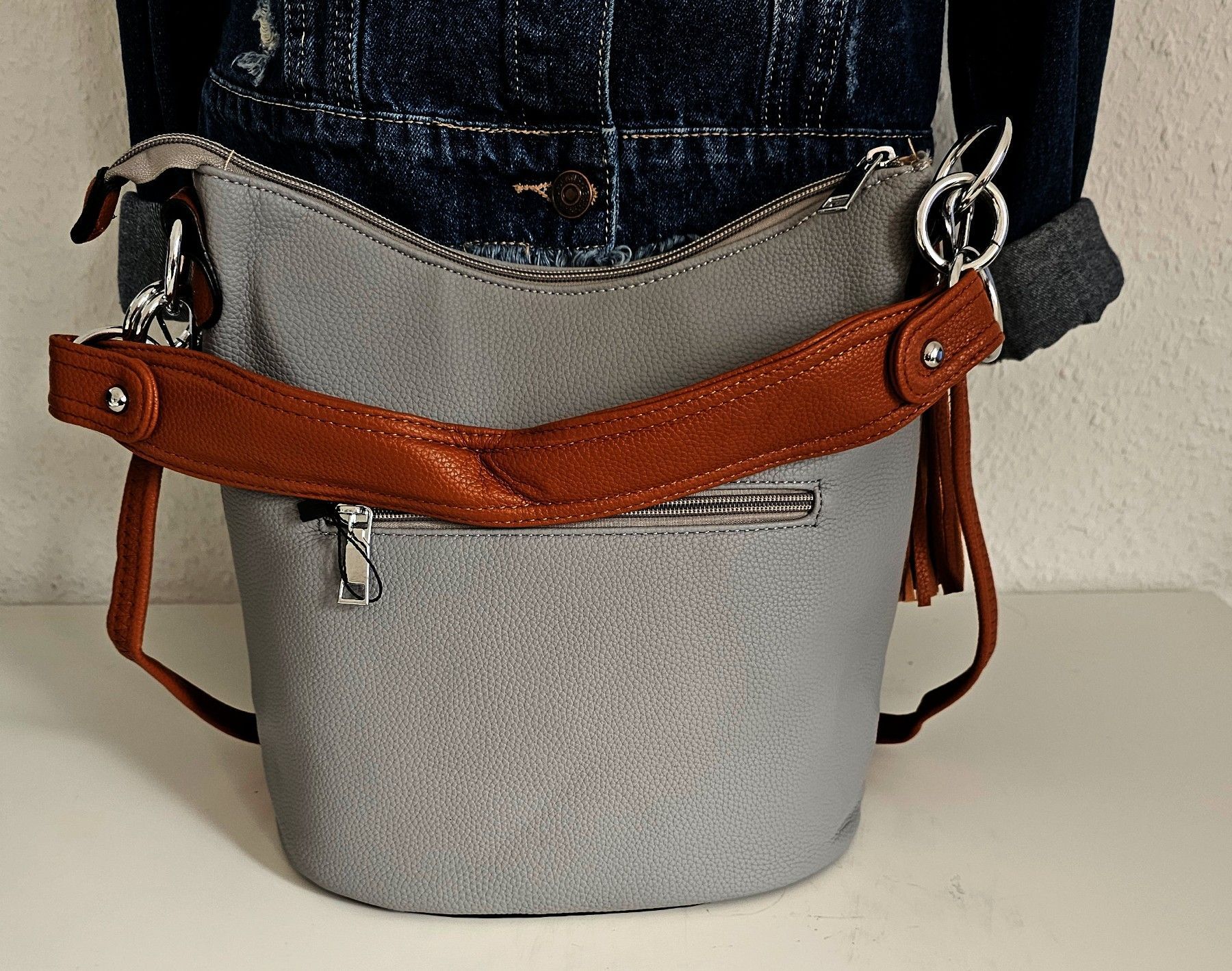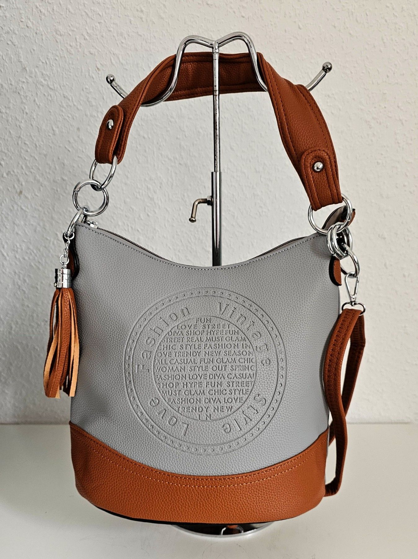 Trend Handtasche Henkeltasche Schultertasche Cross Body Quaste Grau/Braun