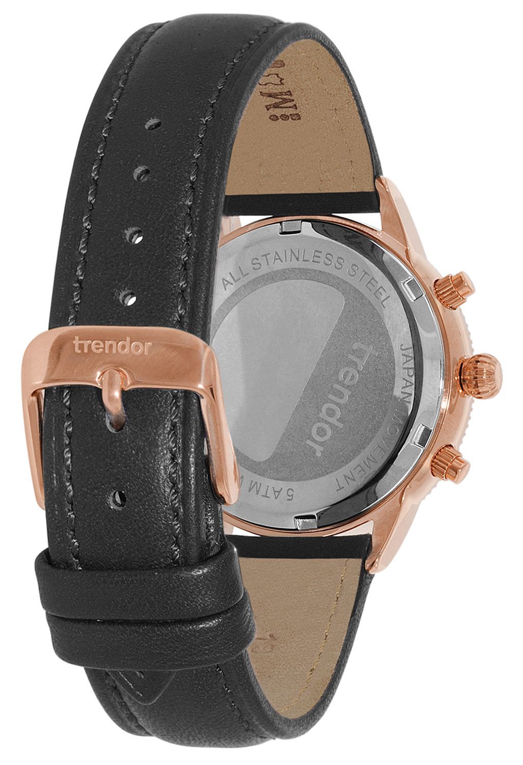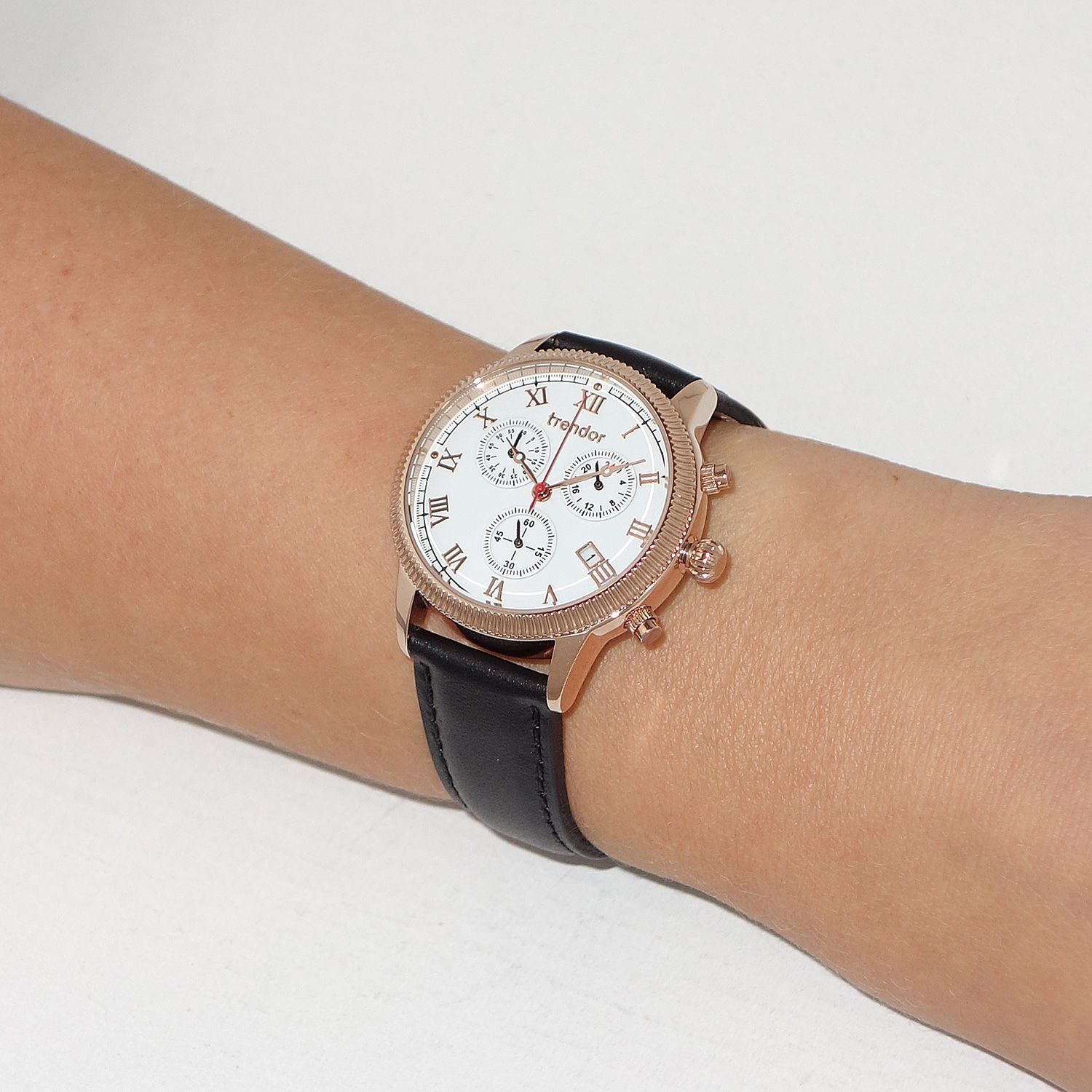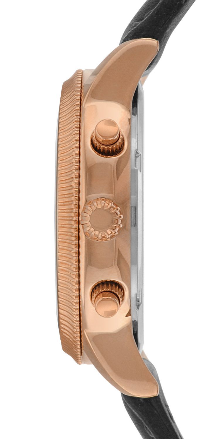 roségold ionen-plattiertes Edelstahlgehäuse, verschraubter Gehäuseboden, Mineralglas, wasserdicht bis 5 bar, Durchmesser 36 mm, Höhe 11 mm, schwarzes Lederarmband, Dornschließe, Quarzwerk, Stoppuhr mit 1/1 Sekunden bis zu 60 Minuten, Datums- und 24-Stunden-Anzeige, weißes Zifferblatt mit polierten römischen Zahlen, schwarze Zeiger, roter Stoppzeiger