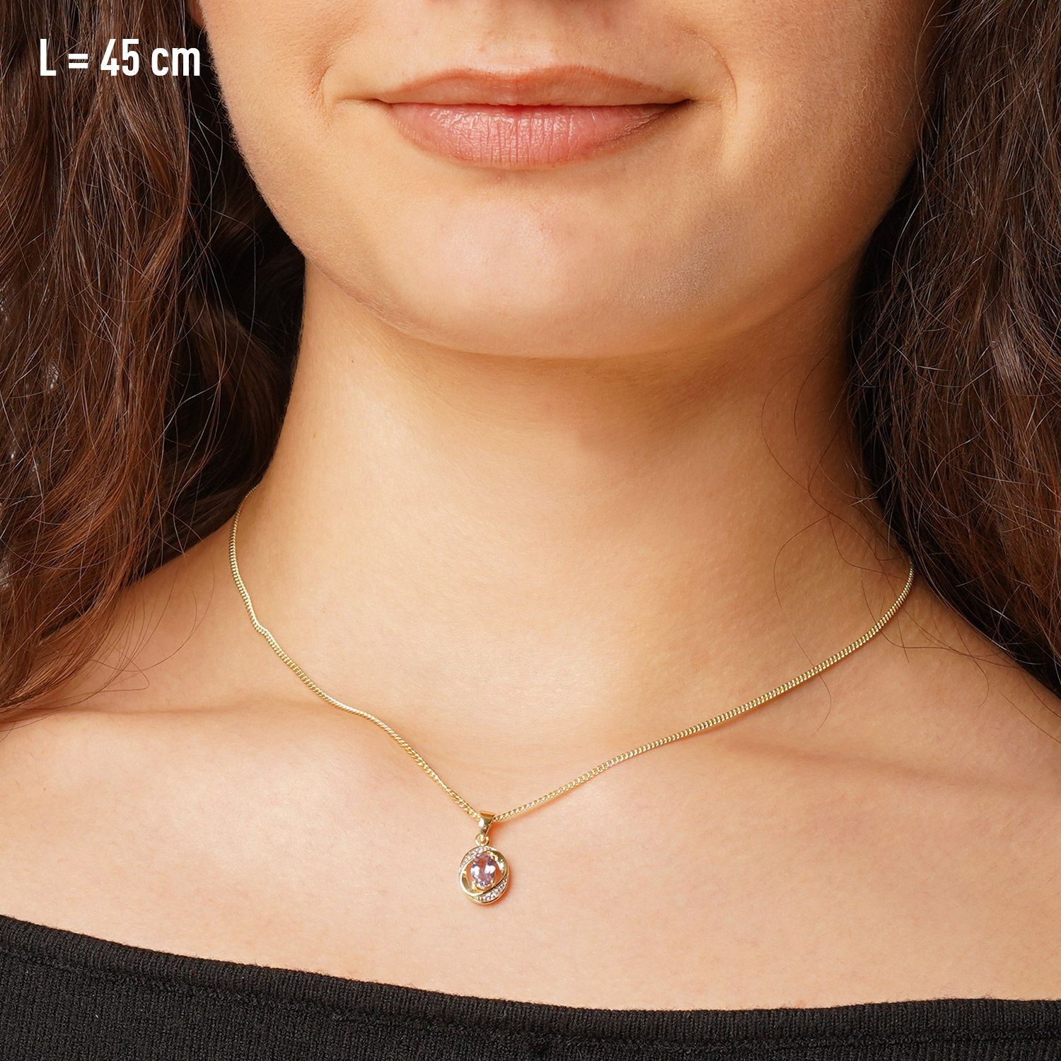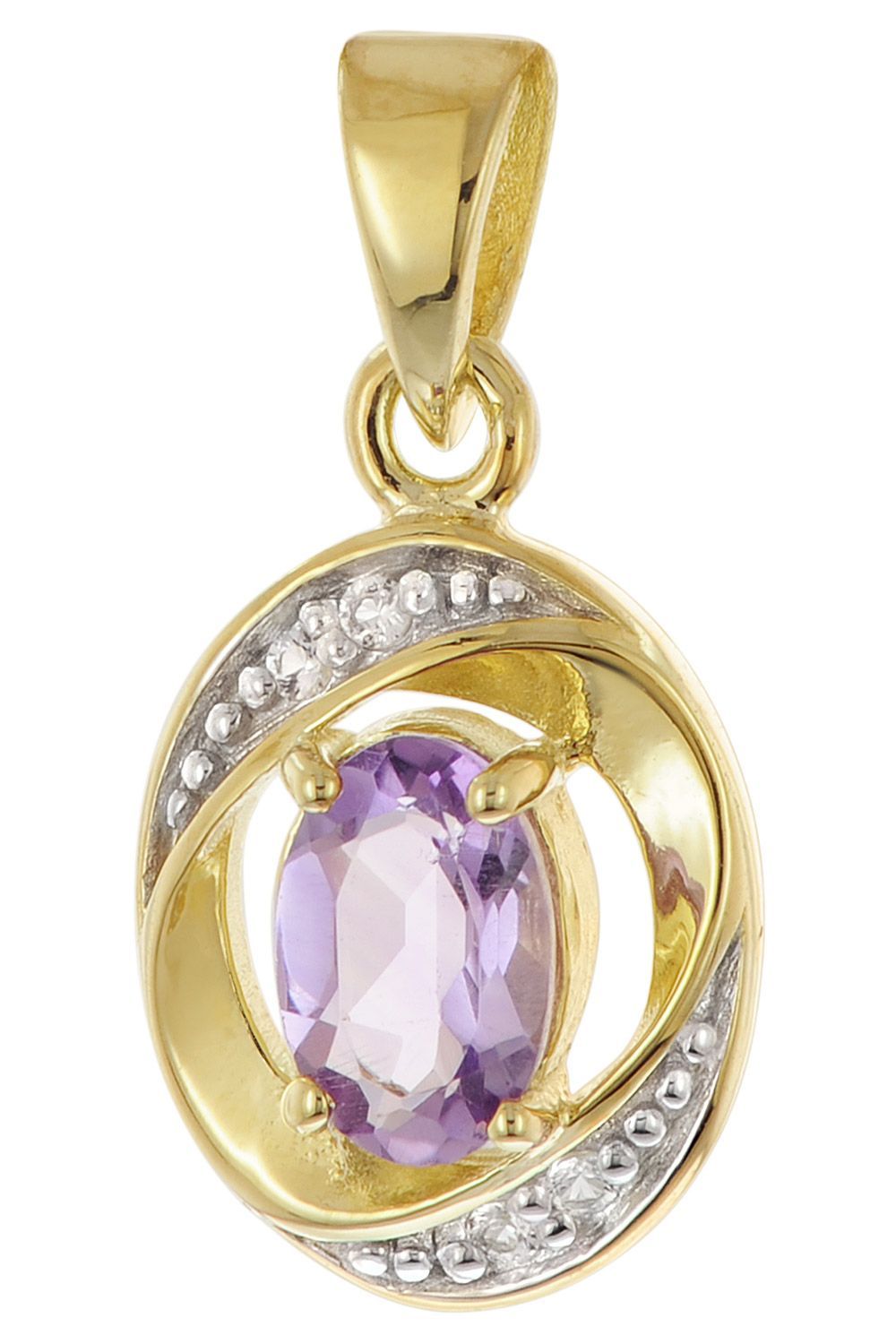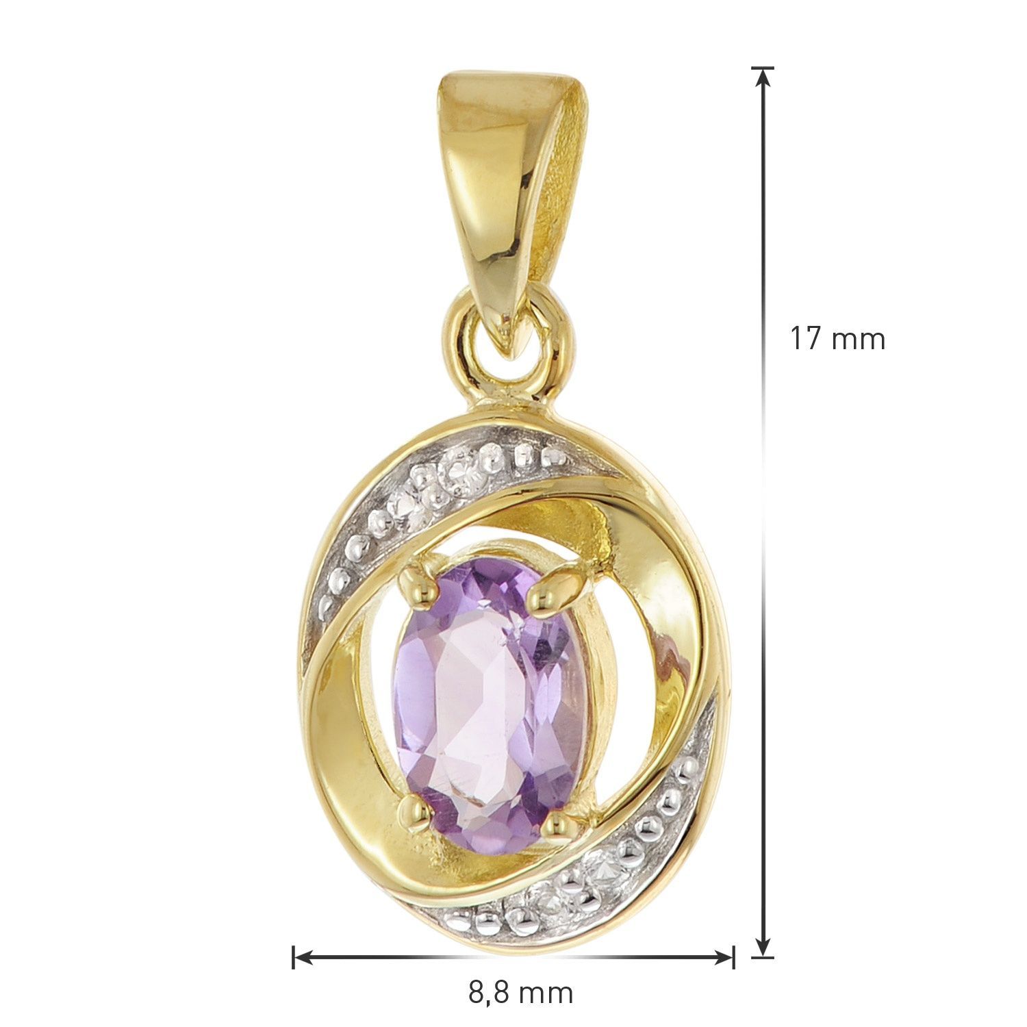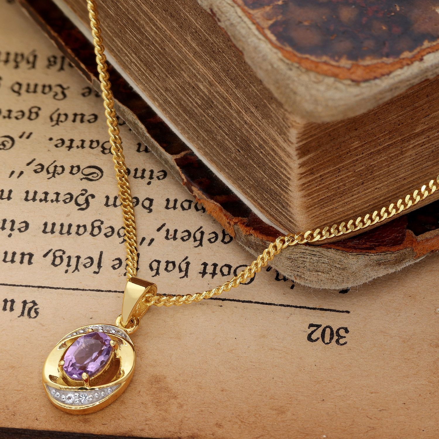 klassischer Schmuck-Anhänger aus 8 Karat Gold, gestempelt 333, oval geschliffener violetter Amethyst, kombiniert mit weißen Topasen, Größe (mit Schlaufe) 17,0 x 8,8 mm, stabile Flachpanzerkette aus vergoldetem Sterlingsilber 925, variable Länge 45 cm, mit Zwischenösen bei 42 und 40 cm, Breite 1,4 mm, bequem bedienbarer Karabiner-Verschluss, Lieferung mit einem Mikrofaser-Pflegetuch