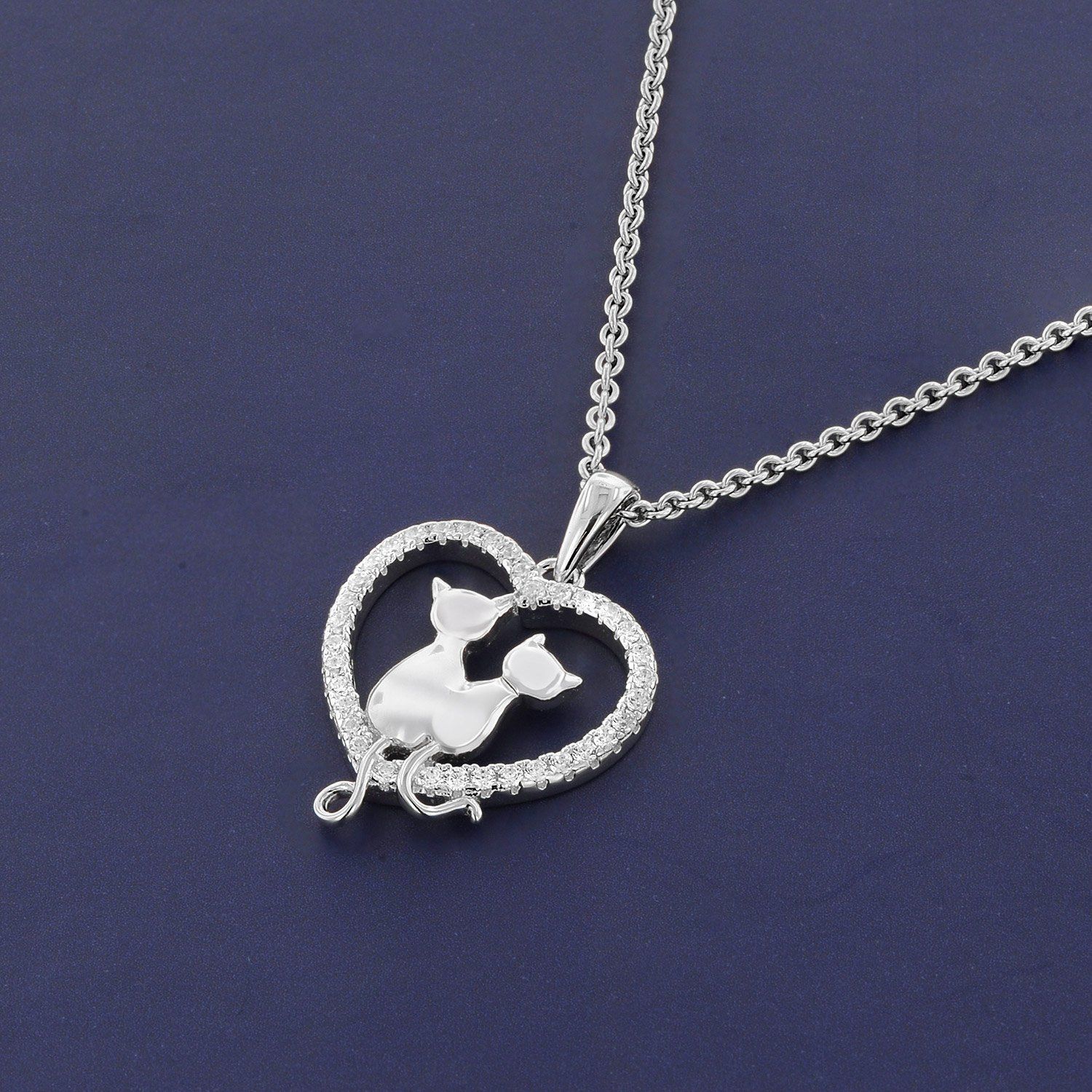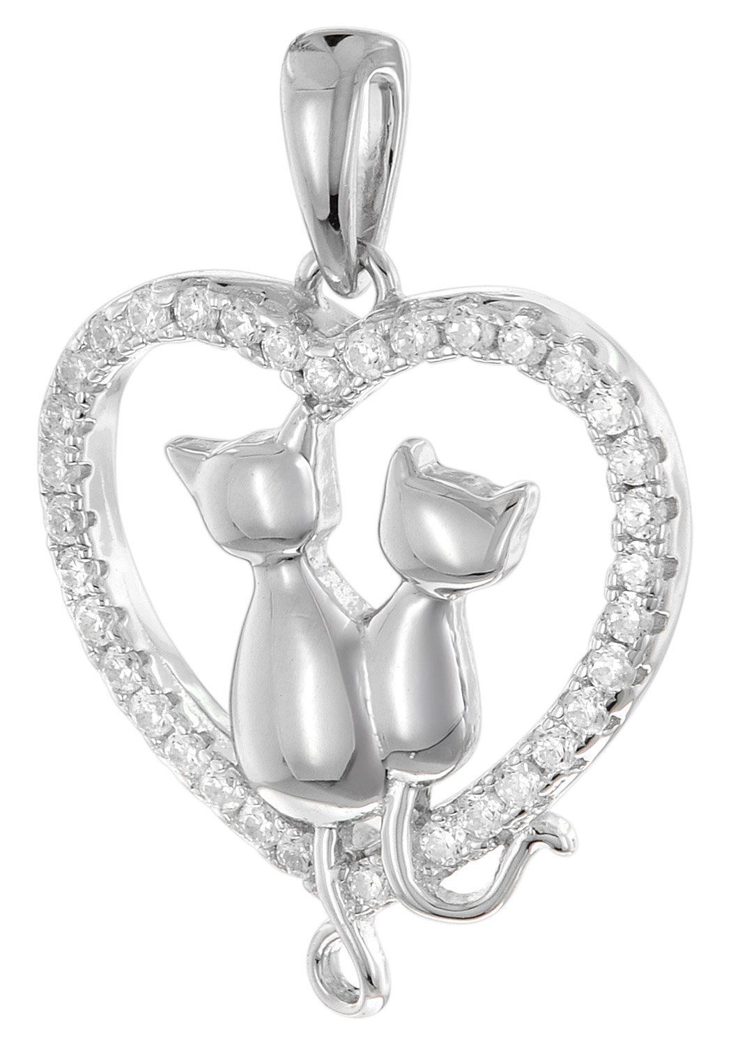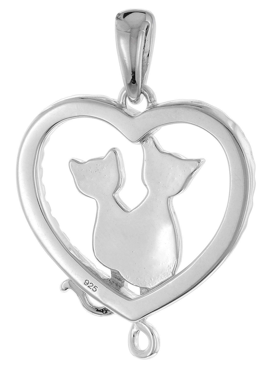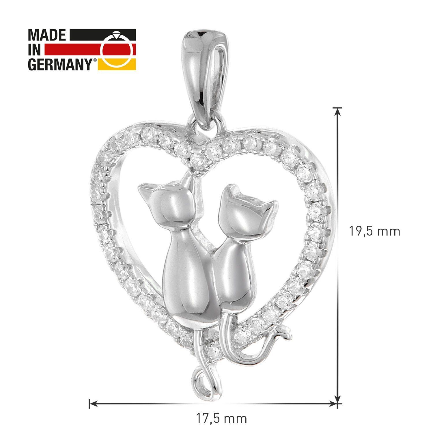 Halskette mit Katzen-Anhänger, aus rhodiniertem Sterlingsilber 925, die Rhodium-Auflage bietet Anlaufschutz und bringt strahlenden Glanz, herzförmiger Anhänger mit Katzenmotiv, gesamter Rand besetzt mit glitzernden Zirkonias, Anhängergröße ohne Schlaufe gemessen 19,5 x 17,5 mm (LxB), unempfindliche Rundanker-Silberkette mit Zwischenöse, Kettenbreite 1,4 mm, Kettenlänge 40 cm mit Zwischenöse bei 38 cm, Länge 45 cm mit Zwischenöse auch 42 cm lang tragbar, praktischer Federring-Verschluss, Made in