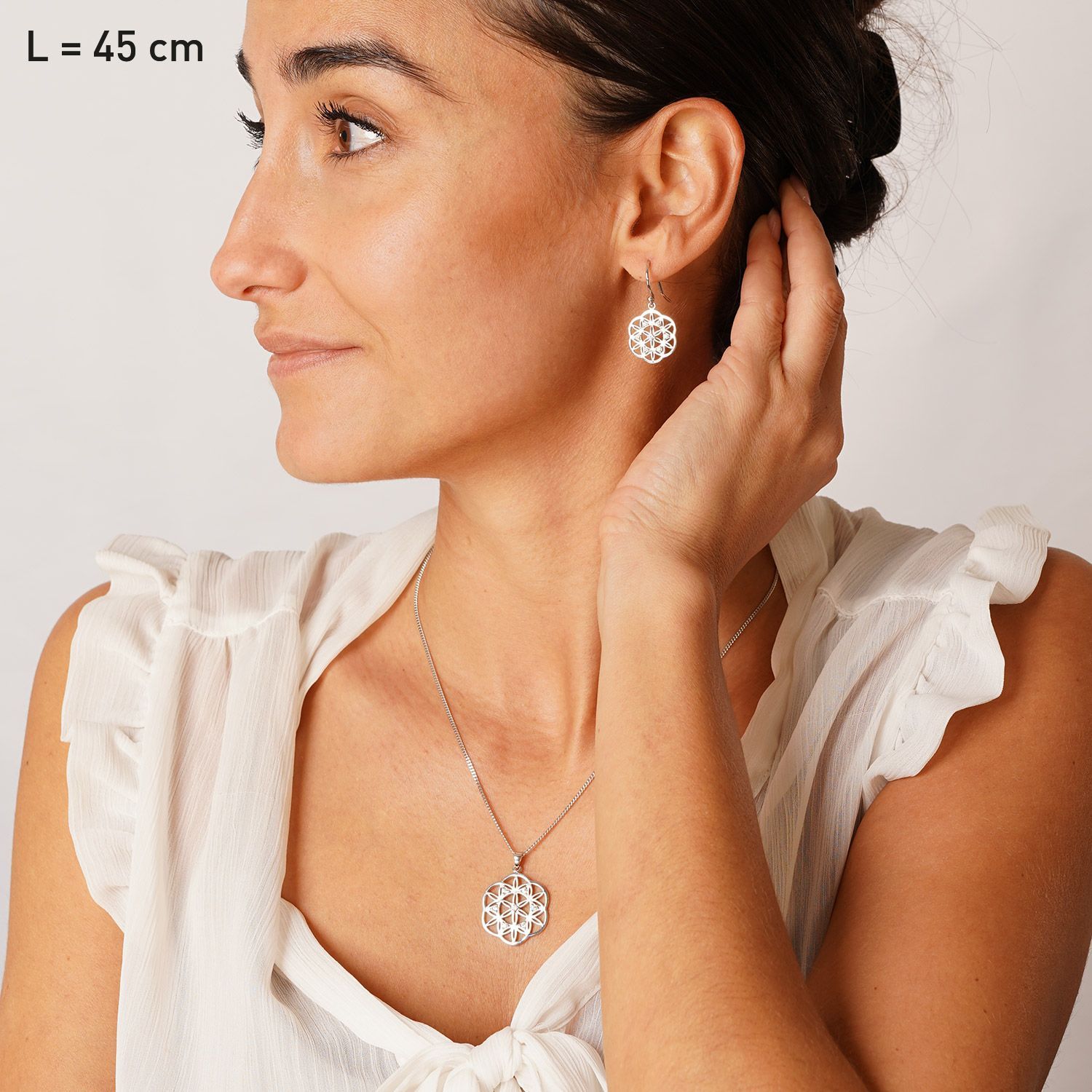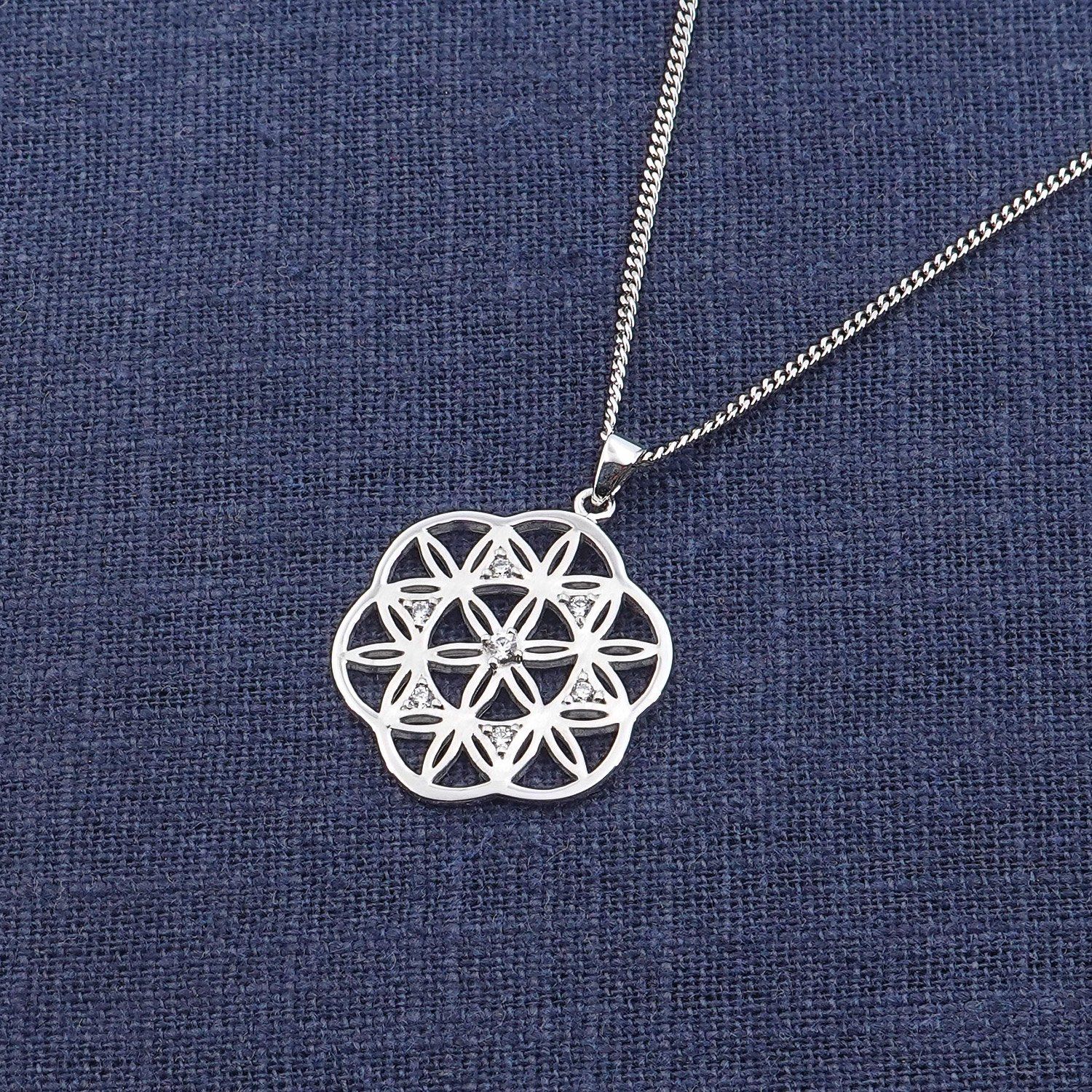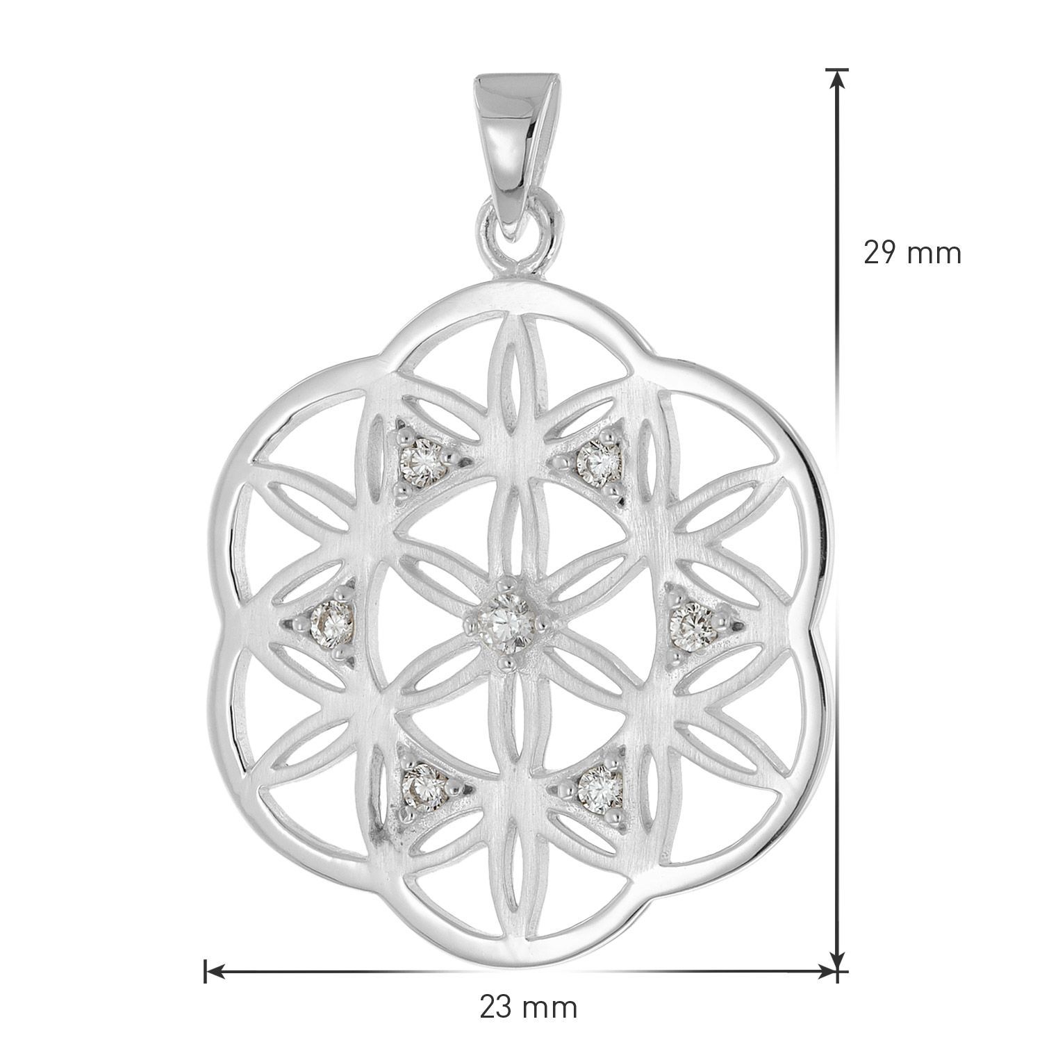 Damen-Kette mit Mandala-Anhänger, rhodiniertes Sterlingsilber 925, die Rhodium-Auflage schützt vor dem Anlaufen und bringt strahlenden Glanz, Anhänger mit 7 glitzernden Zirkonia, mattiert, polierter Rand, Durchmesser 23 mm, stabile Flachpanzer-Kette, Breite 1,4 mm, Länge 45 cm, Zwischenöse bei 42 cm, Federring-Verschluss, Lieferung inklusive Mikrofaser-Pflegetuch