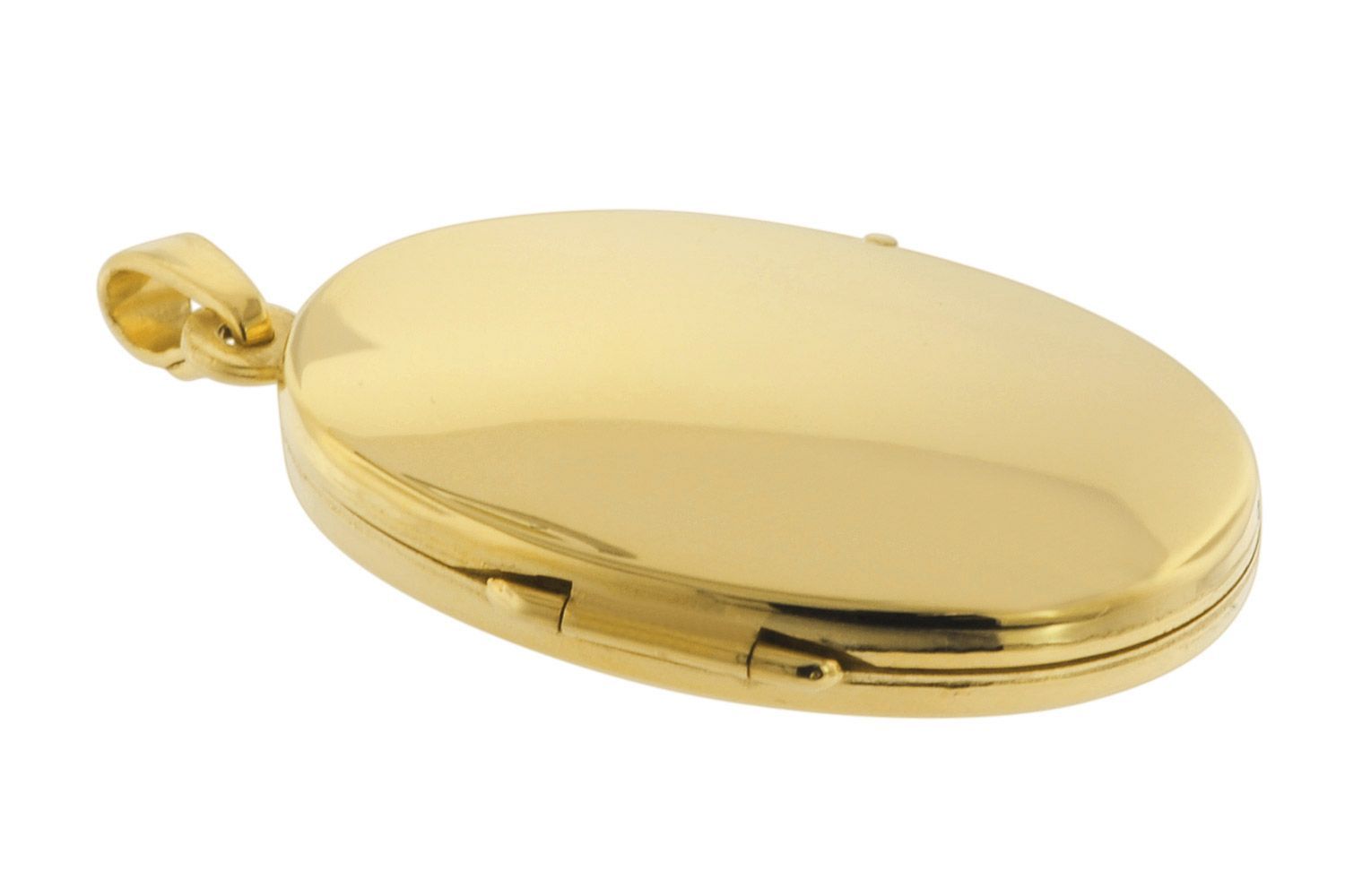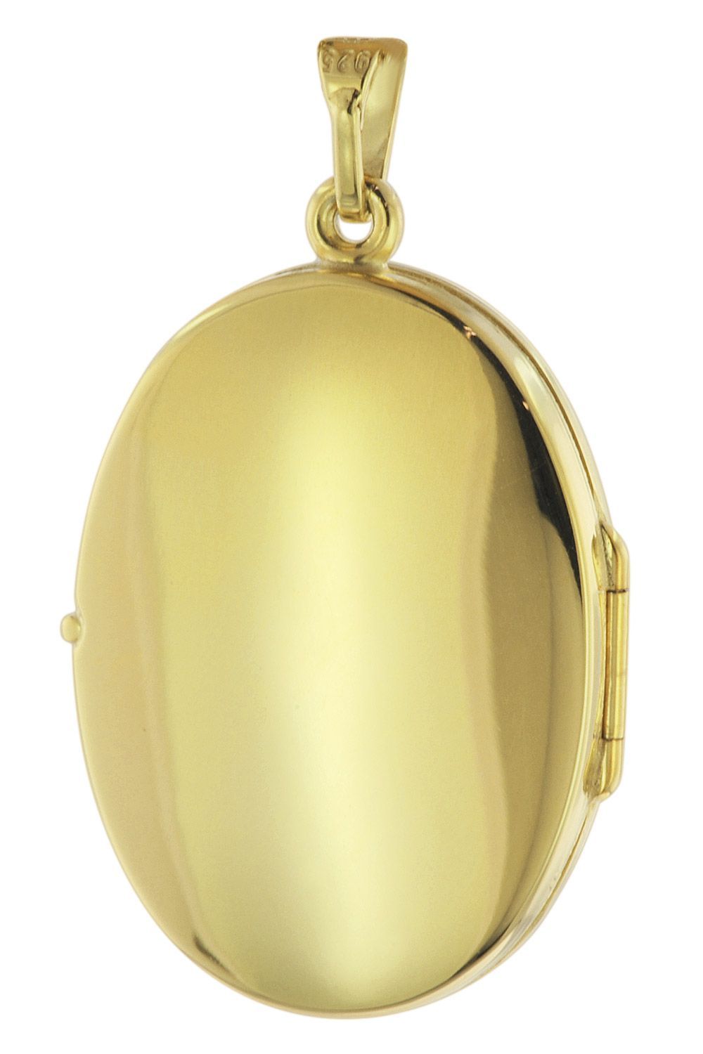 Collier mit ovalem Medaillon-Anhänger, goldplattiertes Sterlingsilber 925, Made in Germany, polierter Anhänger zum Öffnen für zwei Bilder, Innenseiten mit Klarsichtfolie, Größe (ohne Ösen) 26 x 19 x 6,6 mm, Gesamtlänge 33 mm, stabile Silberkette mit Goldplattierung, Rundanker-Muster, Stärke 1,5 mm, mit praktischem Federring-Verschluss, inklusive einem kleinen Putz- und Pflegetuch aus Mikrofaser
