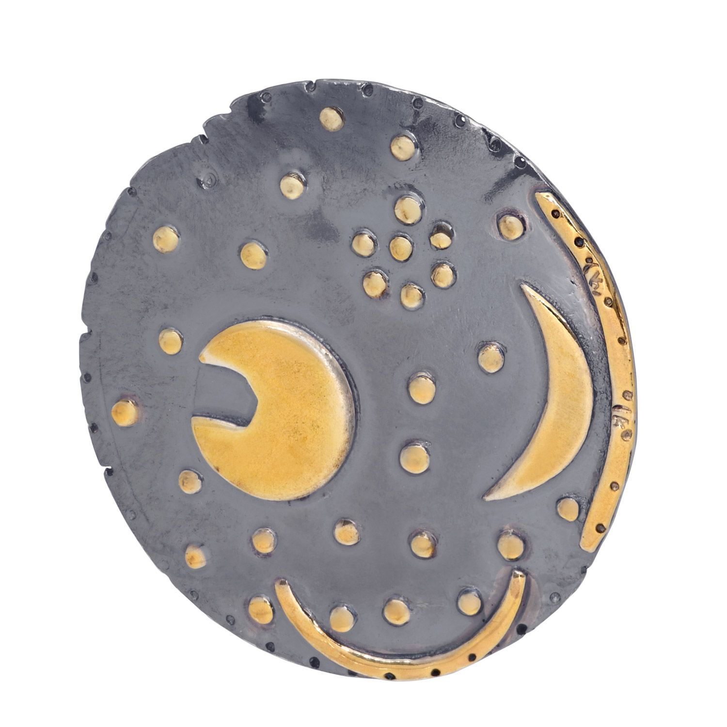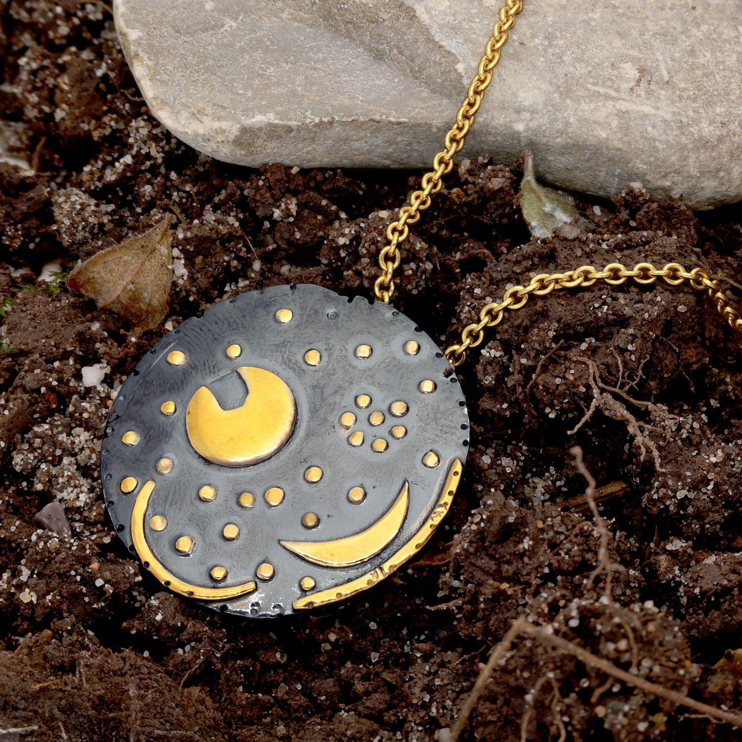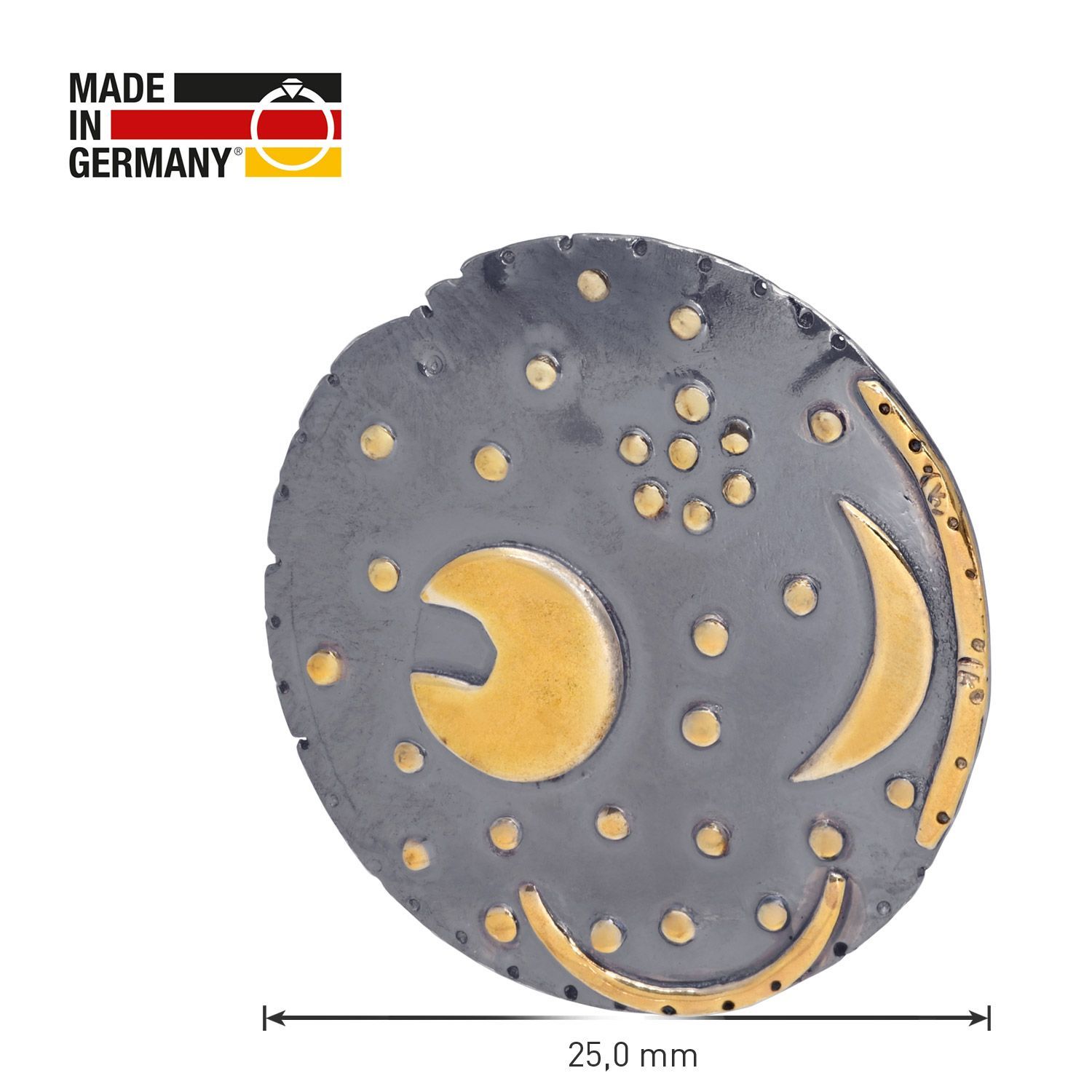 Halskette made in Germany mit der Nachbildung der Himmelsscheibe von Nebra, der ersten Bronze-Himmelsdarstellung der Menschheit aus der Zeit um 1.600 vor Christus, die den Kosmos mit Sonne, Mond, Mondsichel und die Plejaden darstellt, Anhänger mit 25 mm Durchmesser, aus Sterlingsilber 925, galvanisch geschwärzt und vergoldet, Rundanker-Halskette aus vergoldetem Sterlingsilber, Stärke 1,5 mm, Federring-Verschluss, Lieferung mit einem Mikrofaser-Pflegetuch, in einer trendor Geschenkpackung