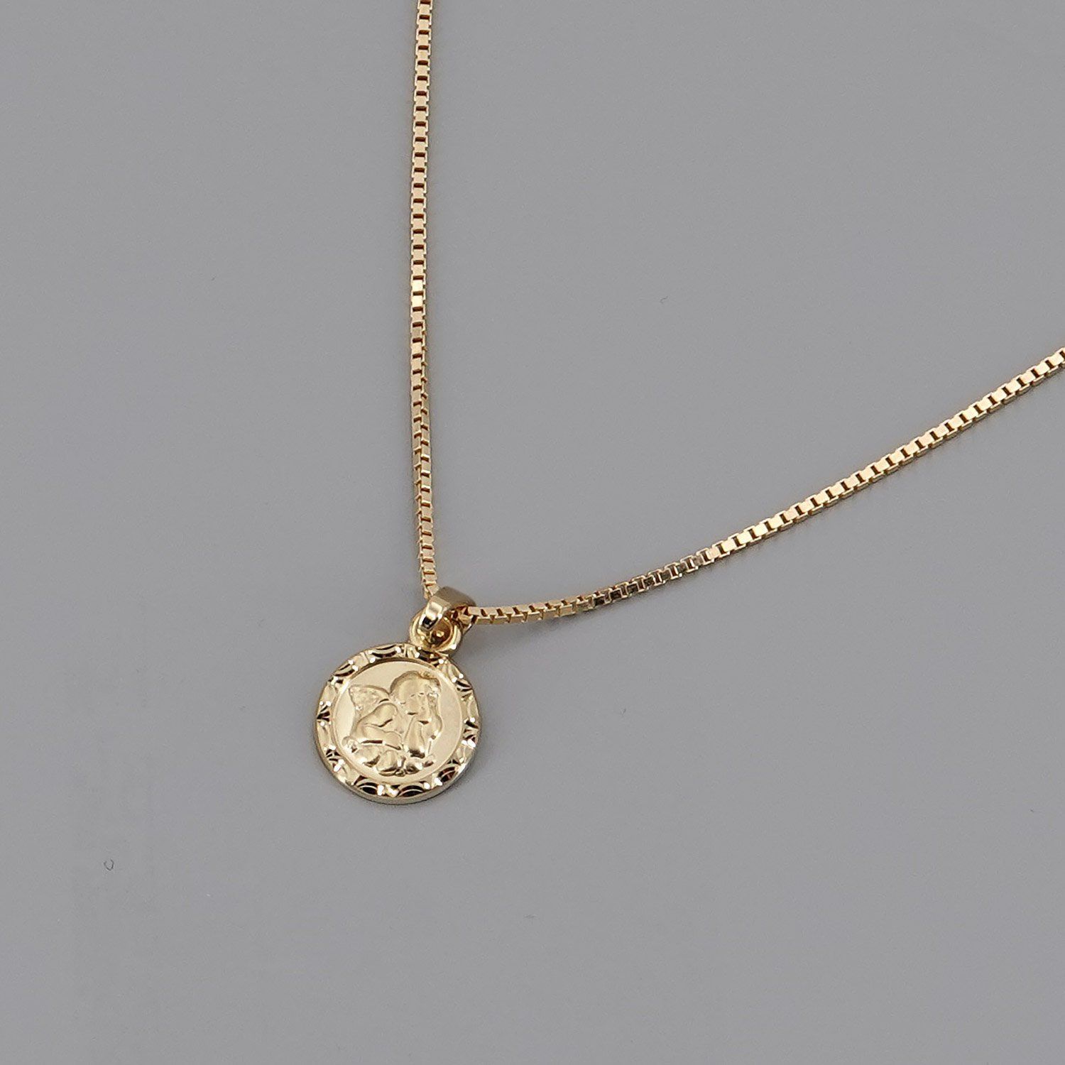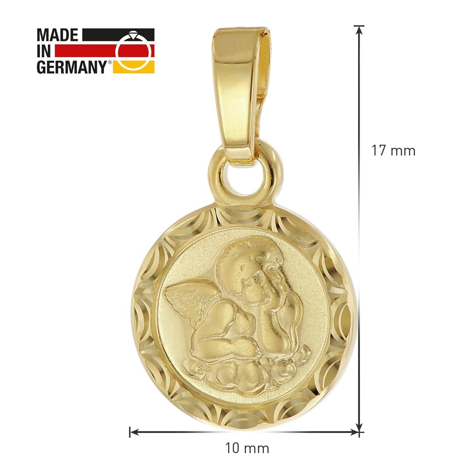 Kinder-Halsschmuck mit Engel-Anhänger aus 8-Karat-Gold 333 und vergoldeter Silberkette, runder Anhänger mit Engel-Motiv, mattierte Vorderseite mit Amor-Relief und diamantiertem Rand, Rückseite poliert, Durchmesser 10 mm, Länge (mit Schlaufe) 17 mm, Venezianer Collierkette aus goldplattiertem Sterlingsilber 925, Stärke 0,9 mm, Länge 40 cm, Zwischenöse ermöglicht 2 cm kürzeres Tragen, Federring-Verschluss, Made in Germany, Lieferung inklusive einem Mikrofaser-Pflegetuch
