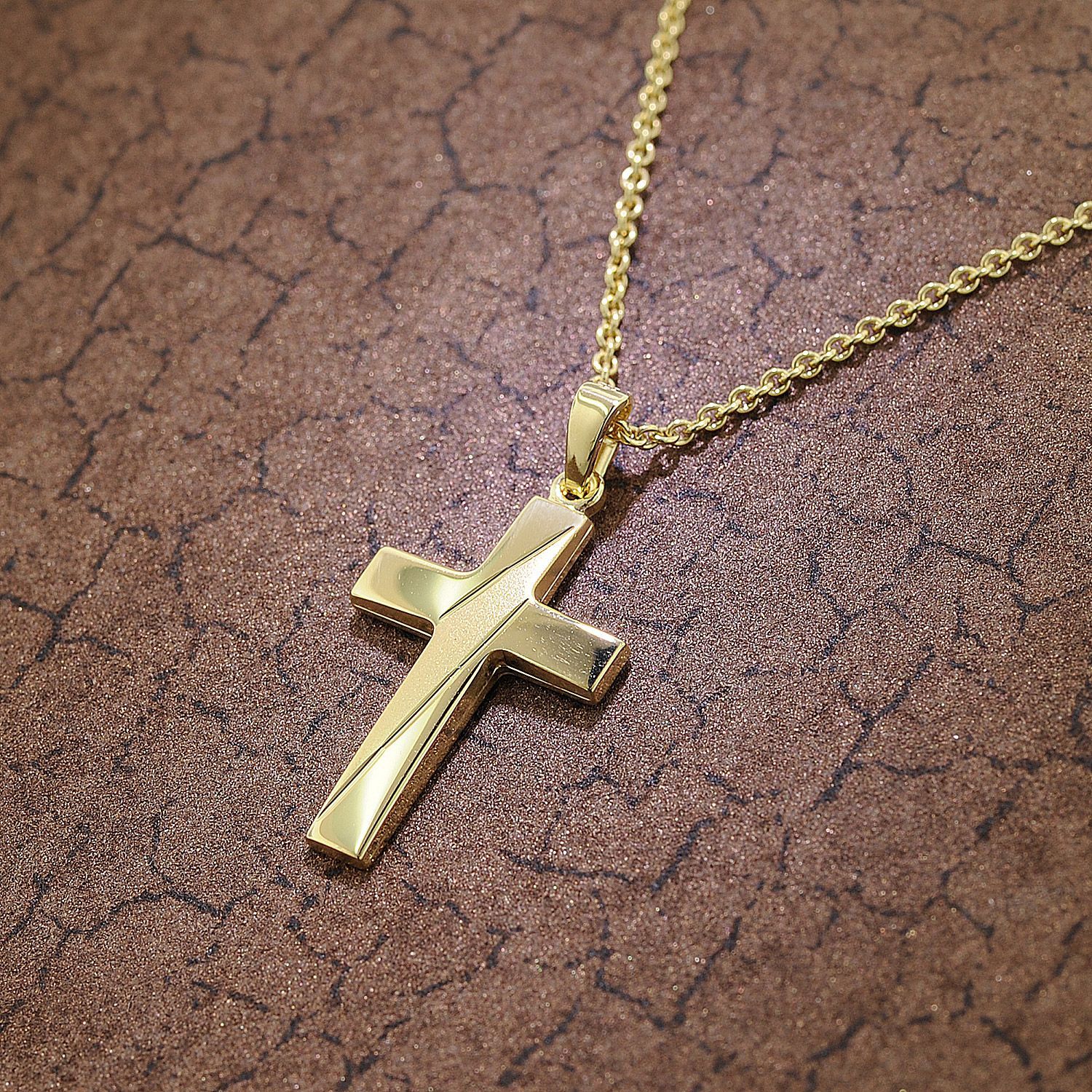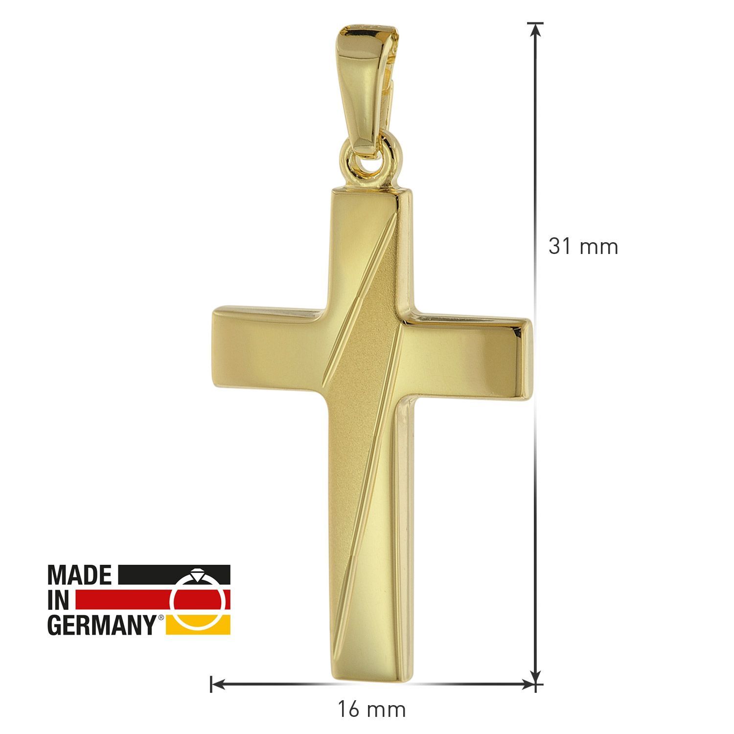 Halskette mit diamantiertem Kreuz-Anhänger, aus goldplattiertem Sterlingsilber 925, Made in Germany, diamantierter Kreuz-Anhänger, poliert und gesandelt, Größe (ohne Ösen) 24 x 16 x 2,2 mm, Gesamtlänge 31 mm, stabile Silberkette mit Goldplattierung, Rundanker-Muster, Stärke 1,5 mm, mit praktischem Federring-Verschluss, inklusive einem kleinen Putz- und Pflegetuch aus Mikrofaser