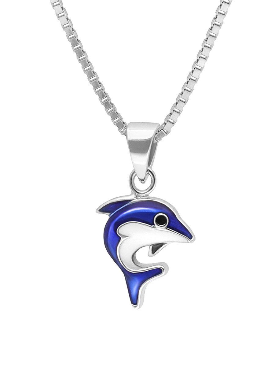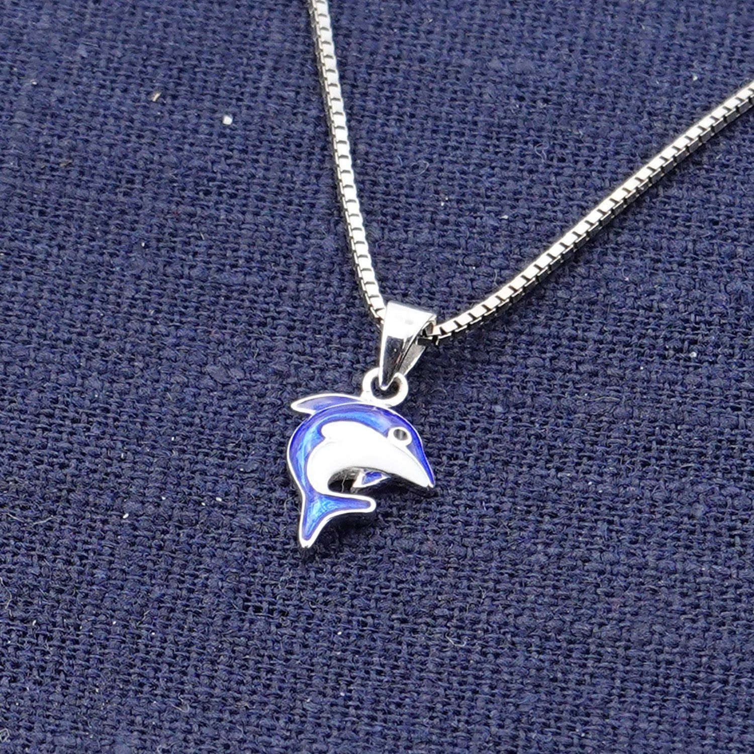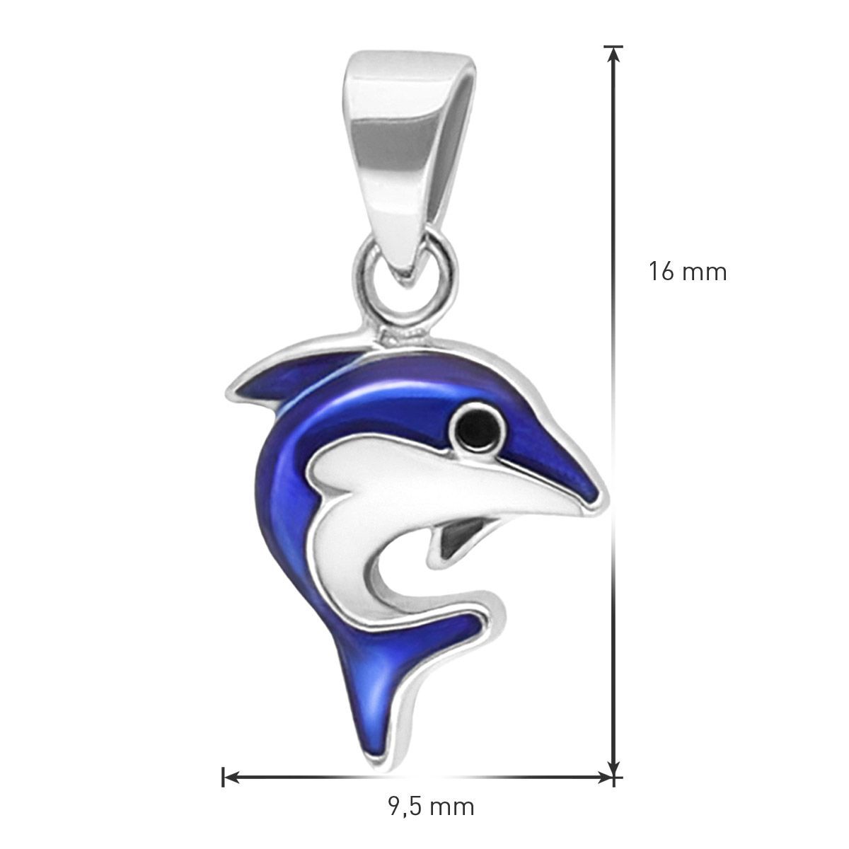 Halskette für Mädchen mit Delfin-Anhänger, Sterlingsilber 925, rhodiniert, anlaufgeschützt, Venezianer Collierkette, Stärke 0,9 mm, Länge 40 cm, mit Zwischenöse auch 38 cm lang tragbar, Federring-Verschluss, blau und weiß emaillierter Delfin als Anhänger, Anhängergröße (mit Schlaufe) 16 x 9,5 mm, Lieferung inklusive einem Mikrofaser Putz- und Pflegetuch