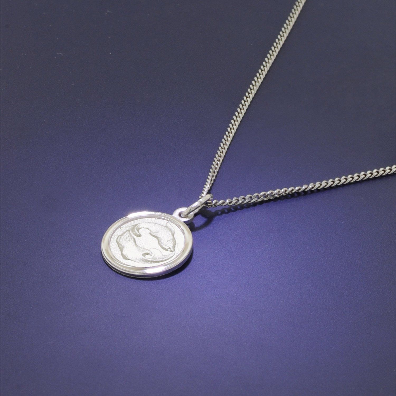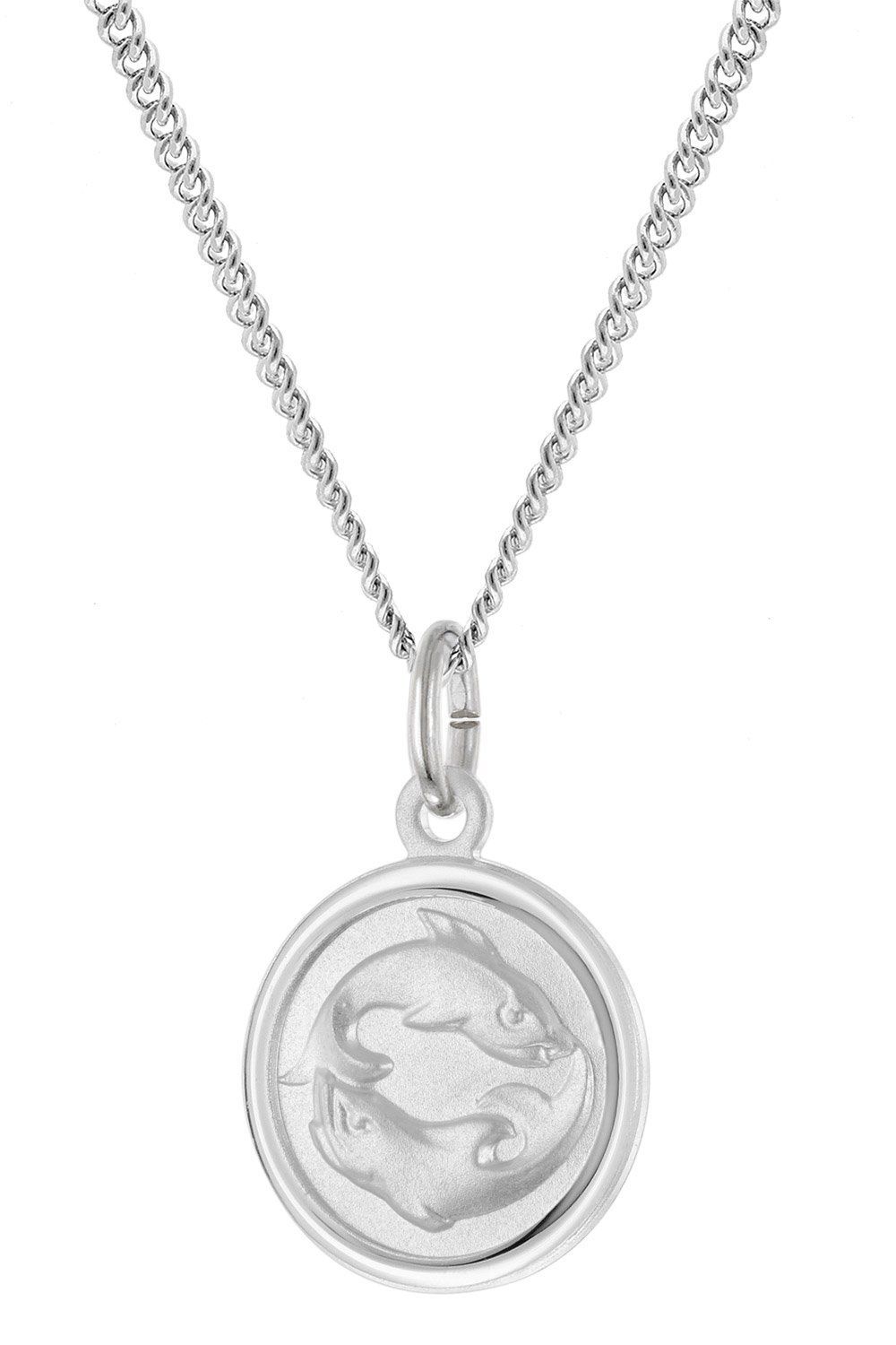 Halskette mit Anhänger Tierkreiszeichen Fische (20.02.-20.03.), aus rhodiniertem Sterlingsilber 925, die Rhodium-Auflage bietet Anlaufschutz und bringt strahlenden Glanz, zierlicher Anhänger, mattiert mit poliertem Rand, erhabenes Fische Sternzeichen-Motiv, Durchmesser 12 mm, an einer feinen, stabilen Flachpanzer-Halskette, Breite 1,2 mm, Federring-Verschluss, hochwertig verarbeitet, Lieferung inklusive Mikrofaser-Pflegetuch