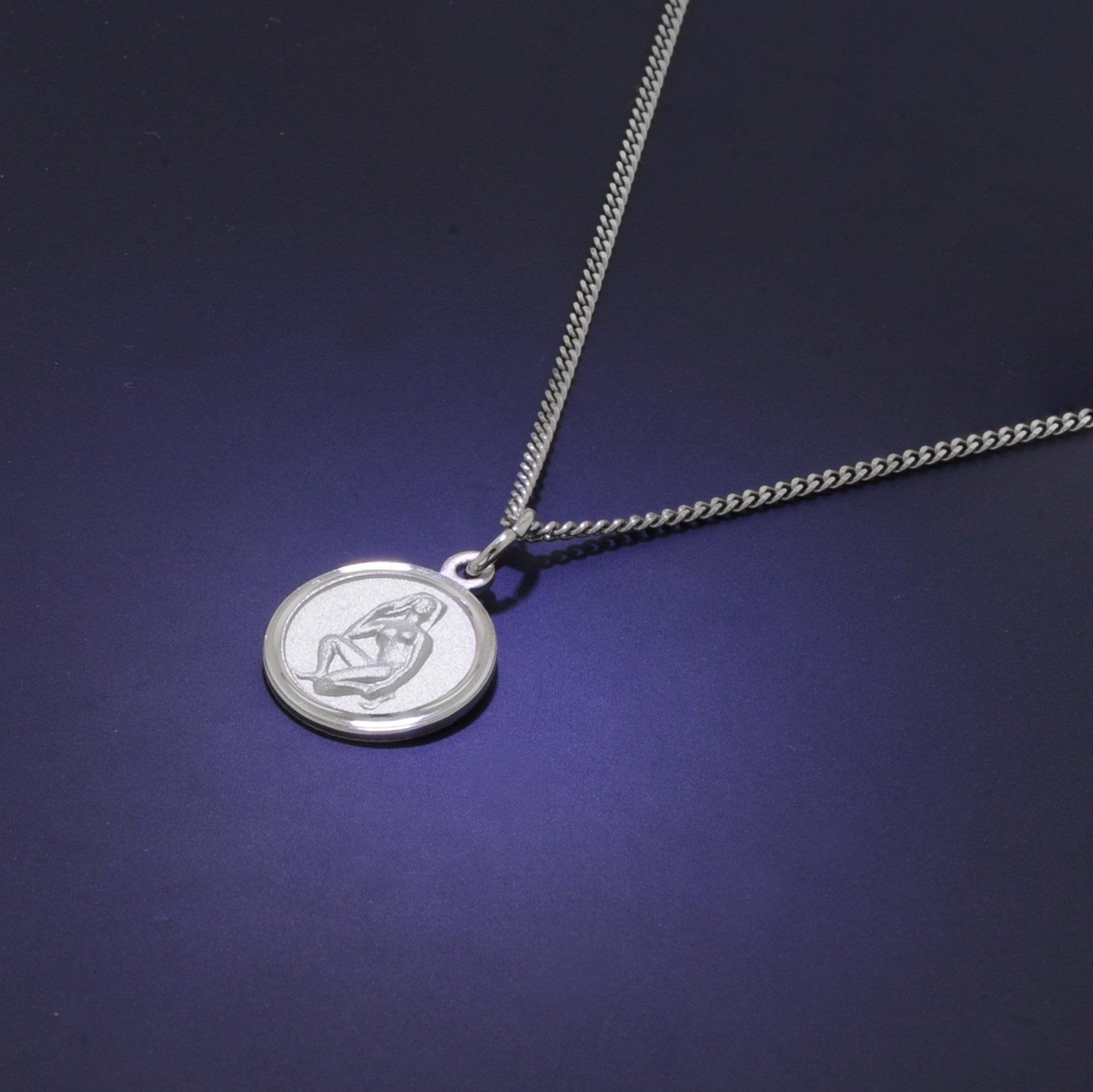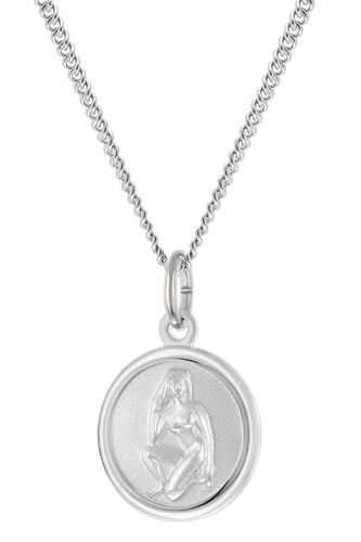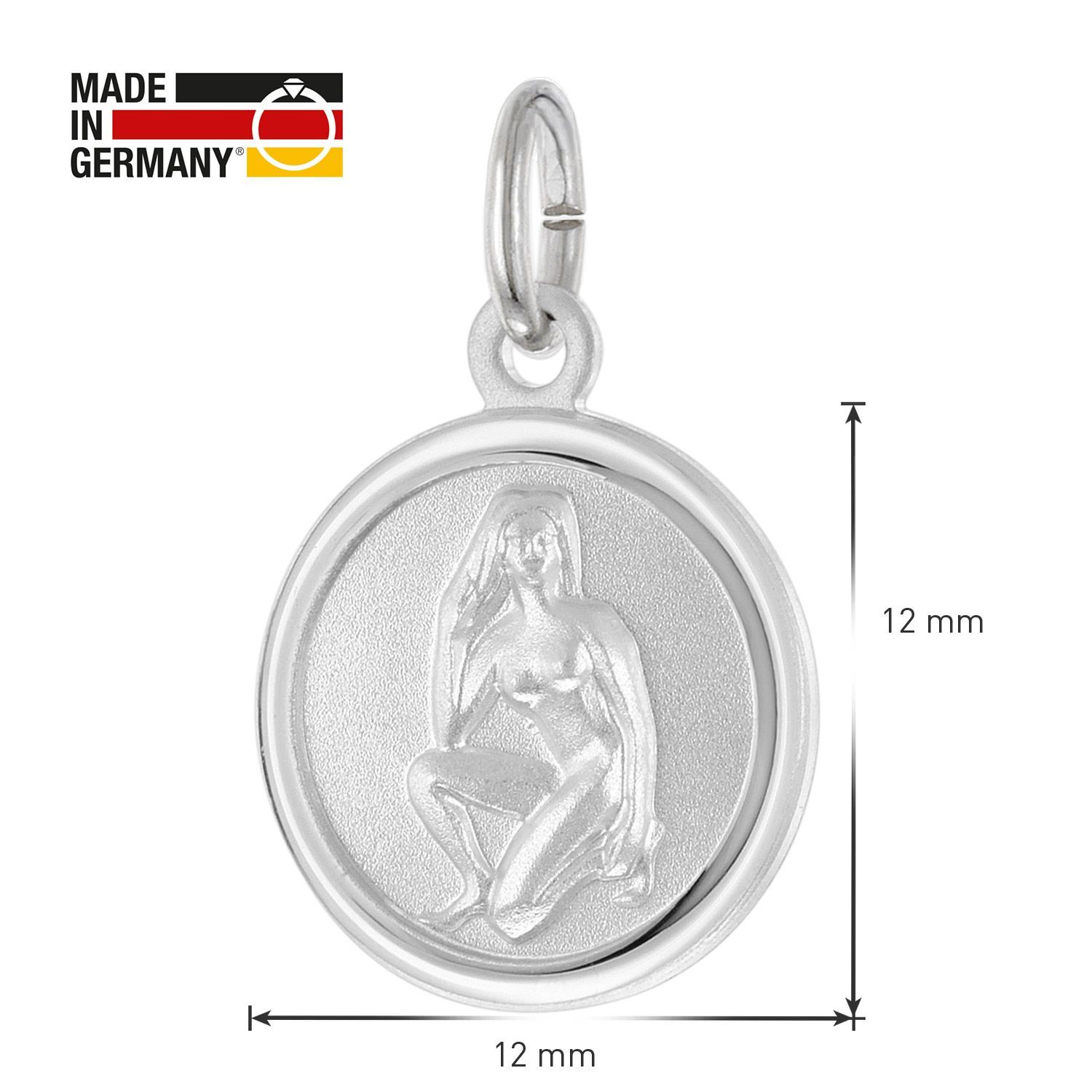 Kette mit Anhänger Tierkreiszeichen Jungfrau (24.08.-23.09.), aus rhodiniertem Sterlingsilber 925, die Rhodium-Auflage bietet Anlaufschutz und bringt strahlenden Glanz, zierlicher Anhänger, mattiert mit poliertem Rand, erhabenes Jungfrau Sternzeichen-Motiv, Durchmesser 12 mm, an einer feinen, stabilen Flachpanzer-Halskette, Breite 1,2 mm, Federring-Verschluss, hochwertig verarbeitet, Lieferung inklusive Mikrofaser-Pflegetuch