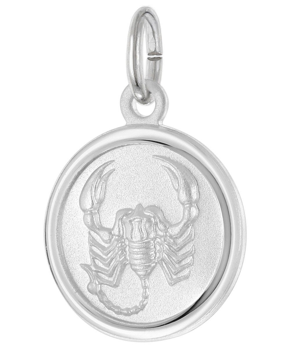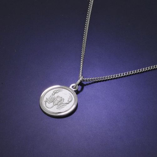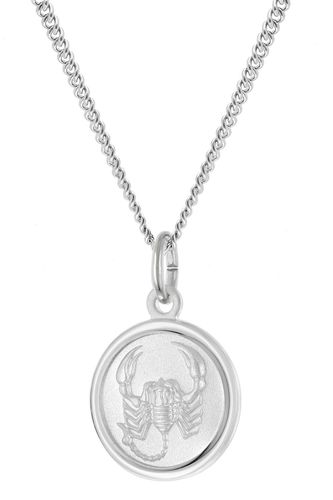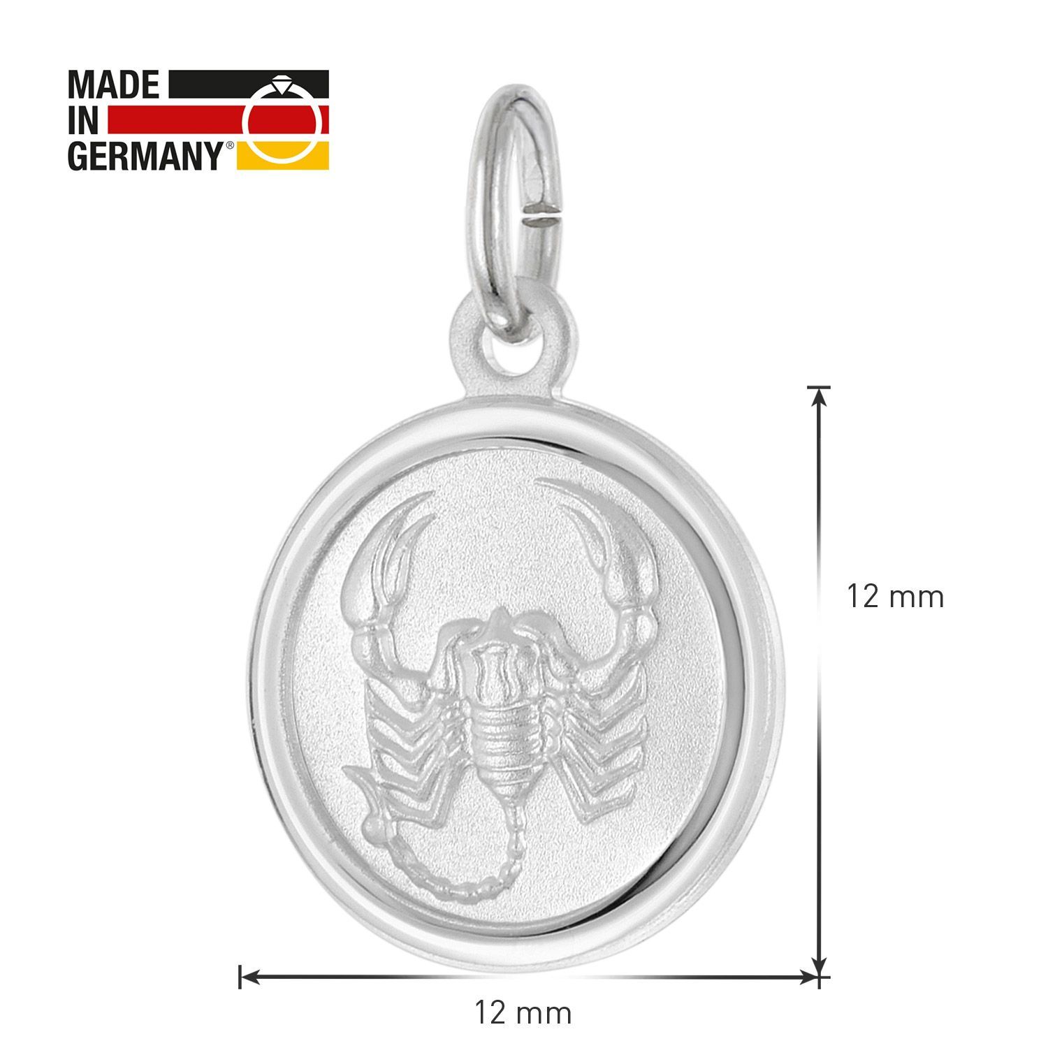 Halskette mit Anhänger Tierkreiszeichen Skorpion (24.10.-22.11.), aus rhodiniertem Sterlingsilber 925, die Rhodium-Auflage bietet Anlaufschutz und bringt strahlenden Glanz, zierlicher Anhänger, mattiert mit poliertem Rand, erhabenes Skorpion Sternzeichen-Motiv, Durchmesser 12 mm, an einer feinen, stabilen Flachpanzer-Halskette, Breite 1,2 mm, Federring-Verschluss, hochwertig verarbeitet, Lieferung inklusive Mikrofaser-Pflegetuch