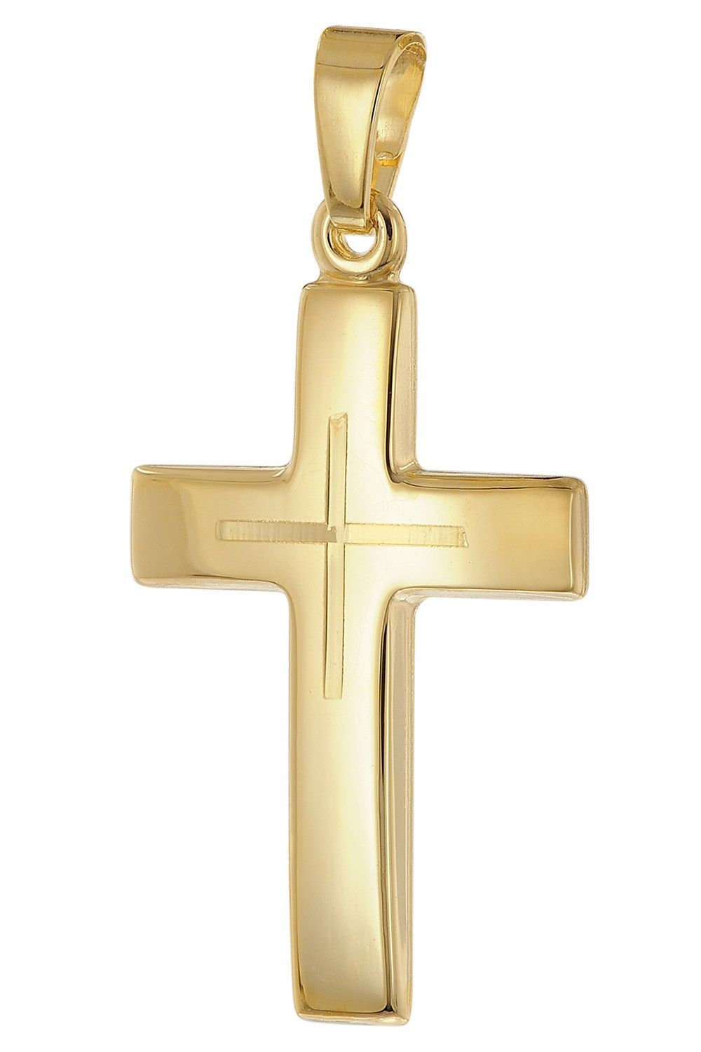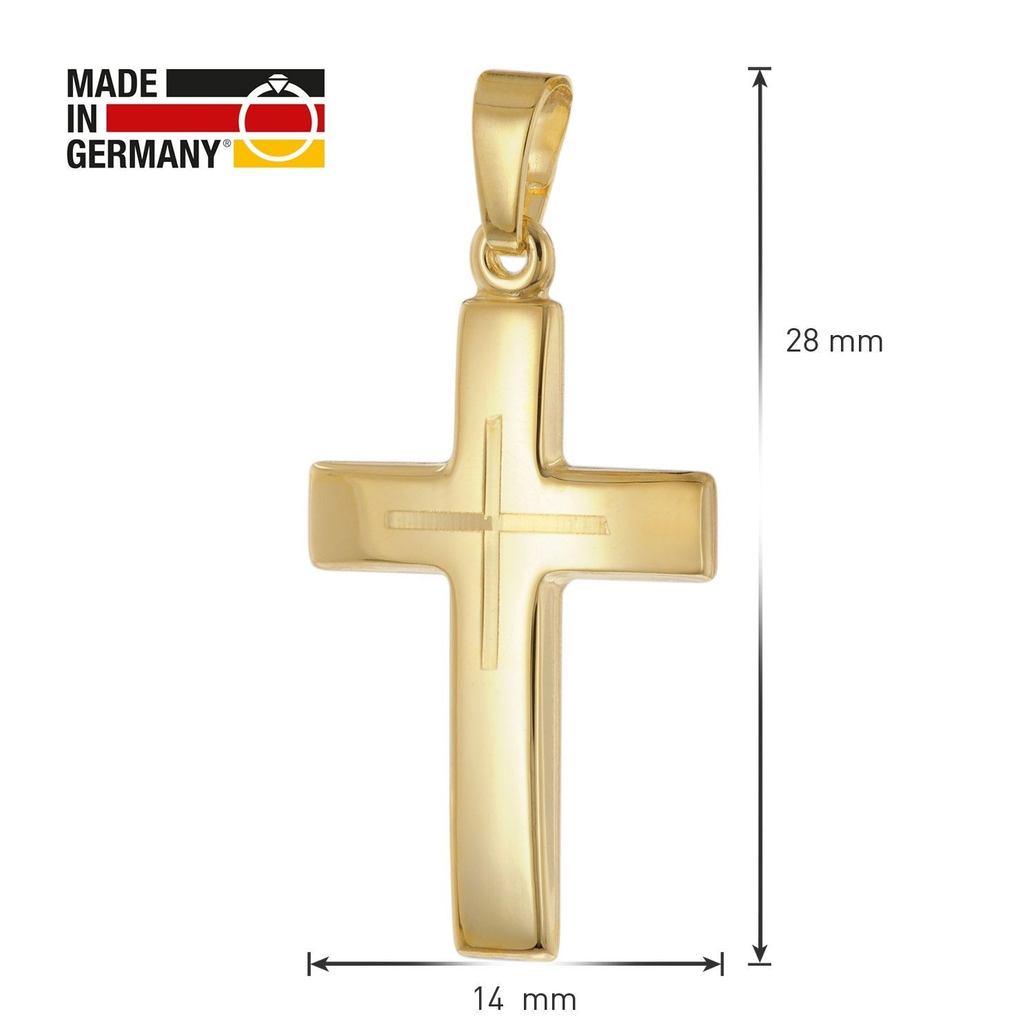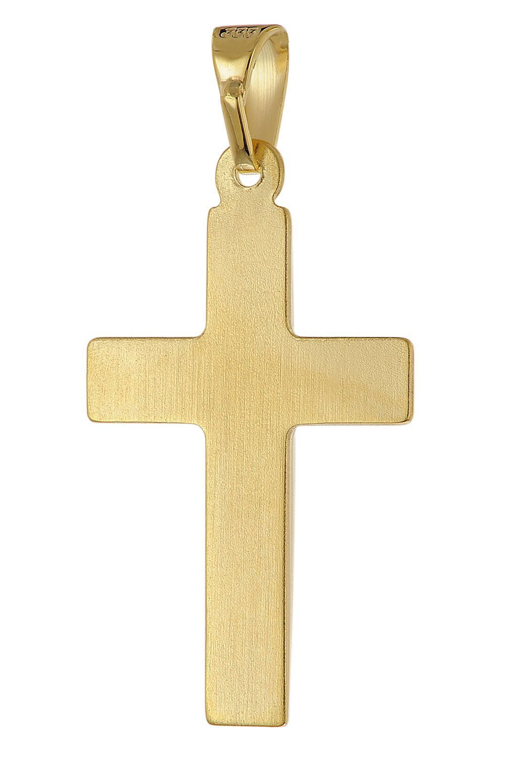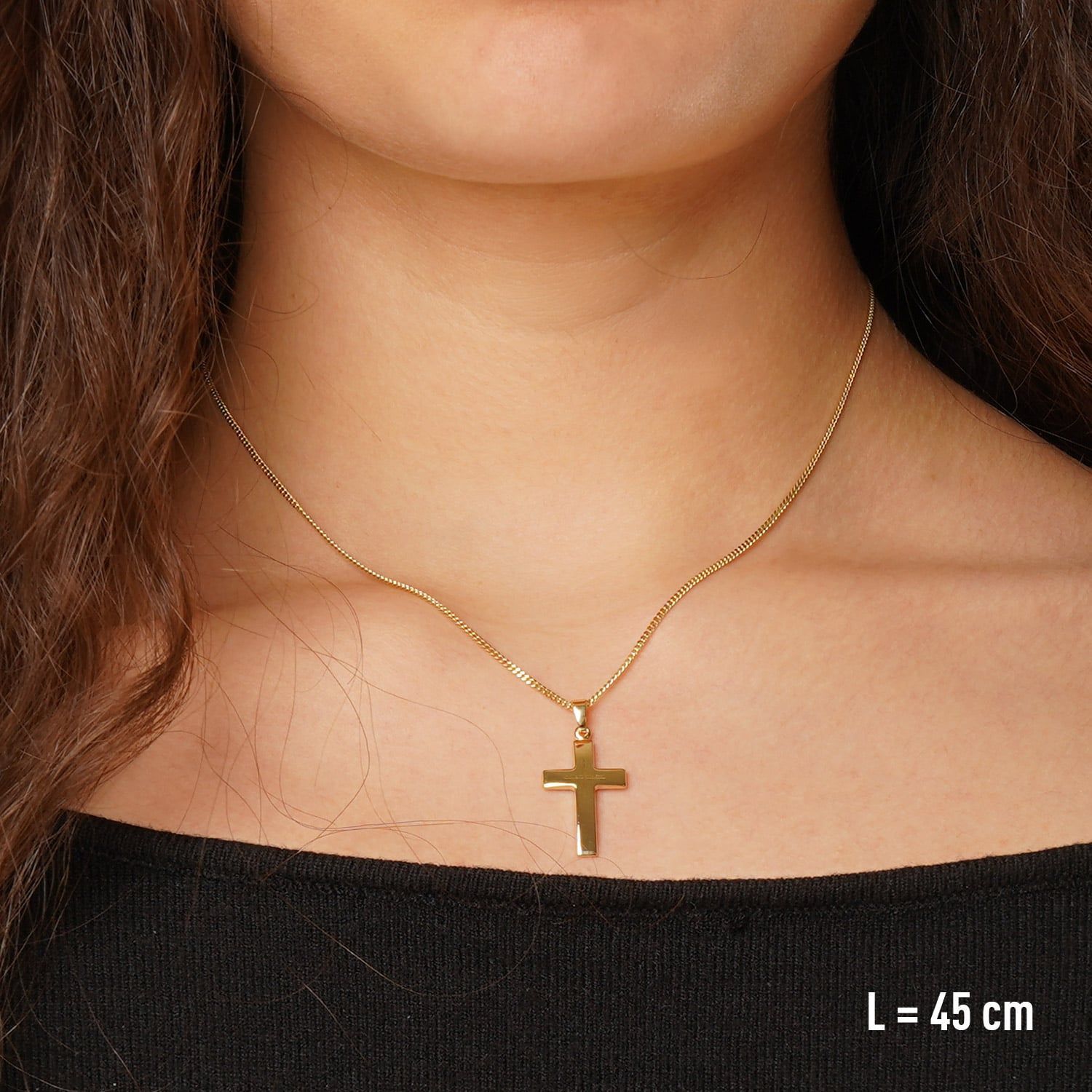 Kreuz-Anhänger in universeller Größe, aus 8 Karat Gelbgold (333), hochglanzpoliert und diamantiert, Größe (inkl. Schlaufe) 28 x 14 x 1,5 mm, stabile Flachpanzerkette aus vergoldetem Sterlingsilber 925, variable Länge 45 cm, mit Zwischenösen bei 42 und 40 cm, Breite 1,4 mm, bequem bedienbarer Karabiner-Verschluss, Made in Germany, Gewicht 3,5 g, Lieferung mit einem Mikrofaser-Pflegetuch