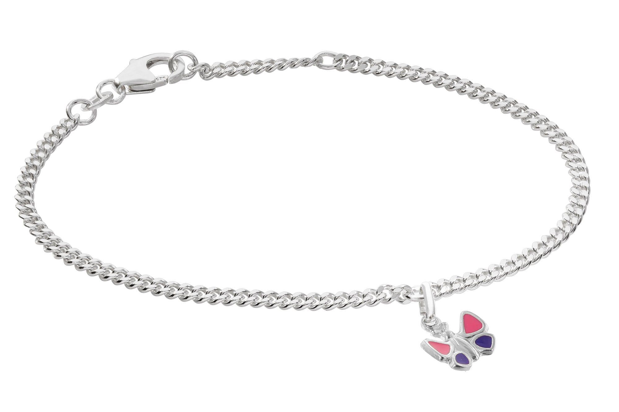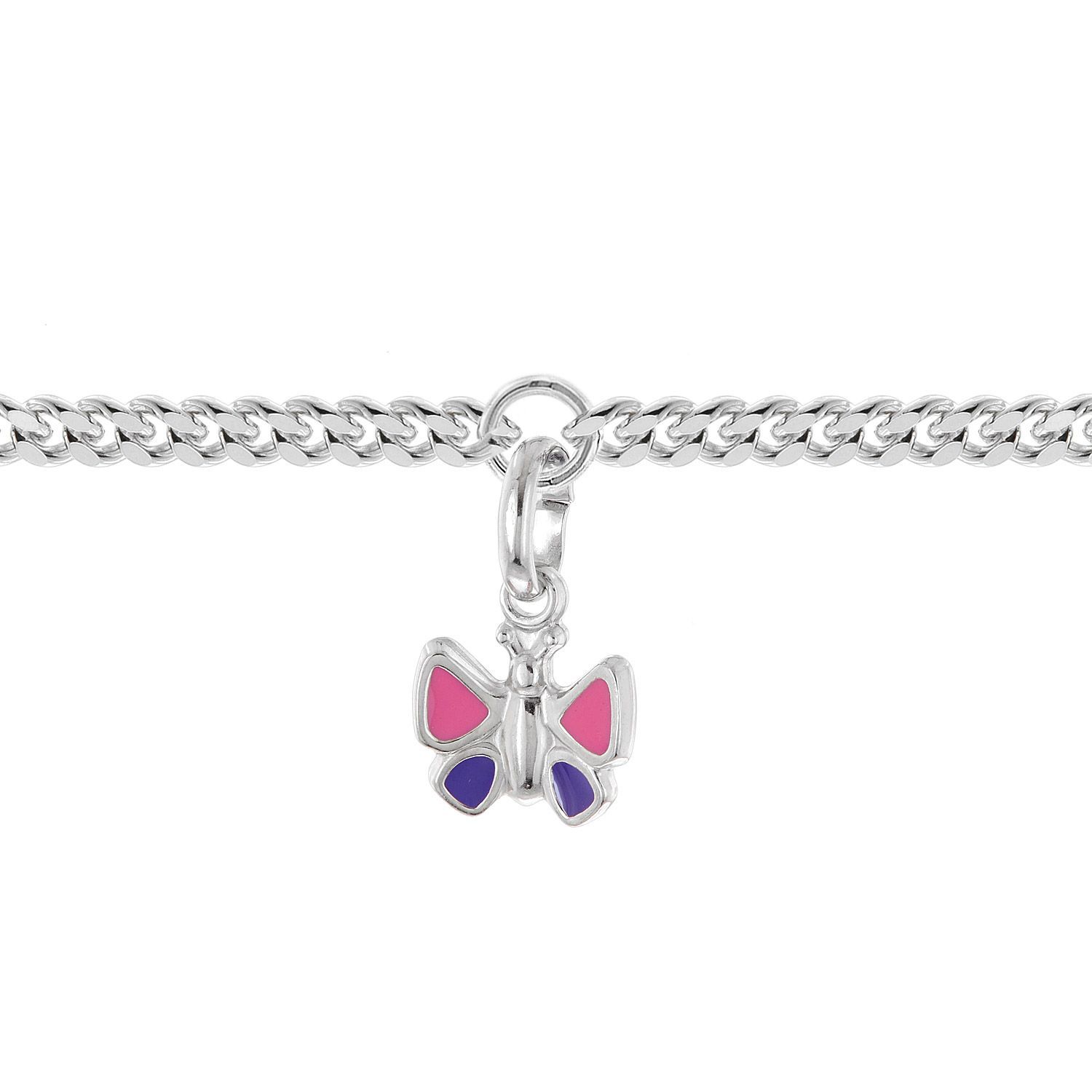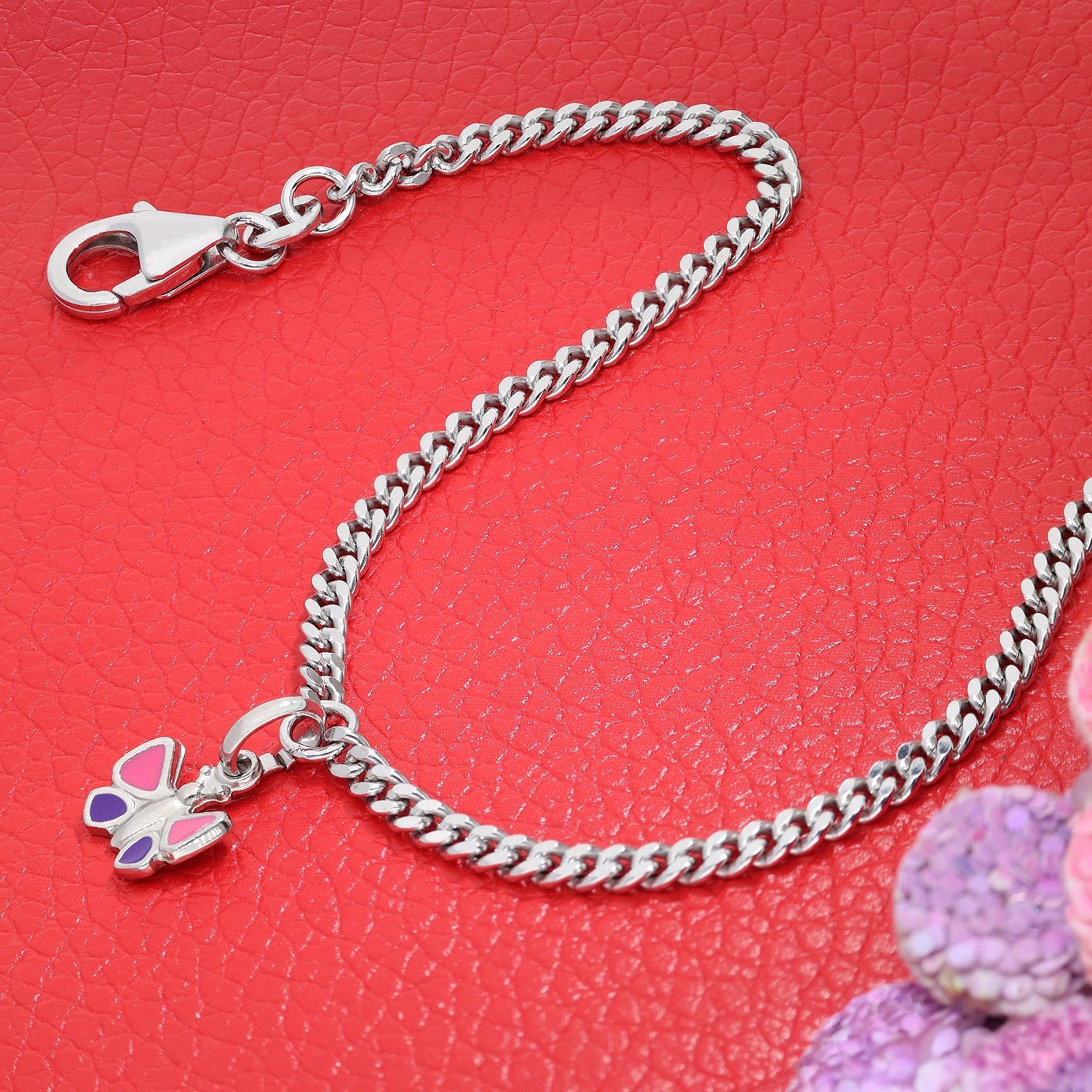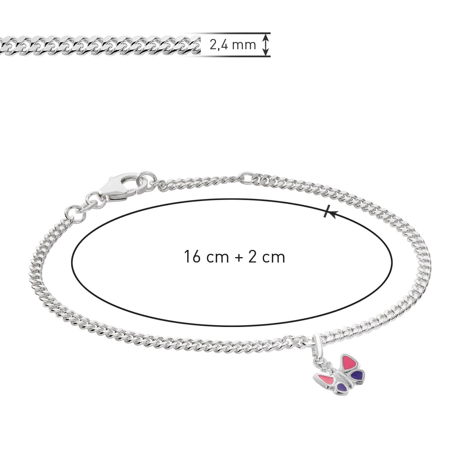 stabiles Armband für Kinder mit eingehängtem Schmetterling-Anhänger, aus rhodiniertem Sterlingsilber 925, die Rhodium-Auflage bietet dauerhaften Anlaufschutz und strahlenden Glanz, anschmiegsames Flachpanzerband, diamantiert und hochglanzpoliert, Länge 18 cm, mit Zwischenöse bei 16 cm, Breite 2,4 mm, einfach bedienbarer Karabinerverschluss, polierter Schmetterling, pink und lila lackiert, Größe (ohne Ösen) 7 x 7 mm, Lieferung mit einem Mikrofaser-Pflegetuch