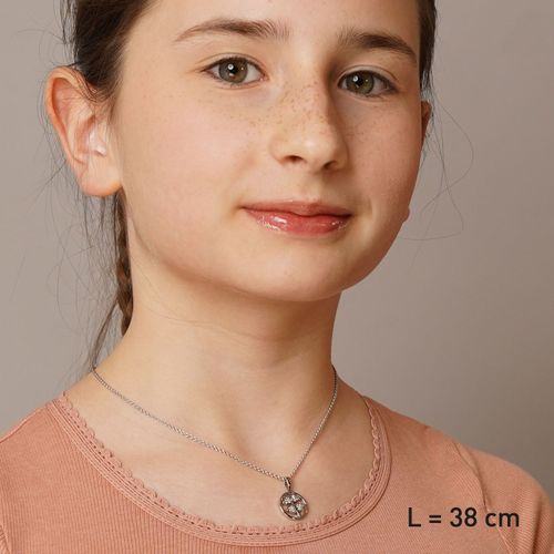 Schmuckset aus Sterlingsilber 925, rhodiniert (anlaufgeschützt), stabiles Rundanker-Kettchen, Länge 38 cm, mit Zwischenöse bei 36 cm, Stärke 1,5 mm, bedienungsfreundlicher Karabiner-Verschluss, eingearbeitetes Plättchen mit trendor Schriftzug und Punzierung 925, glänzender runder Anhänger mit Kleeblatt, 12 klare Zirkonias, Durchmesser (ohne Öse und Schlaufe) 13,5 mm, hochwertig verarbeitet