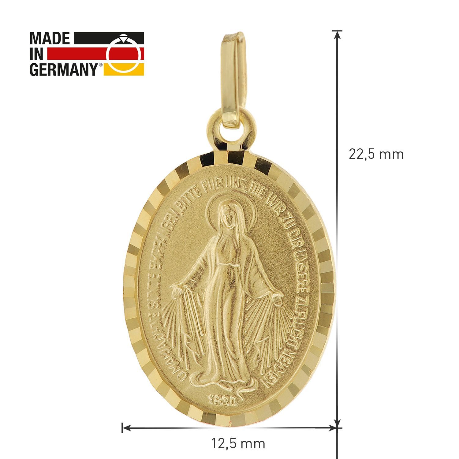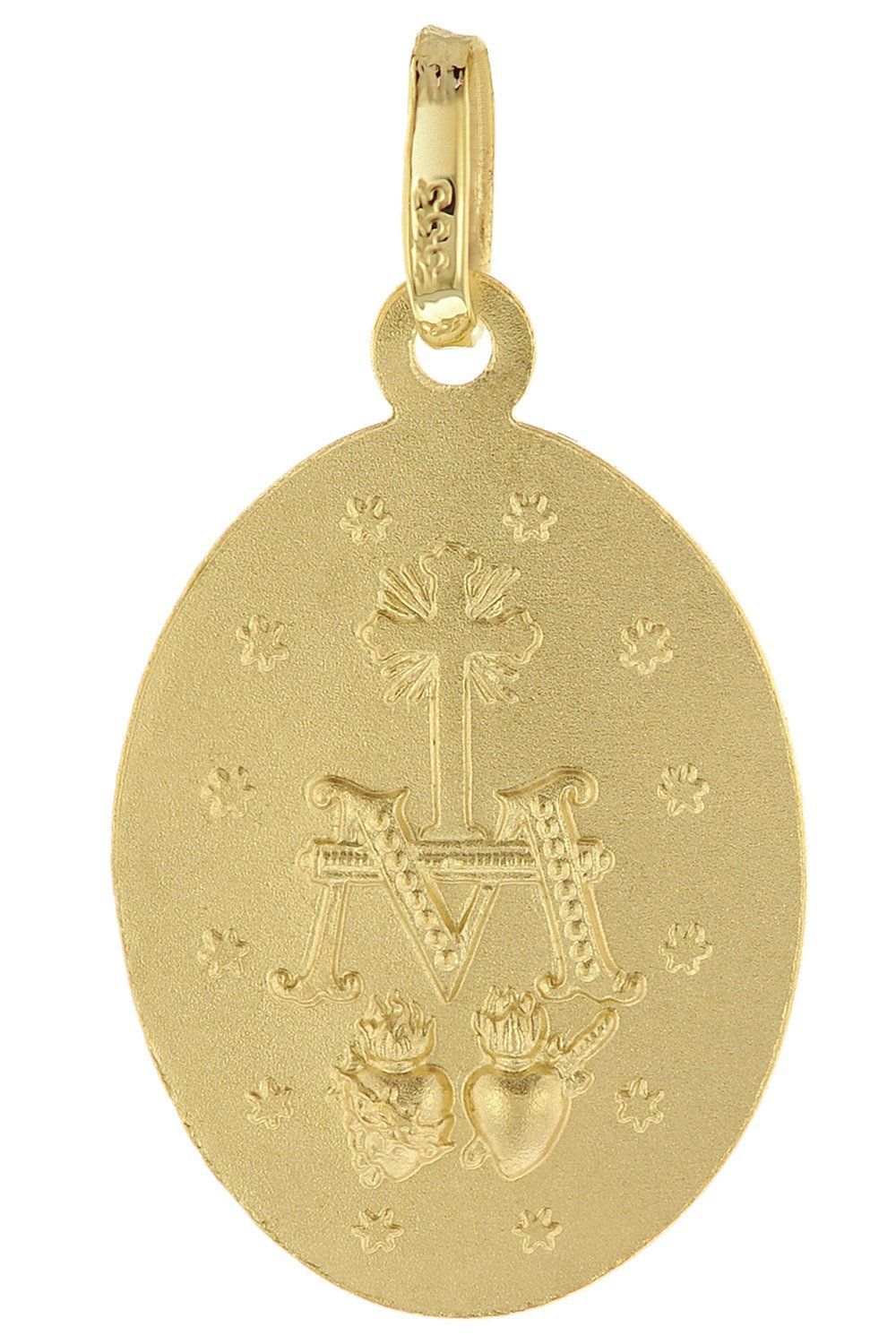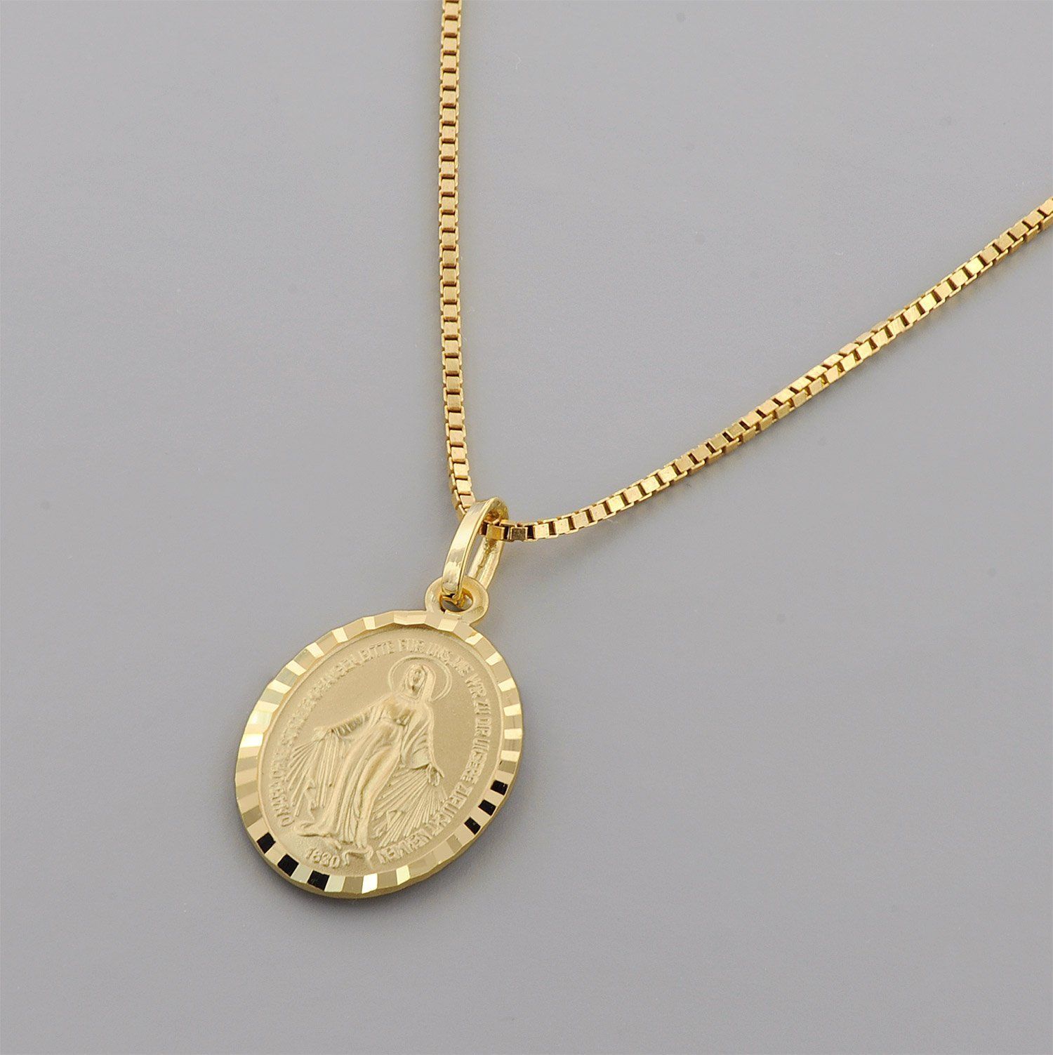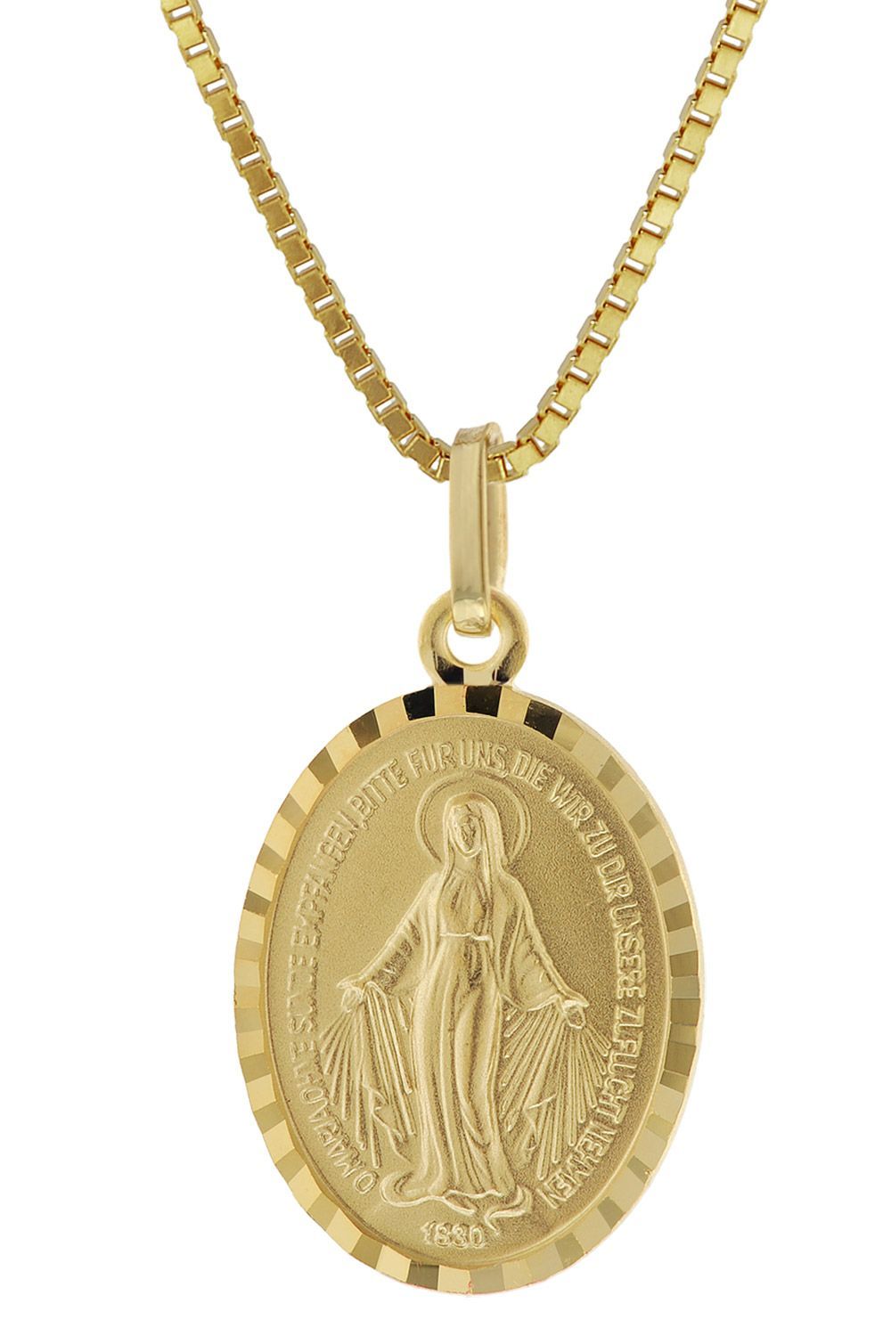 Milagrosa Anhänger Madonna, die sogenannte wundertätige Medaille, Gedenkprägung an die Erscheinung der Gottesmutter Maria im Jahre 1830, ovaler Anhänger aus 8-karätigem Gelbgold 333, diamantgeschnittener Rand, beidseitige Reliefprägung, geprägtes Gebet in deutscher Sprache:, O Maria, ohne Sünde empfangen, bitte für uns, die wir zu Dir unsere Zuflucht nehmen, Größe (ohne Öse und Schlaufe) 18 x 12,5 mm, Venezianer Collierkette, goldplattiertes Sterling Silber 925, Stärke 0,9 mm, Länge 42 cm mit Zw