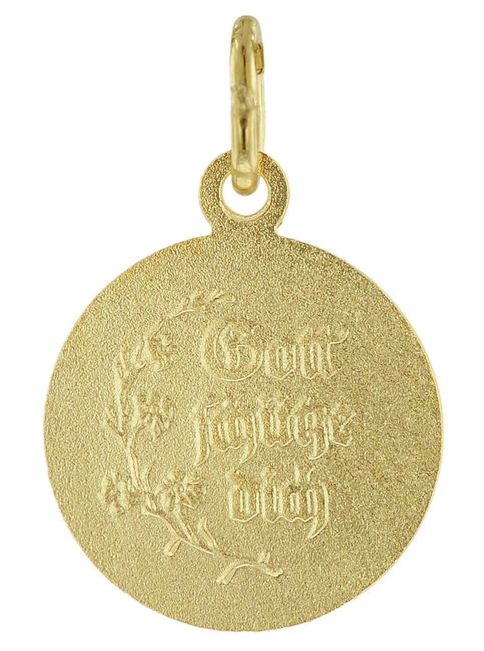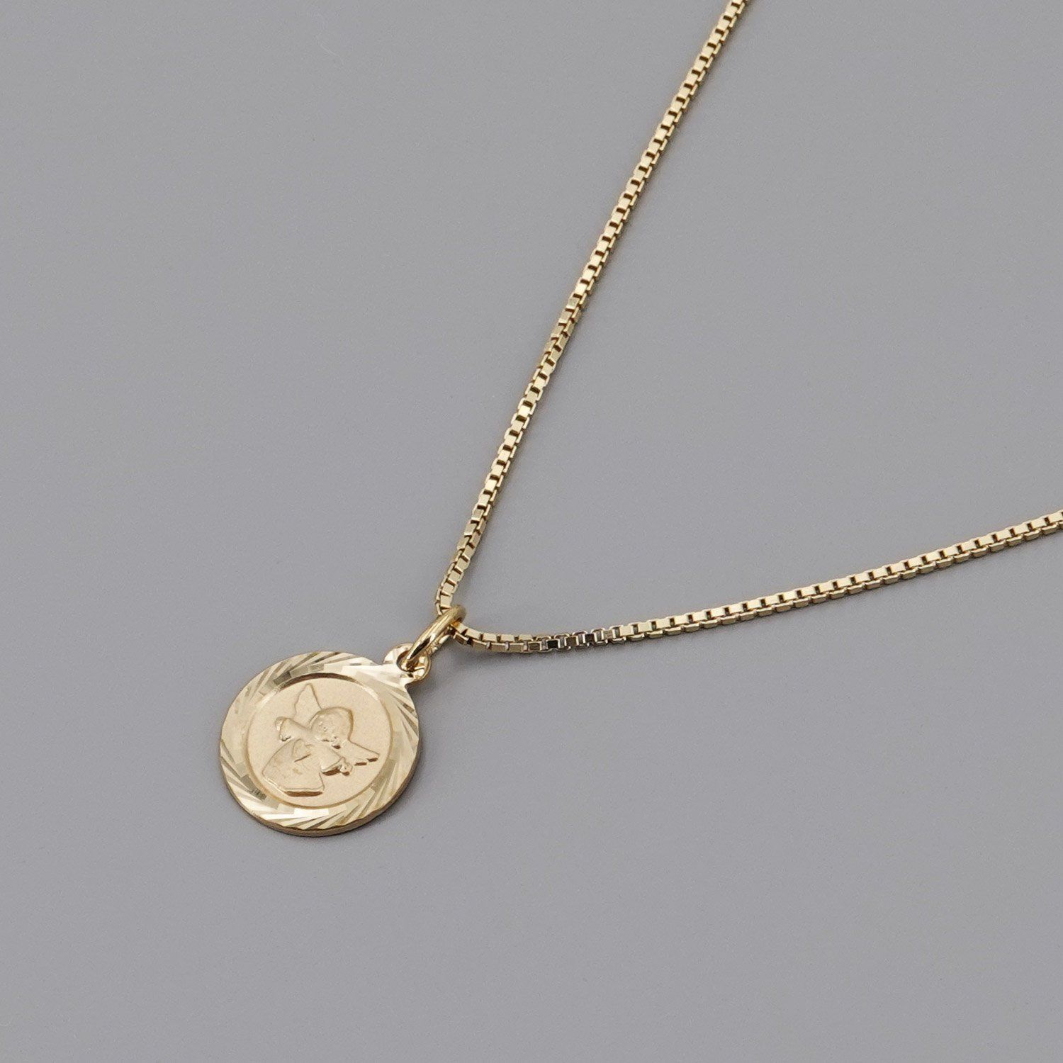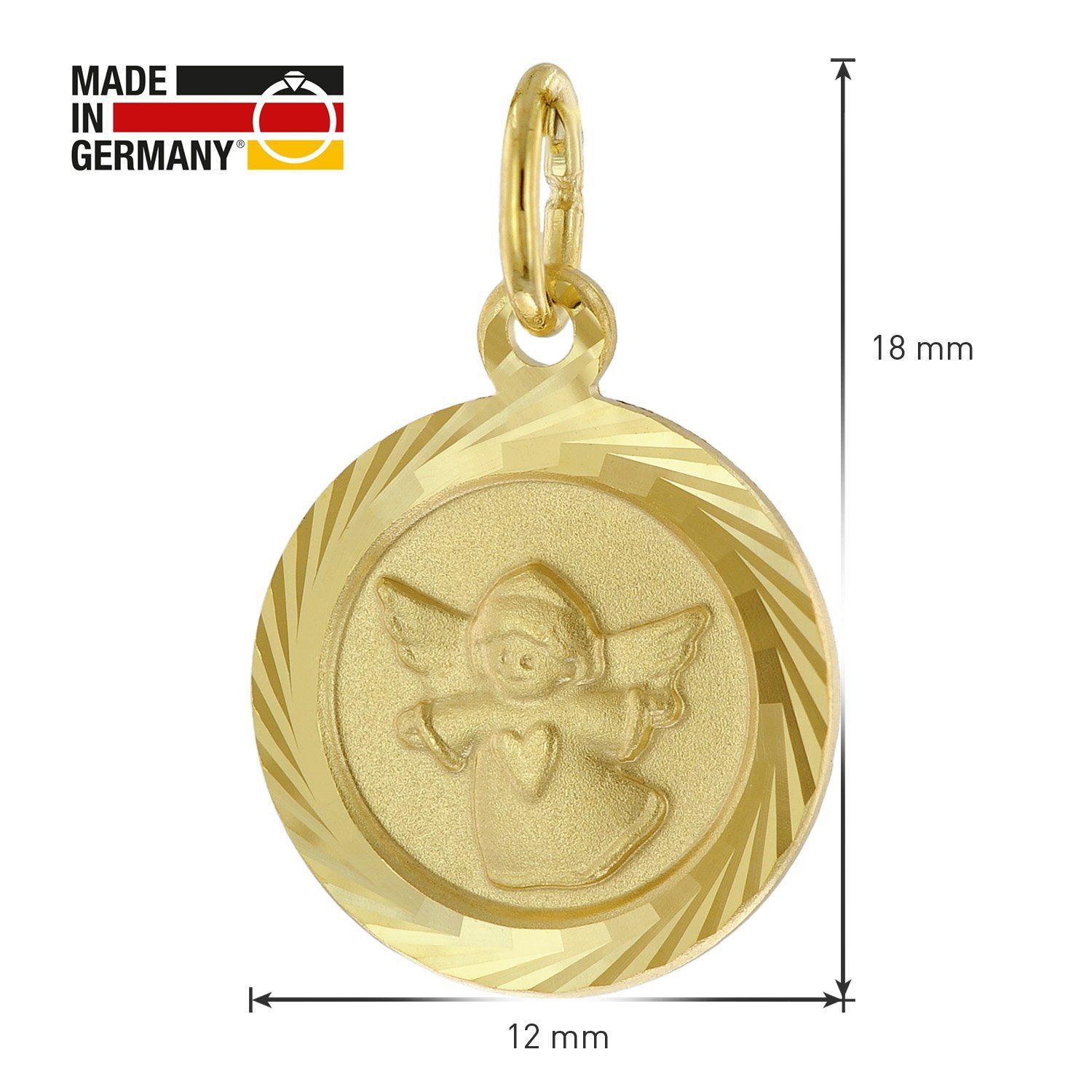 Halsschmuck für Kinder, runder Anhänger aus 8-Karat-Gold 333, Durchmesser 12 mm, seidenmatt mit glänzendem diamantgeschnittenem Rand, schwebender Engel mit Herzchen auf der Brust als Relief-Motiv, Rückseite mit Prägung "Gott schütze Dich", Venezianer Collierkette aus goldplattiertem Sterlingsilber 925, Stärke 0,9 mm, Länge 40 cm, mit Zwischenöse auch 38 cm lang tragbar, Federring-Verschluss, Made in Germany, Lieferung inklusive einem Mikrofaser-Pflegetuch