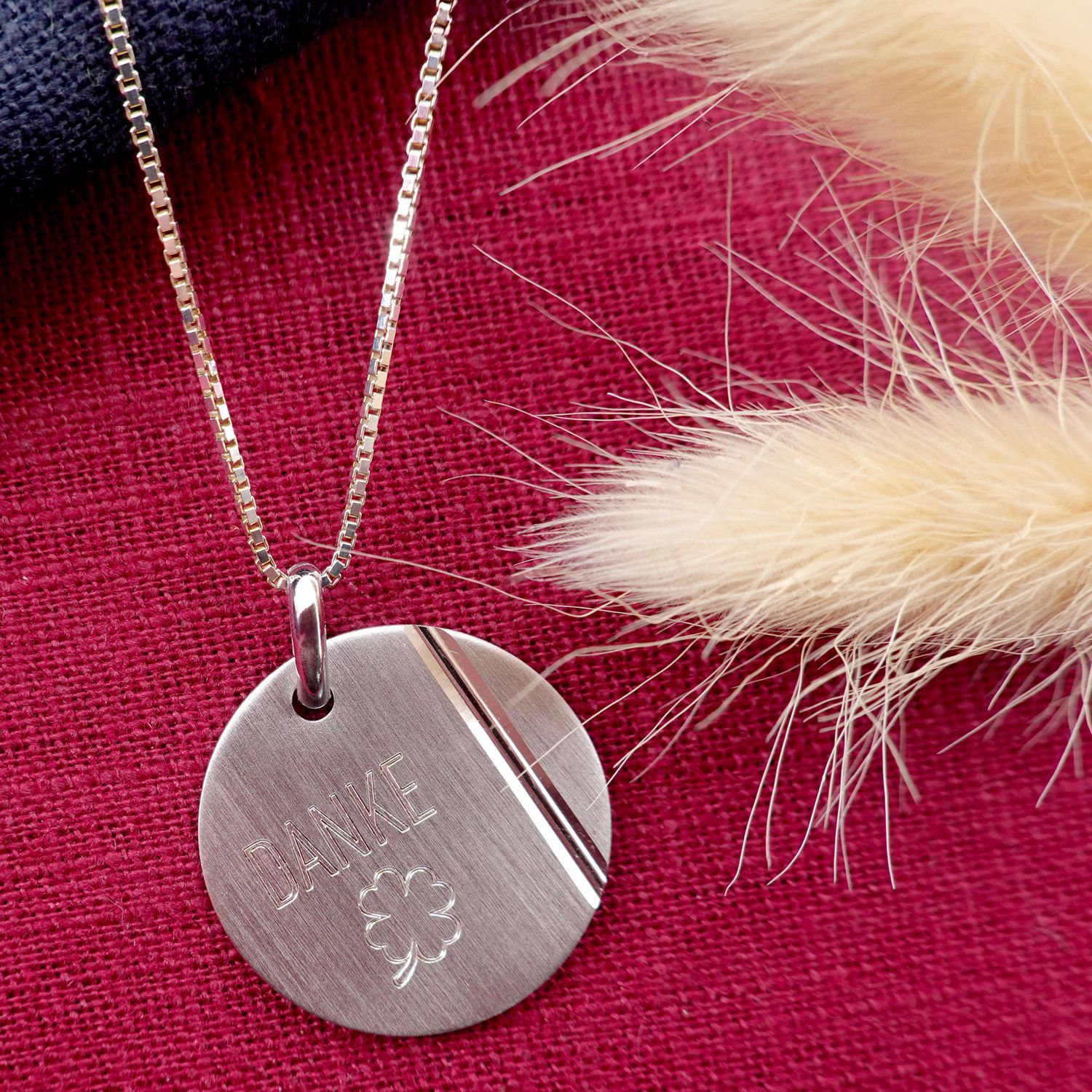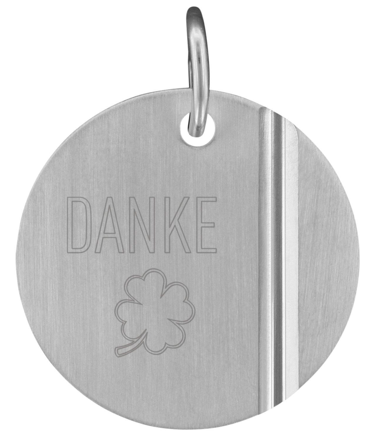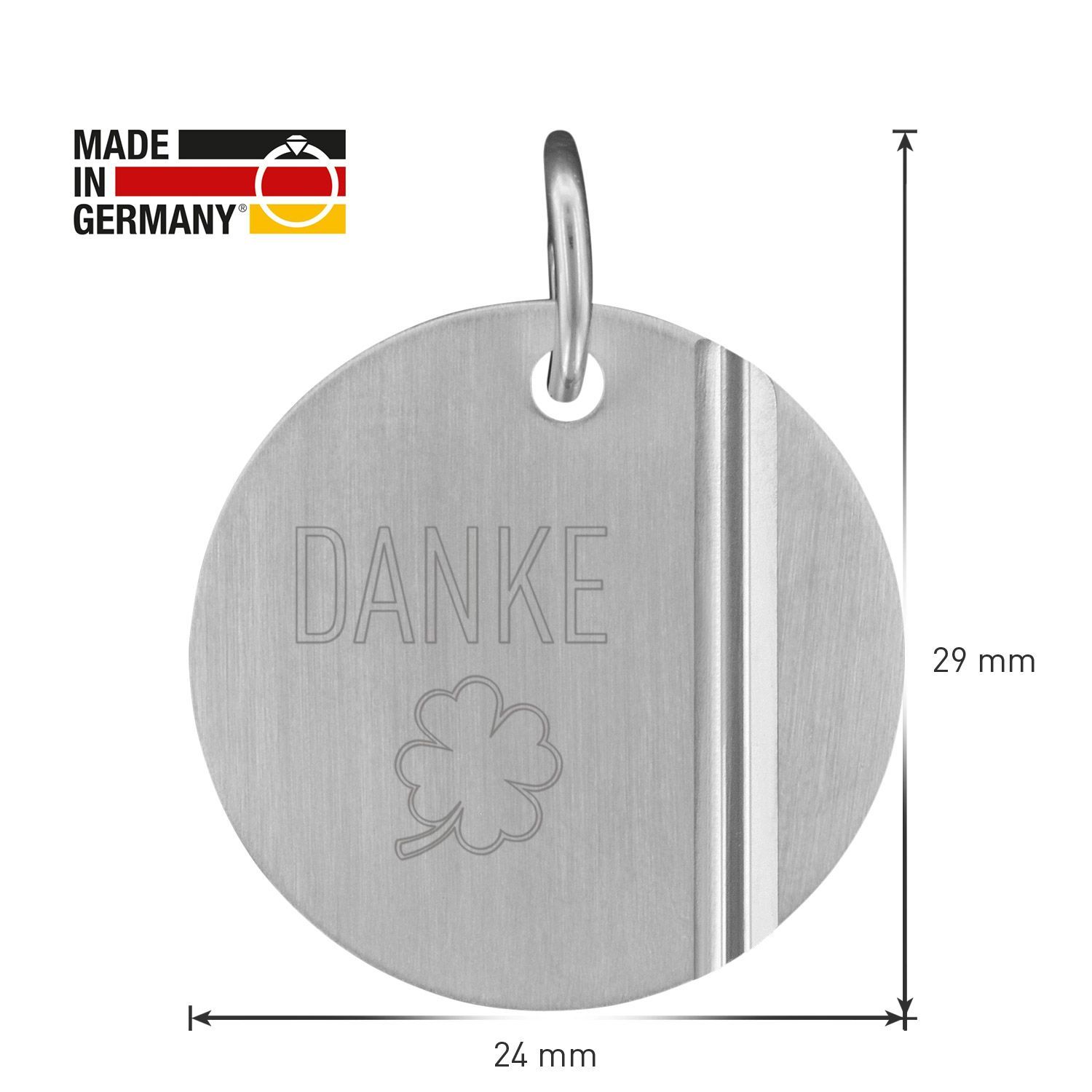 geeignet als kleines Dankeschön-Geschenk, hübsche Halskette für Damen und Herren, auch als Partnerschmuck geeignet, aus Sterlingsilber 925, anlaufgeschützt rhodiniert, Veneziakette, Stärke 0,9 mm, Federring-Verschluss, runder Gravur-Anhänger, persönliche Botschaft als Gravur: DANKE, seidenmatte Frontfläche mit diamantiertem Dekor, satinerte Rückseite, Durchmesser 24 mm, Made in Germany, Lieferung inklusive Mikrofaser-Pflegetuch