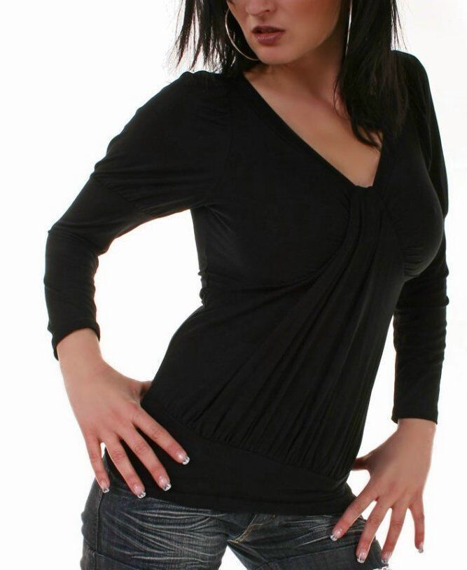 Trendy Damen Falten Effekt V Ausschnitt Langarm Shirt TOP 34/36/38 schwarz NEU
