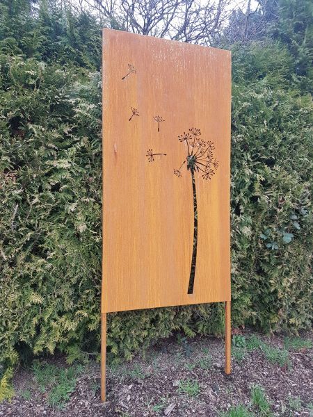 Trennwand Sichtschutzwand Schmuckblech m. Bodenanker Pusteblume 183cm Edelrost