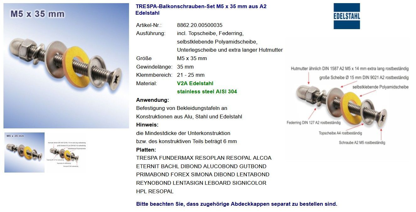 TRESPA-Balkonschrauben-Set M5 x 35 mm aus A2 TRESPA Edelstahl V2A Schrauben