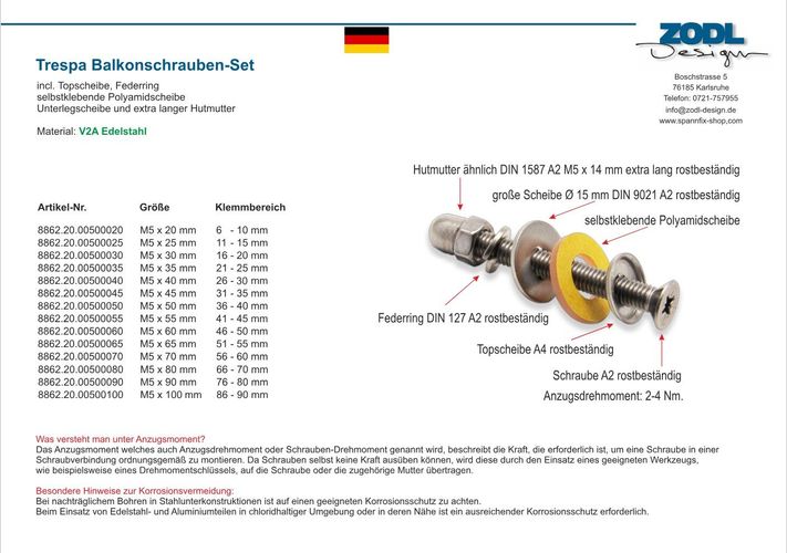 Trespa-Balkonschrauben-Set M5 x 35 aus V2A Edelstahl TRESPA-Balkonschrauben-Set M5 x 35 mm aus A2 Edelstahl Artikel-Nr.: 8862.20.00500035 Ausführung: incl. Topscheibe, Federring, selbstklebende Polyamidscheibe, Unterlegscheibe und extra langer Hutmutter Größe M5 x 35 mm Gewindelänge: 35 mm Klemmbere