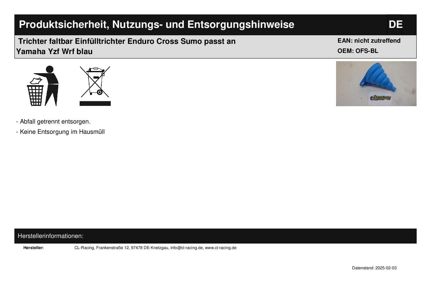 Trichter faltbar Einfülltrichter Enduro Cross Sumo passt an Yamaha Yzf Wrf blau In dieser Auktion gibt es folgenden Artikel zu kaufen: faltbarer Trichter (siehe Foto) technische Daten: Einfülldurchmesser: ca. 80 mm Außendurchmesser am Auslauf: ca. 13,5 mm Höhe in eingefaltetem Zustand: ca. 25 mm Lie