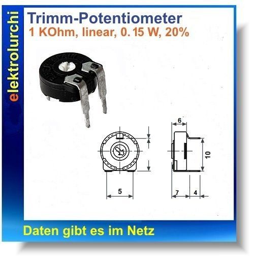 Trimmer 1K Ohm, liegend, linear, 0.15 W, 220°, l=10mm, Piher, 5St