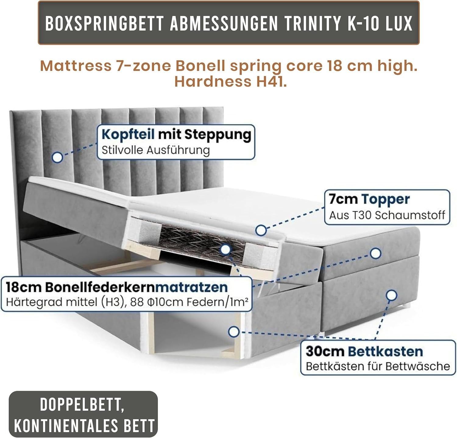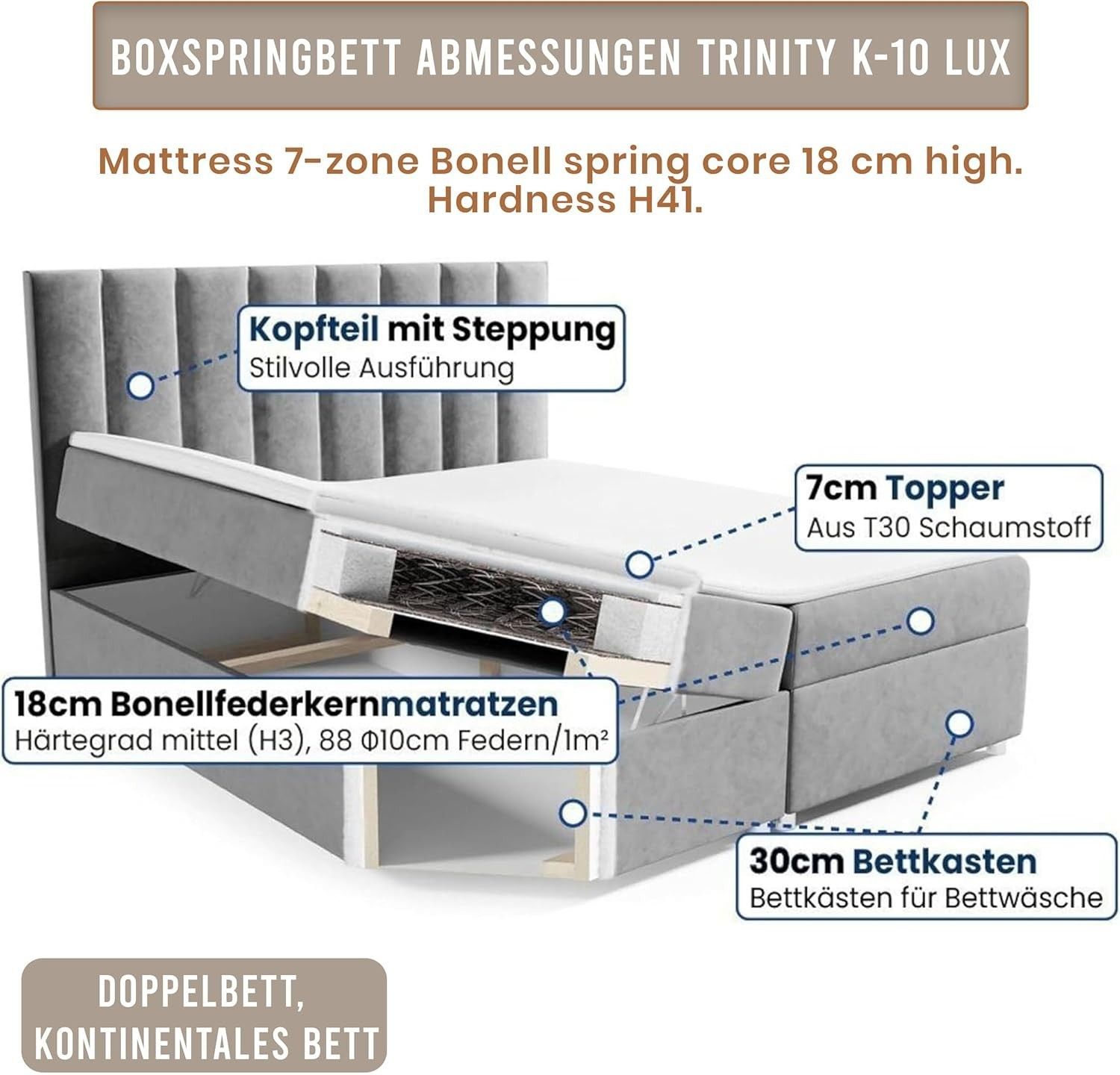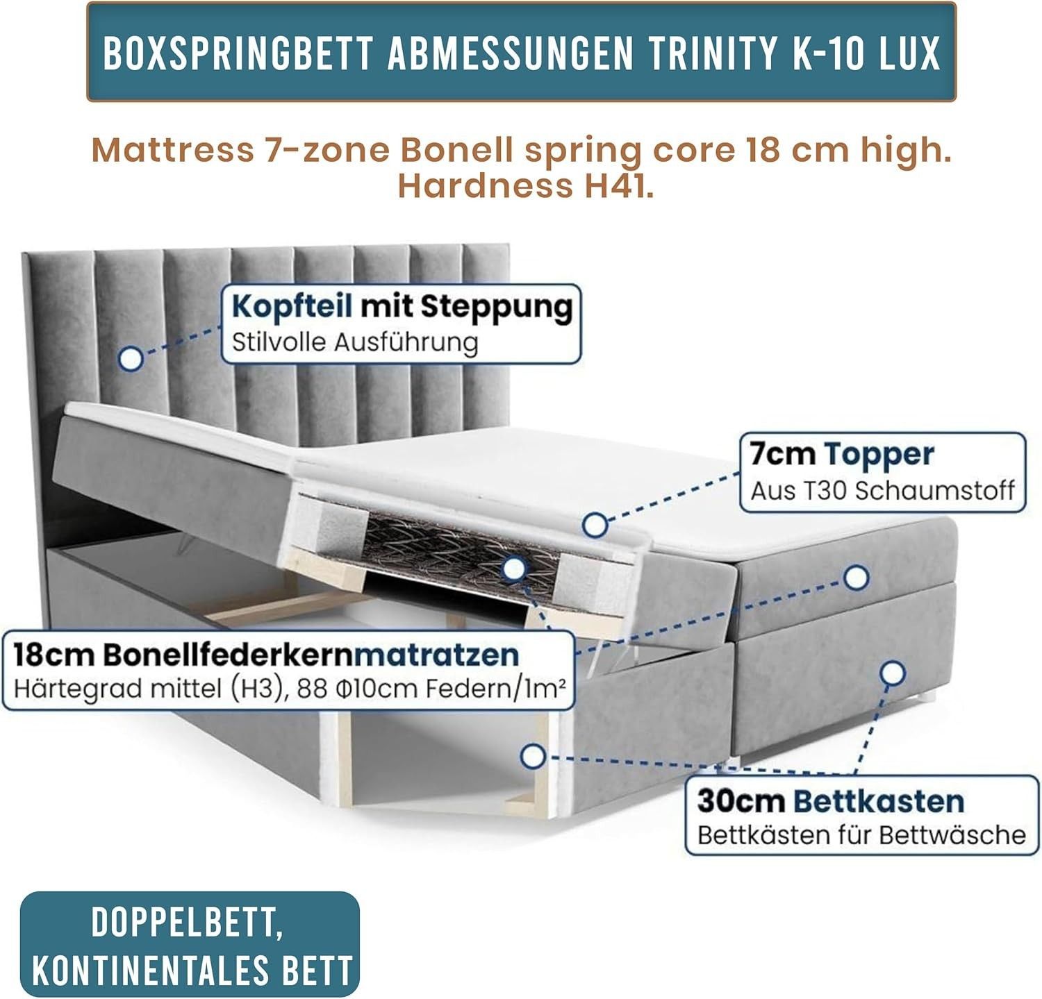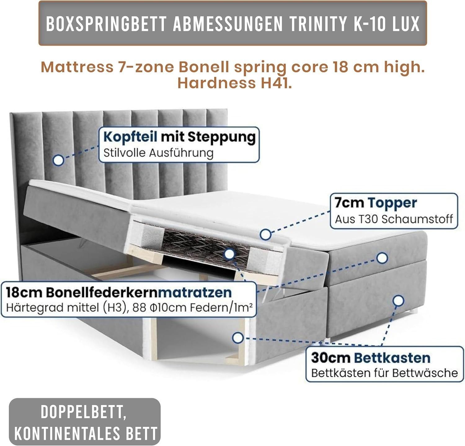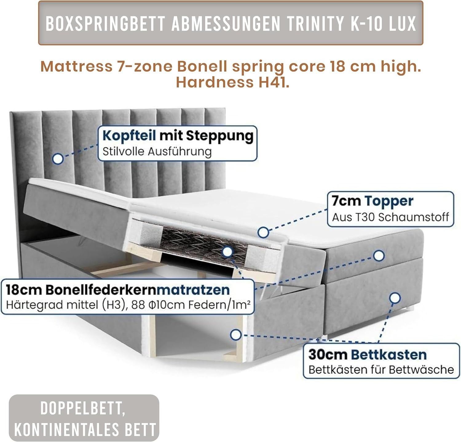 Trinity K-10 Boxspringbett mit Stauraum & 7 cm Topper, Bonellfederkern ,140-200x200cm
