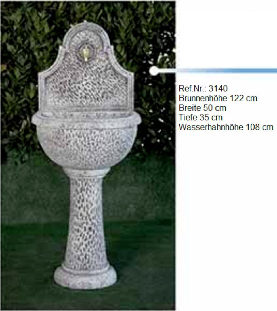 Ein wunderschöner Trinkbrunnen mit einer Vorrichtung für einen Wasserauslauf, bestehend aus witterungs- und frostbeständigem Weißstein. Er kann direkt an einen Anschluss für Trinkwasser angebracht werden oder mit einer Pumpe, die das Wasser immer wieder von unten zum oberen Auslauf pumpt. Der Aufbau ist relativ leicht zu handhaben, denn der Brunnen besteht aus mehrere Teile die zusammengesetzt werden.