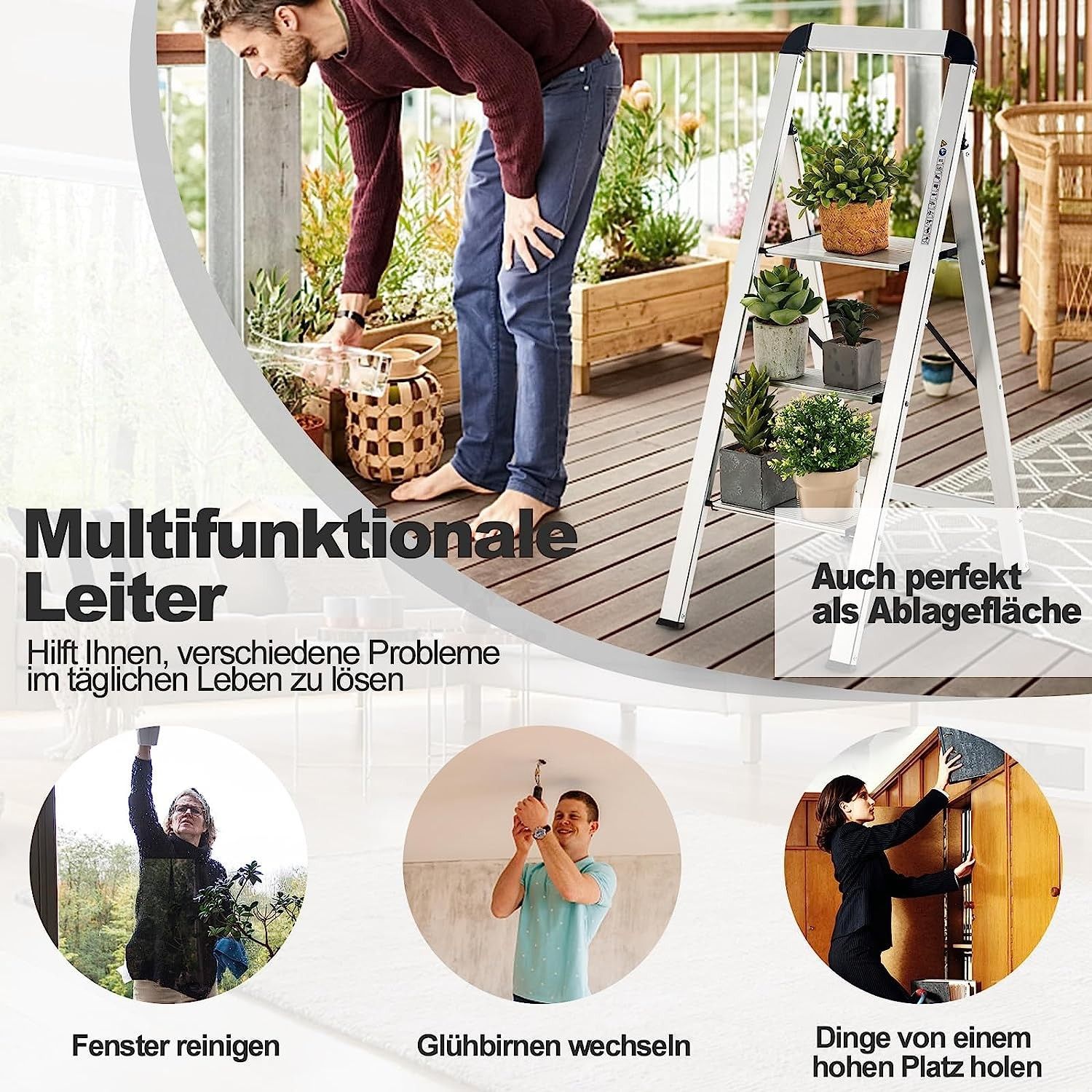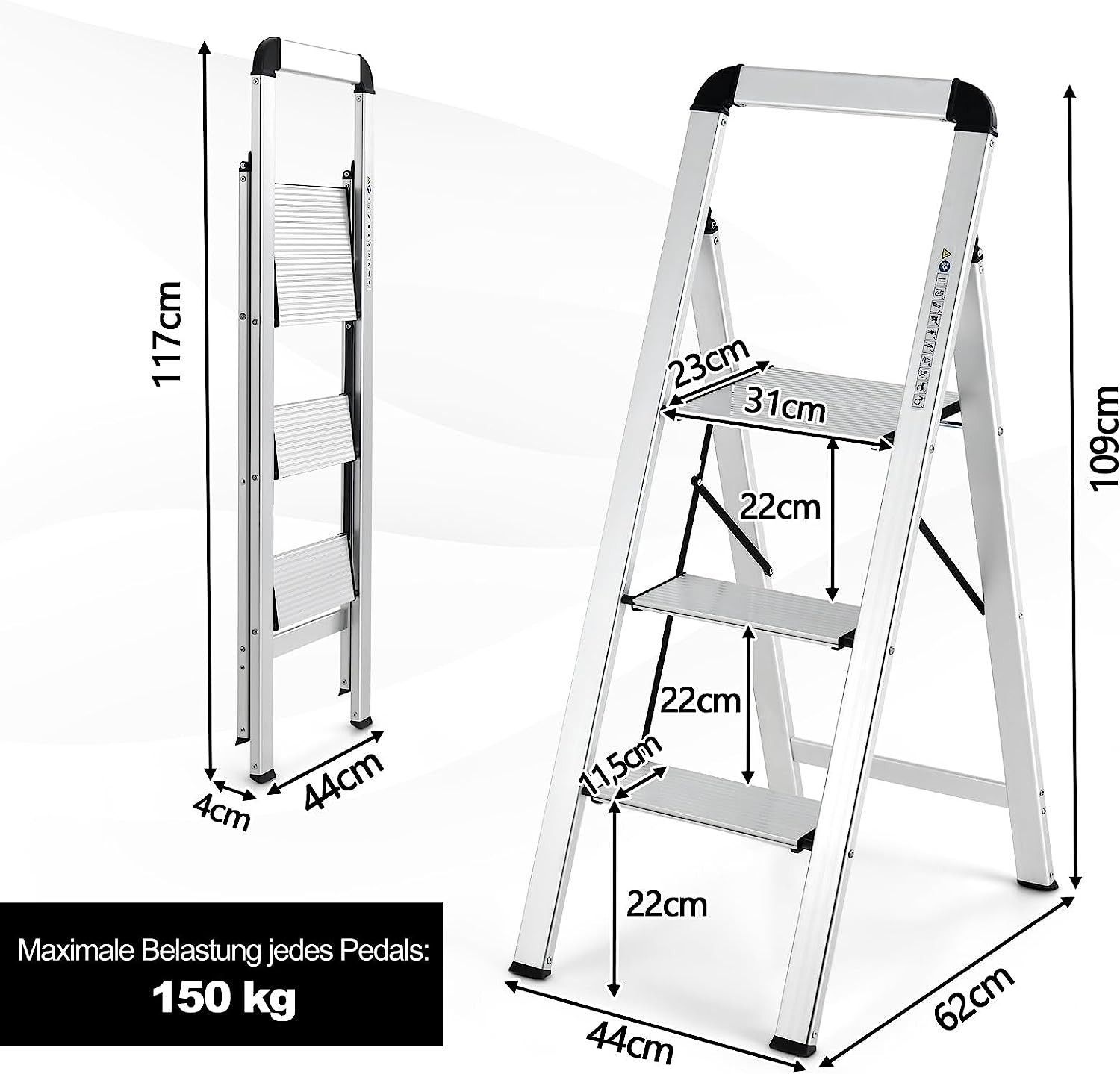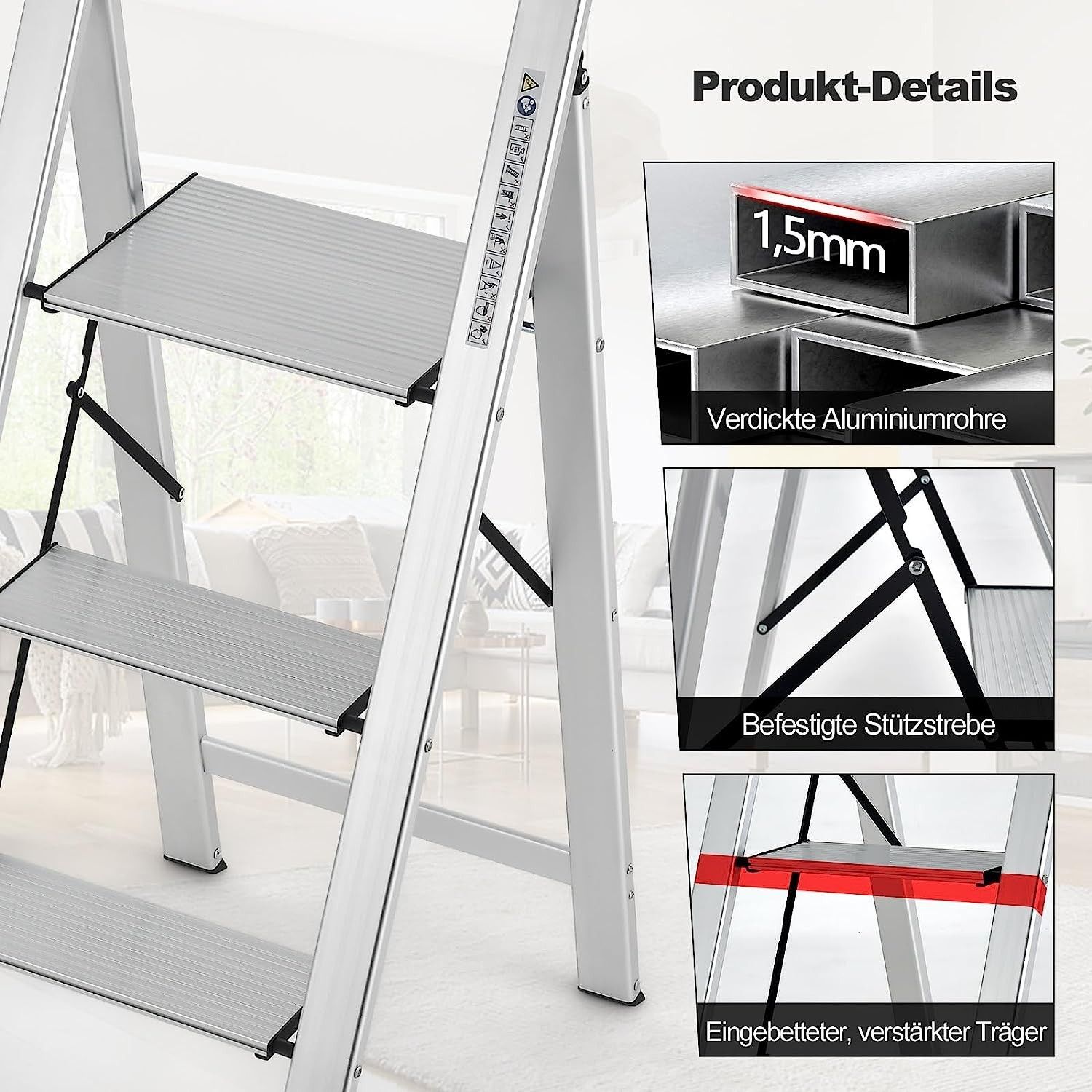 Trittleiter 3 Stufen Stehleiter, Aluminium Klappleiter bis 150 kg, Haushaltsleiter
