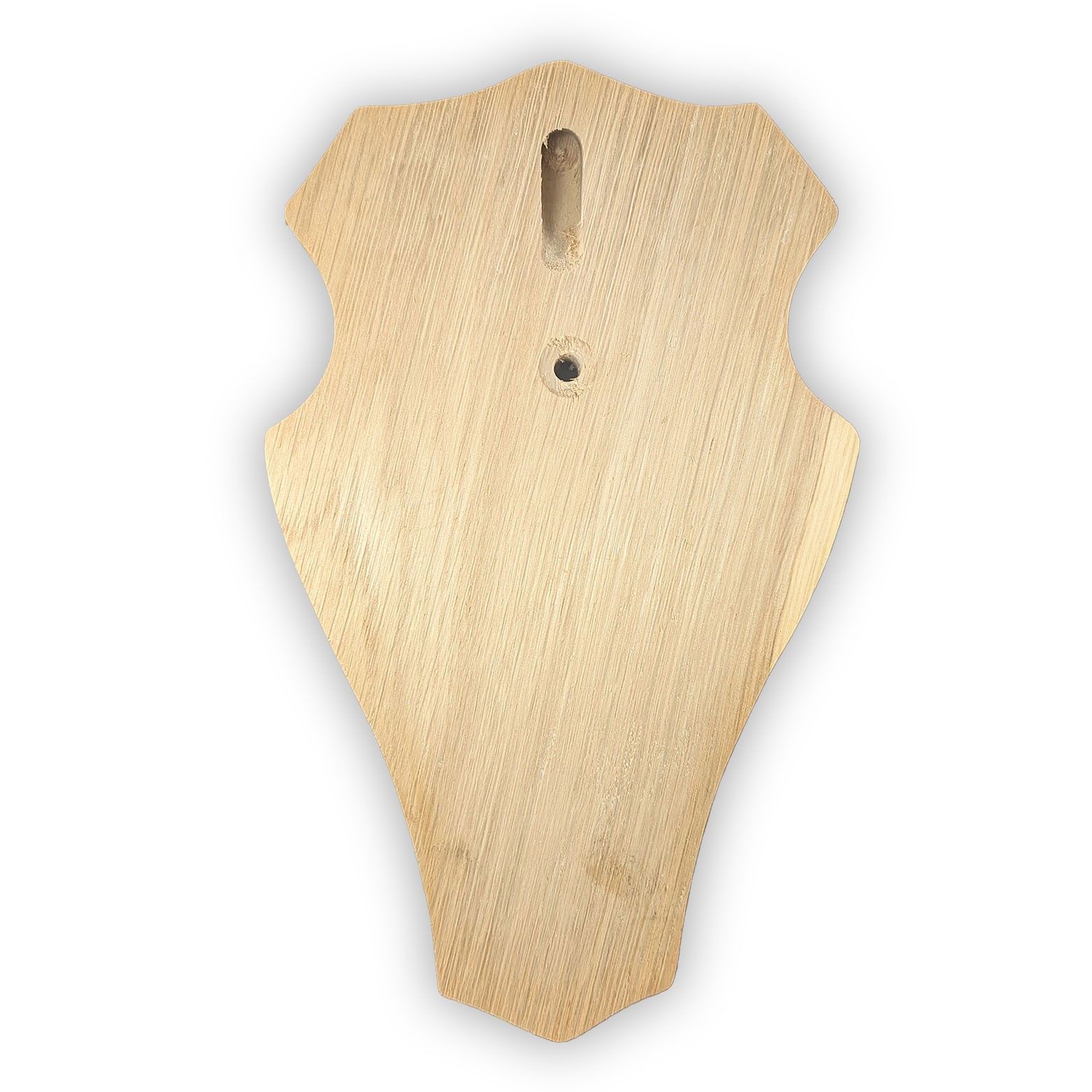 Trophäenschild Geweihbrett für Rehbock. Jagdschild Eiche hell klein. - Material: Eiche - Arbeitsfläche: 18 cm Länge und 10,4 cm Breite - Gesamtmaße L B H: 19 cm x 11,5 cm x 1,7 cm - Natürlicher Look mit transparenter Versiegelung Rückseite: Bohrung für Gehörnklammer Aufhängevorrichtung und Daten Auf