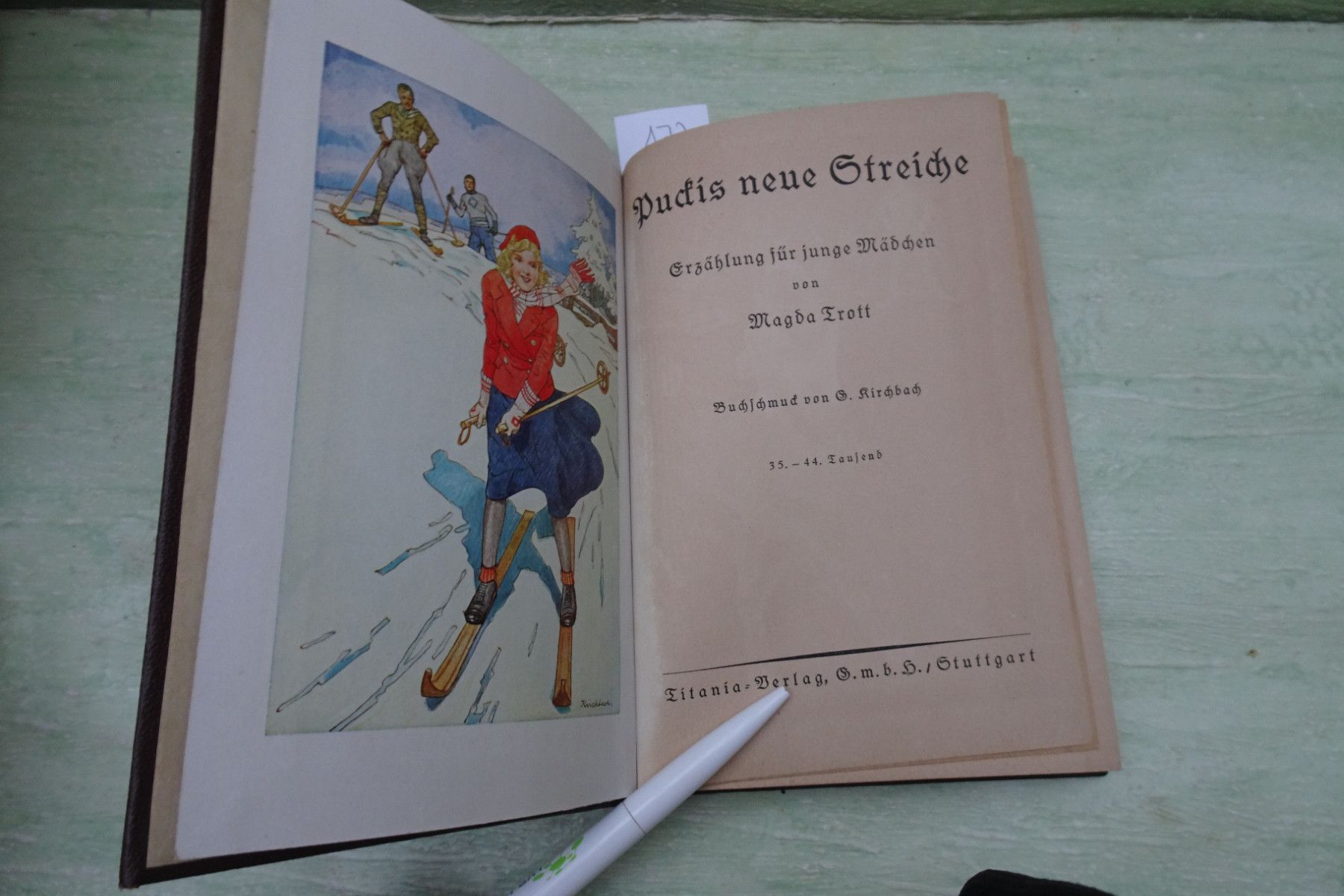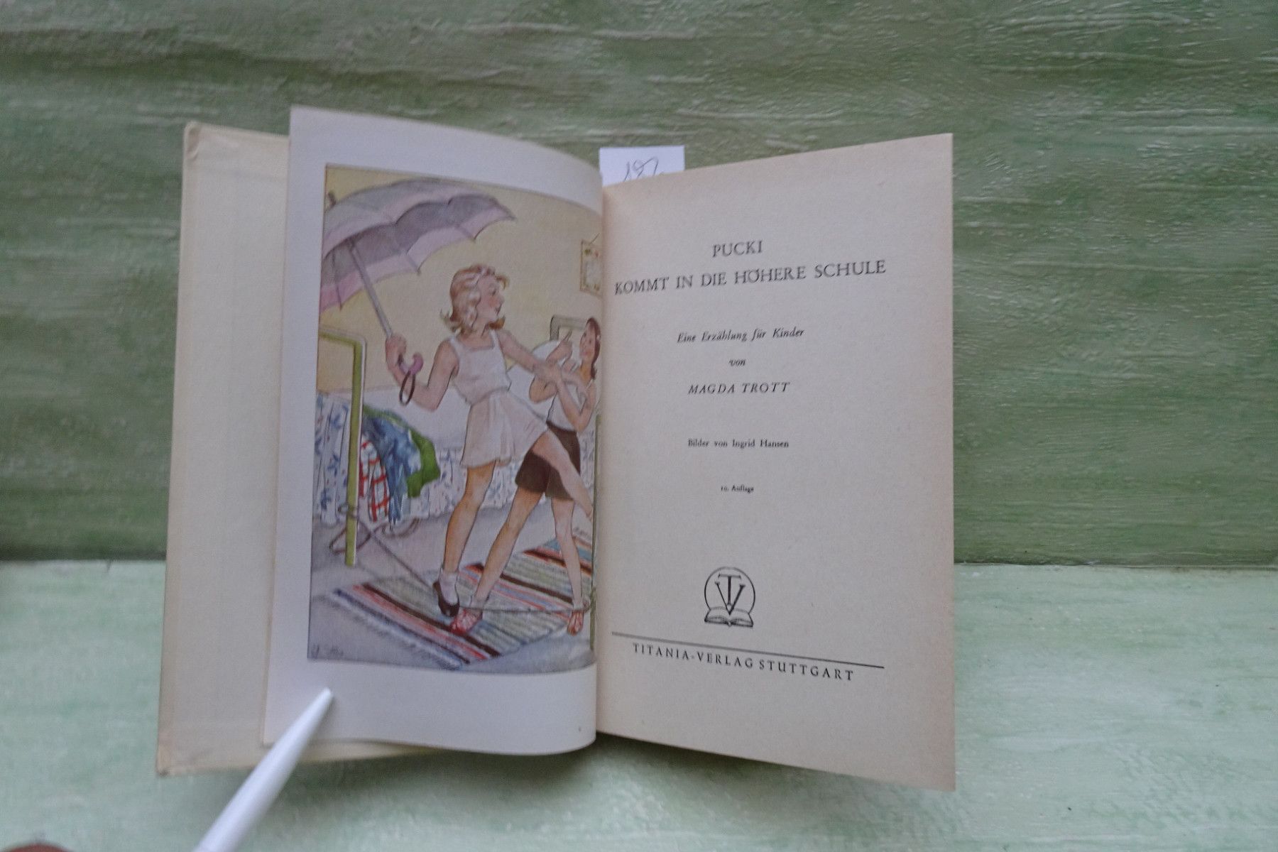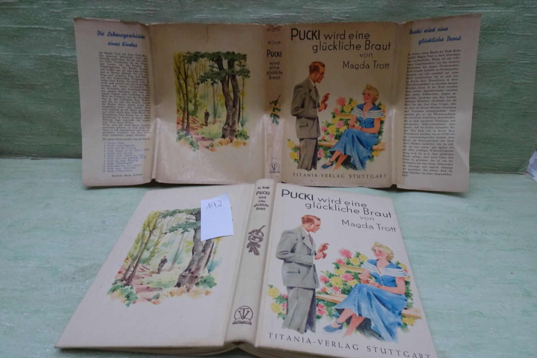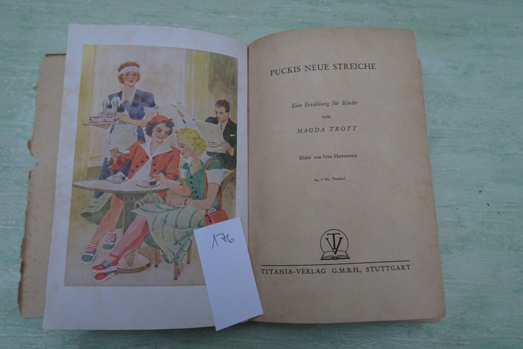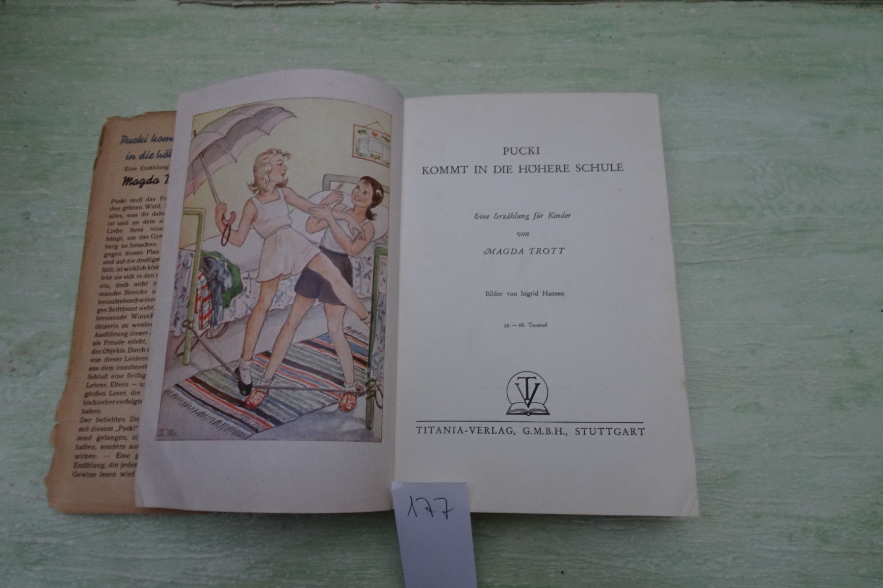 Jugend- & Kinderbücher ... Erinnerungen ..... Magda Trott Pucki -Auswahl- Titania Verlag Stuttgart . . alte Pucki Bände , alle mit Vollbild vorne . 172: Puckis neue Streiche Buchschmuck G Kirchbach Frakturschrift , 35.-44. Tausend , Fadenbindung Titania Verlag GmbH , Stuttgart Zustand : gut . 17
