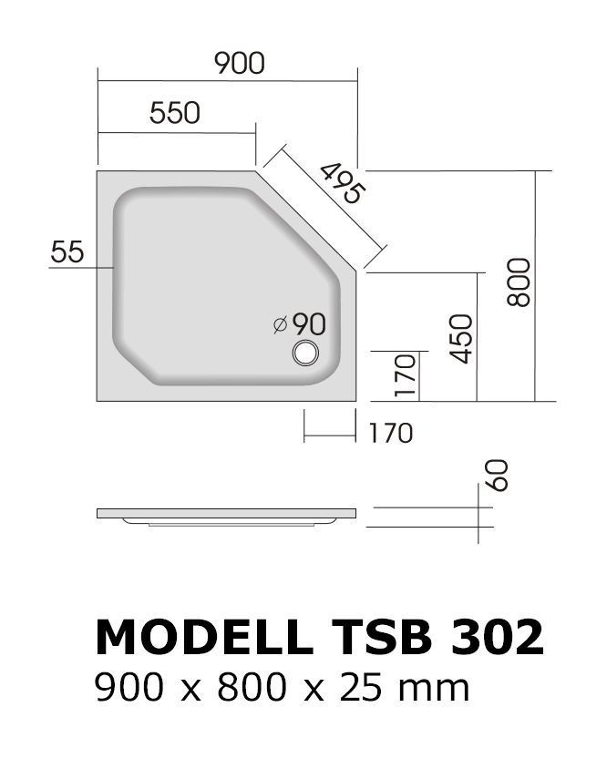tsb302 Duschwanne 90x80 Duschwannen 90x80 Fünfeck 2,5, Flanke 45