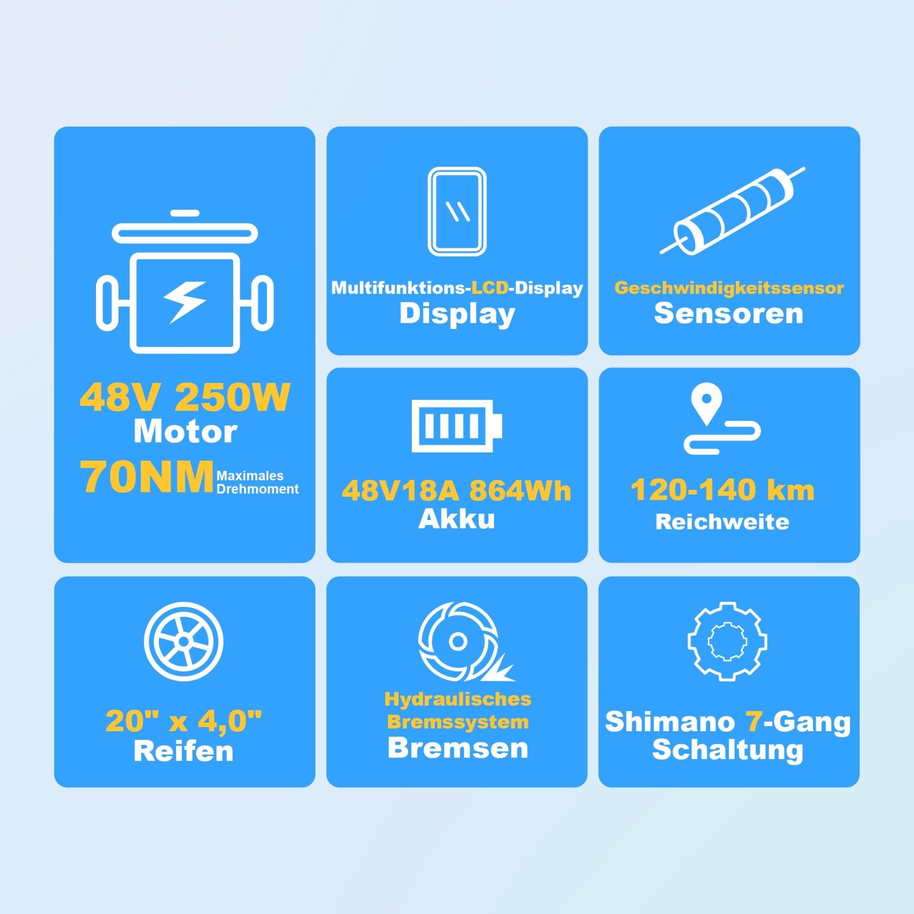 48V 18Ah Akku, 70 N·m Drehmoment, 120–140 km Reichweite, 7-Gang, 20"×4,0" Reifen