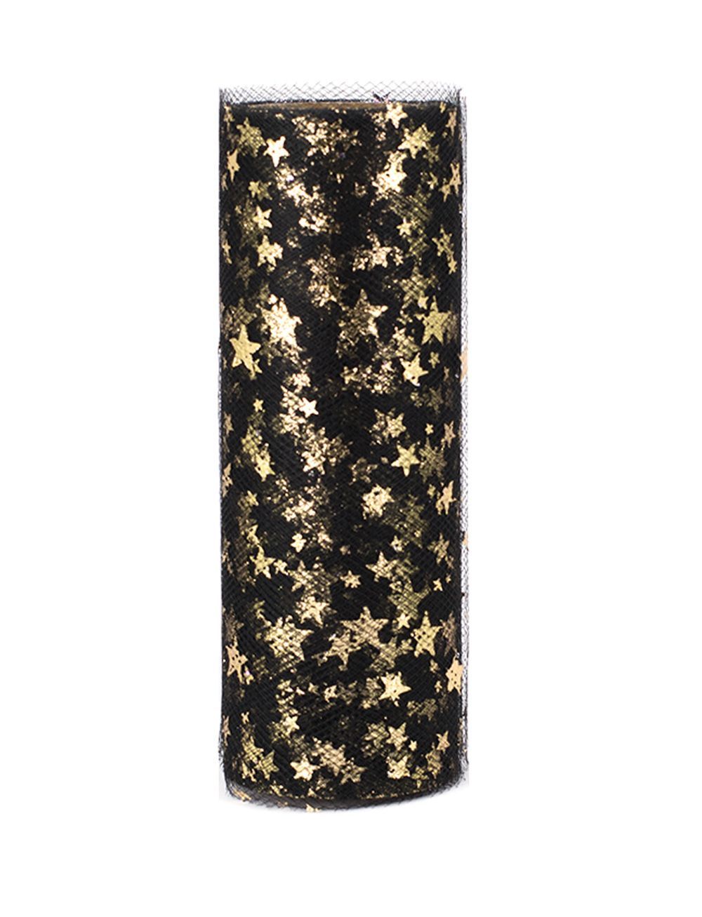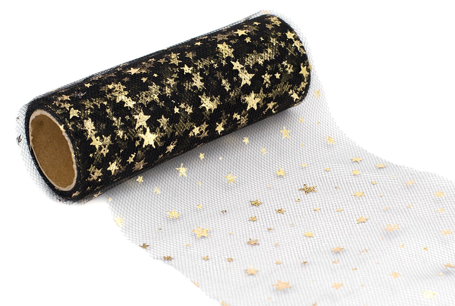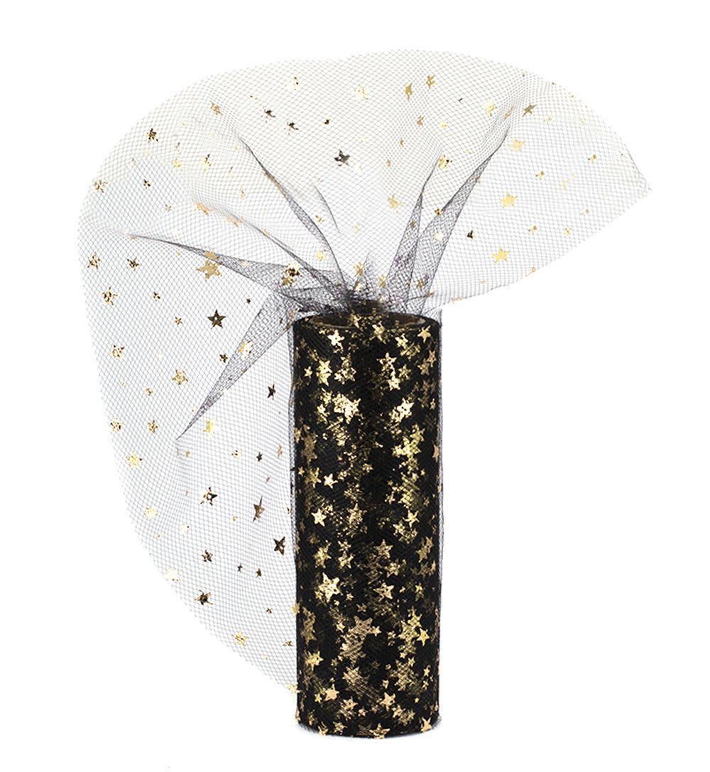 Tüll Stoff Rolle 9m x 15cm Sterne, schwarz / gold