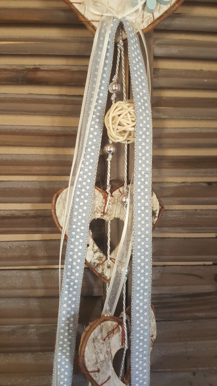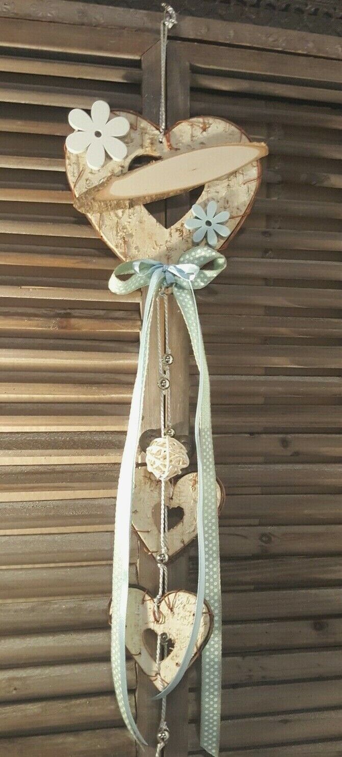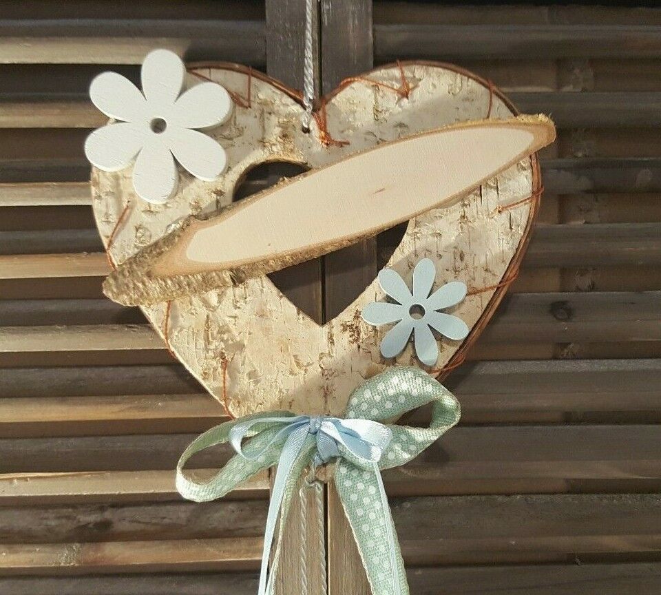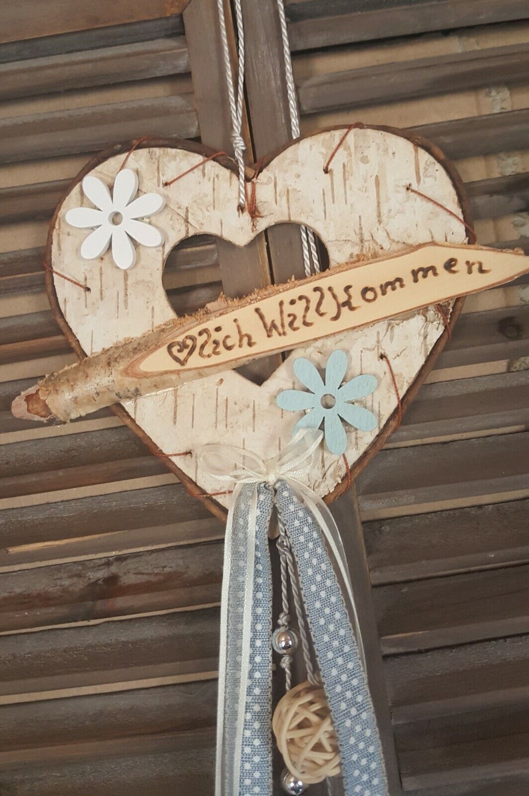 Türdekohänger Willkommen Frühling Holzherz Schild blau rosa grün Birkenrinde Landhaus