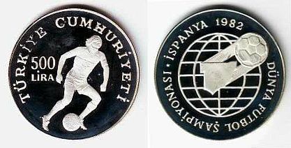 Türkei Silber Proof/ PP 500 Lira 1982 WM Spanien Spieler am Ball, Rar nur 12 390 Ex.