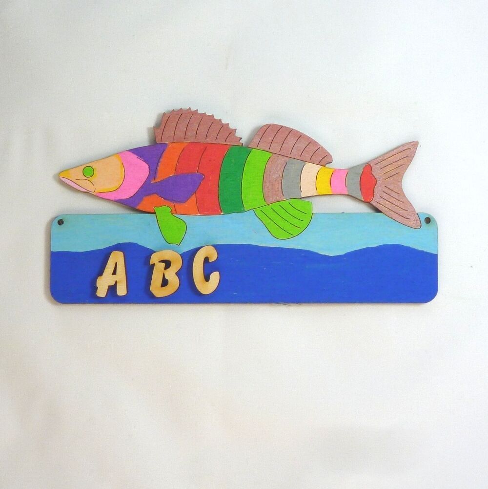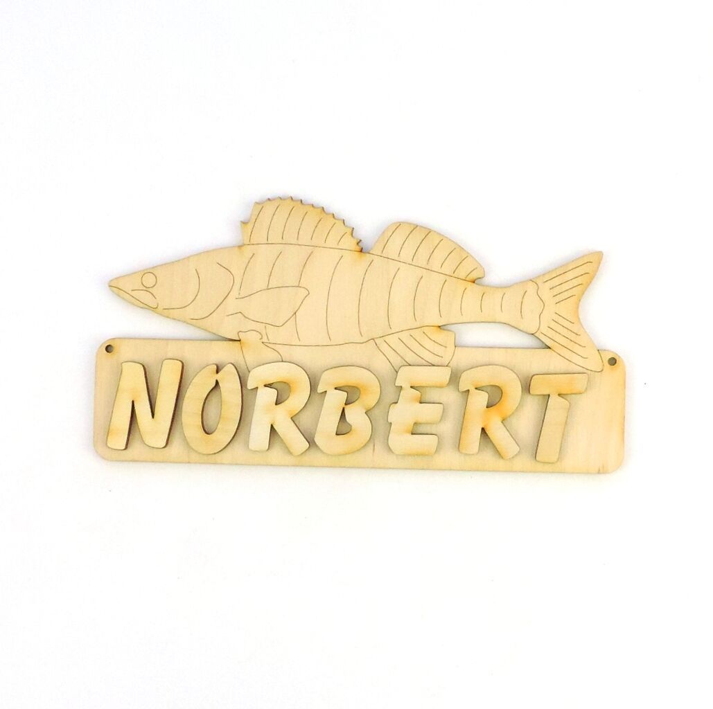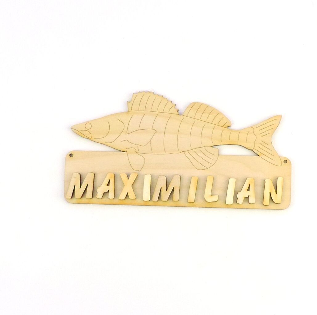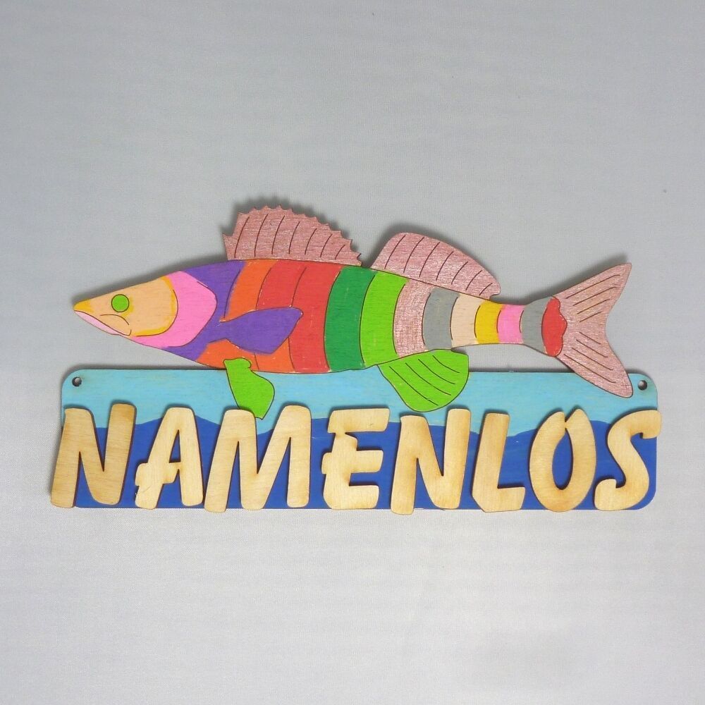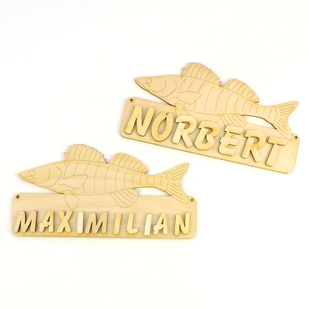 Türschild für Angler mit Wunschname, farbige Buchstaben 18cm Holz Fisch, Zander