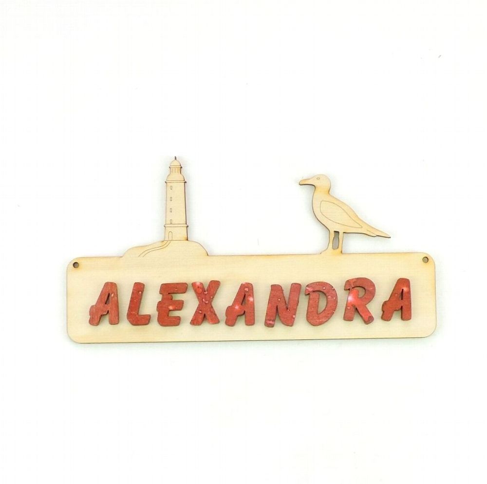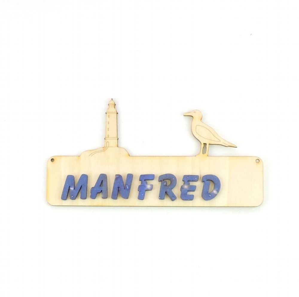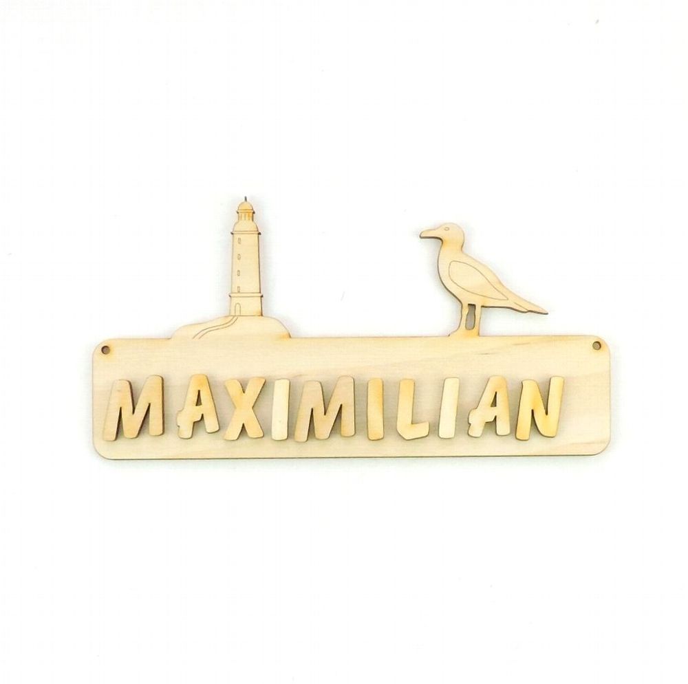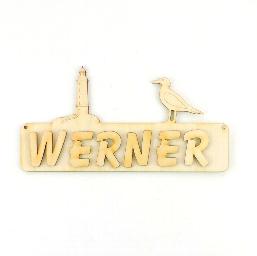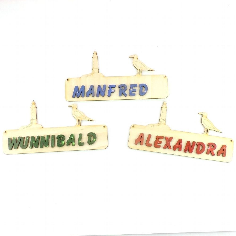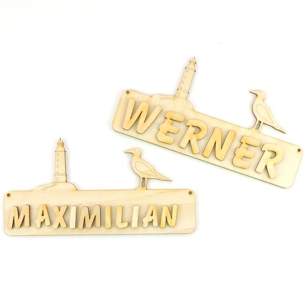 Türschild Leuchtturm und Möwe Das Türschild aus Sperrholz ist 18 cm lang und 3 mm stark. Optional mit Buchstaben 21 mm in rot, blau, grün oder natur, 30 mm in natur. Damit Sie das Türschild besser gestalten können, erhalten Sie dazu Ihren gewünschten Namen mit losen Buchstaben. Bitte geben Sie nach