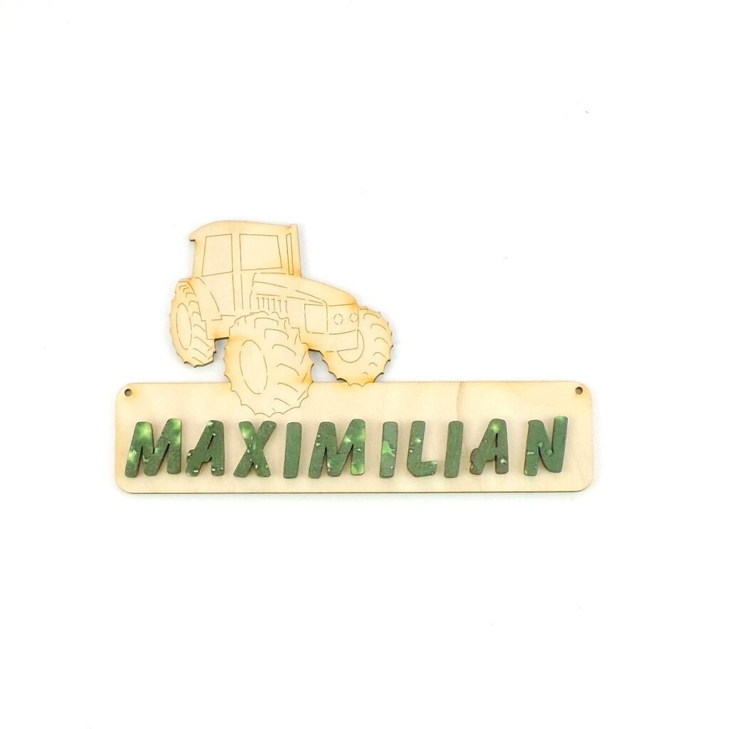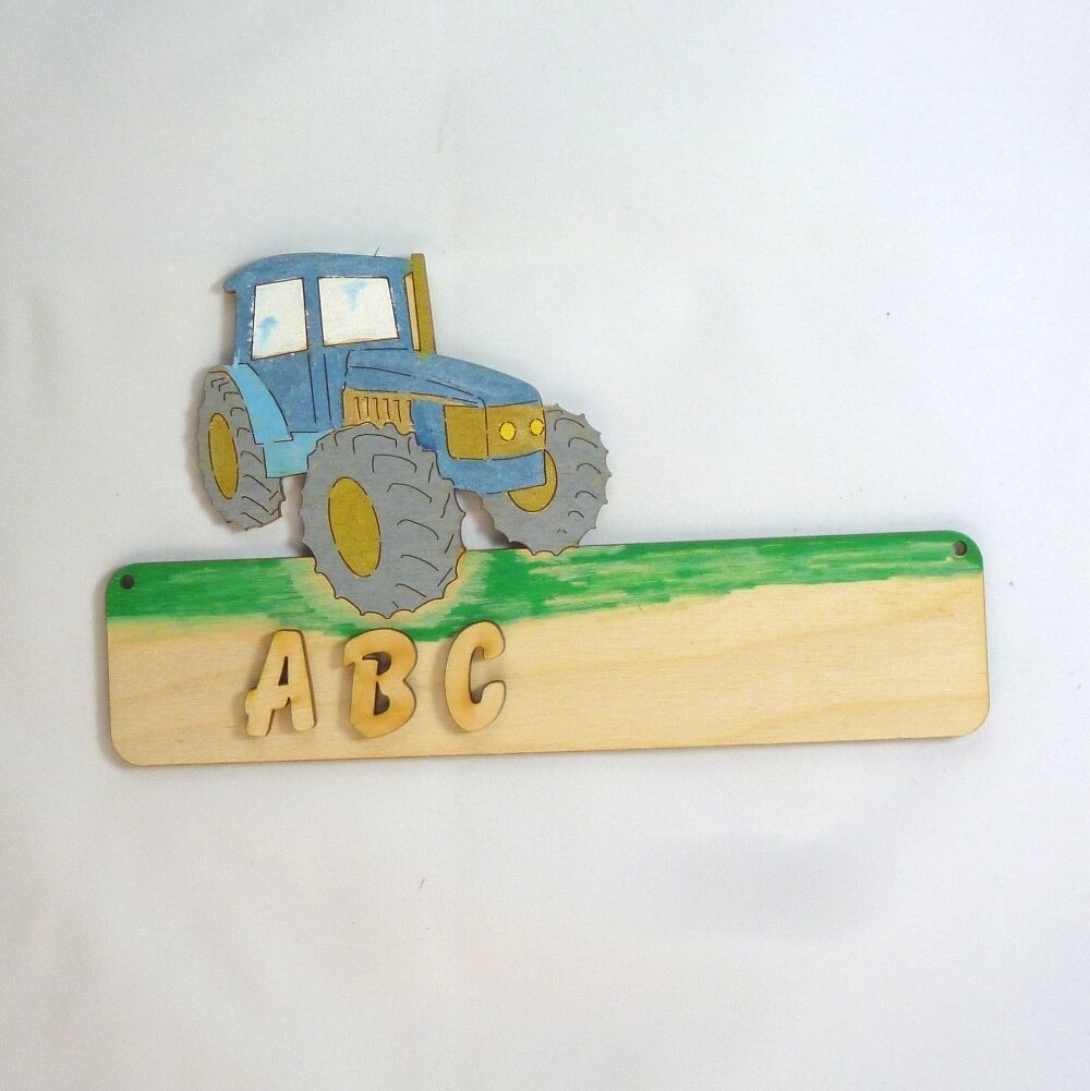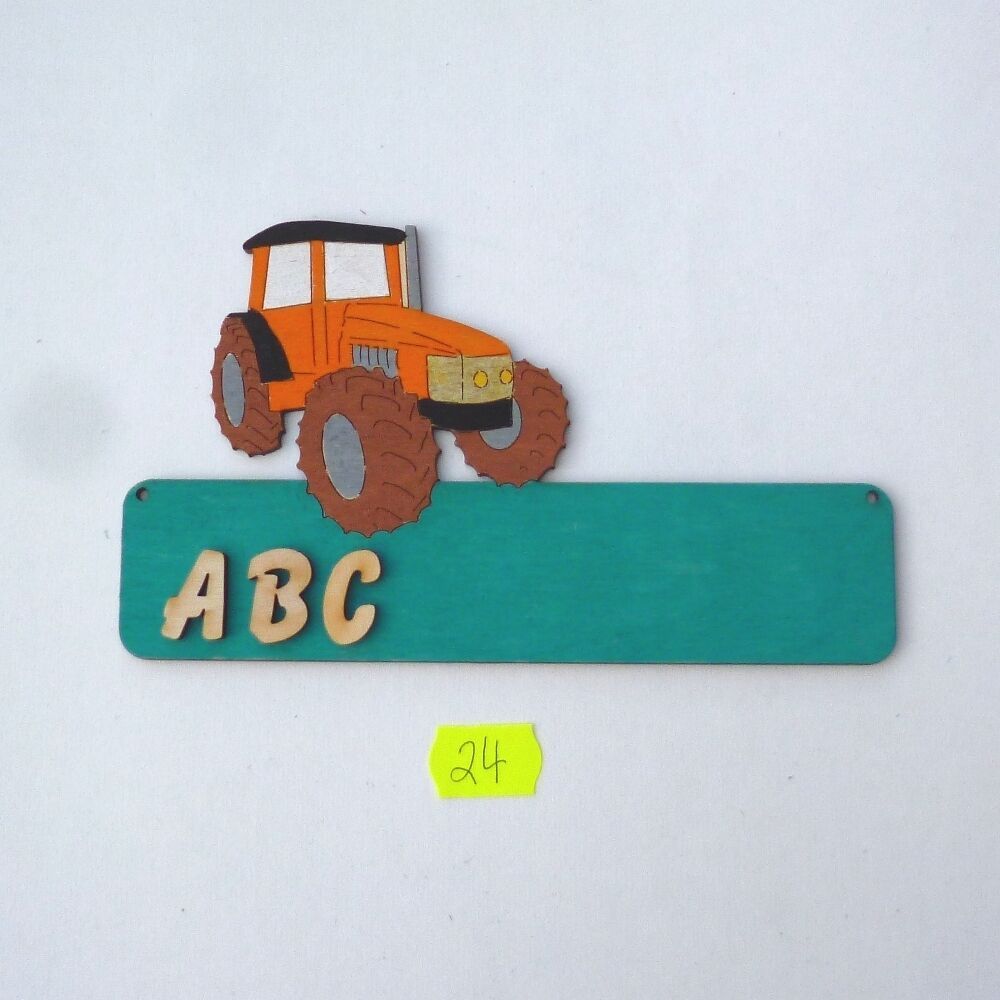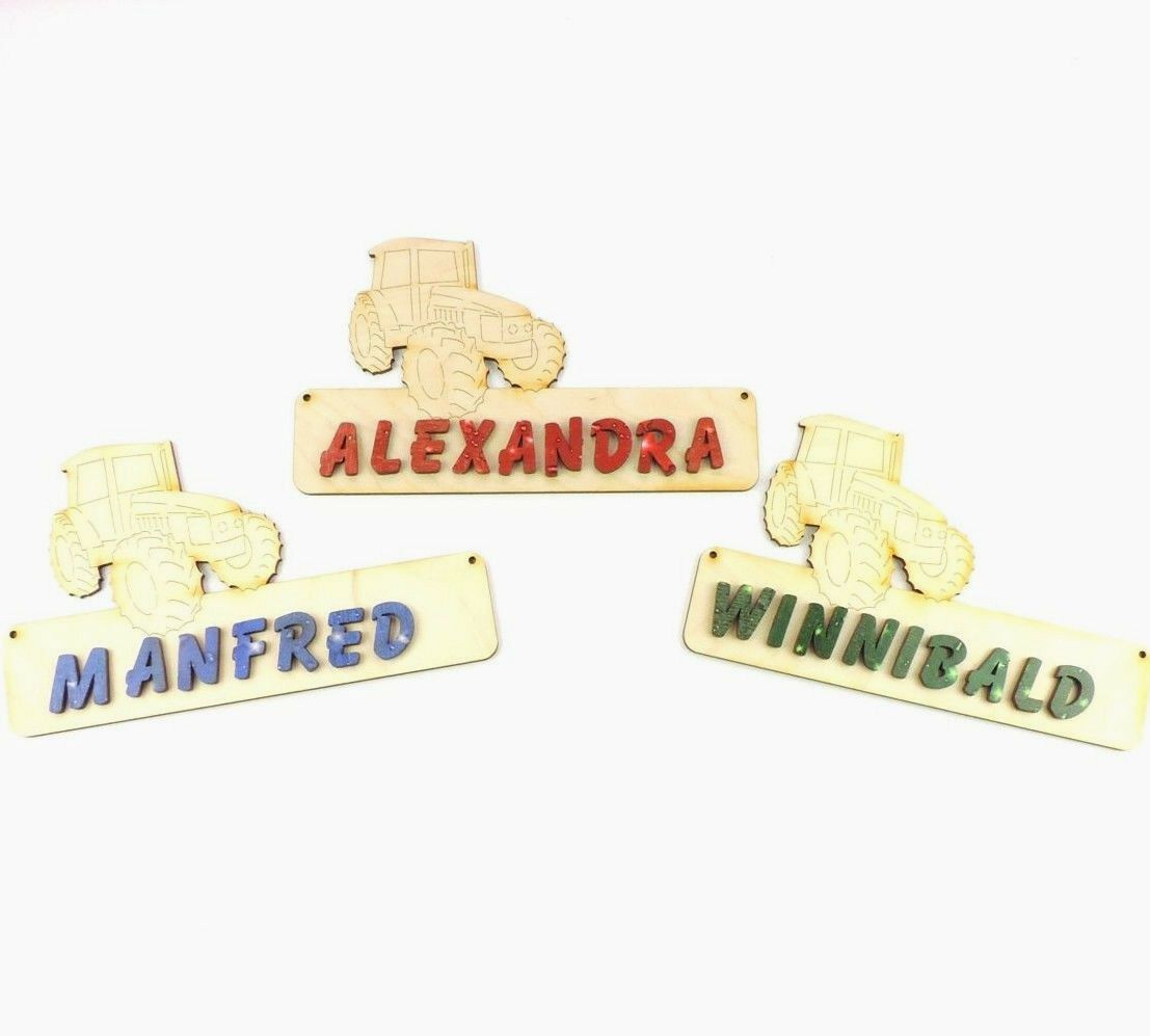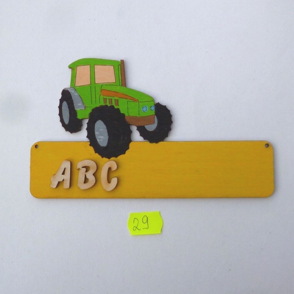 Türschild Kinderzimmer mit farbigen Buchstaben 18cm Holz, John Deere Traktor