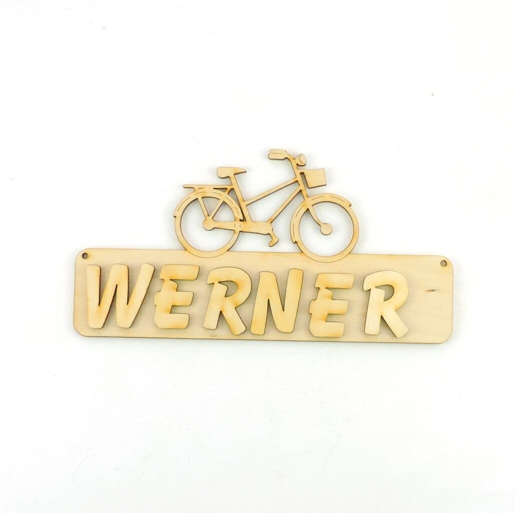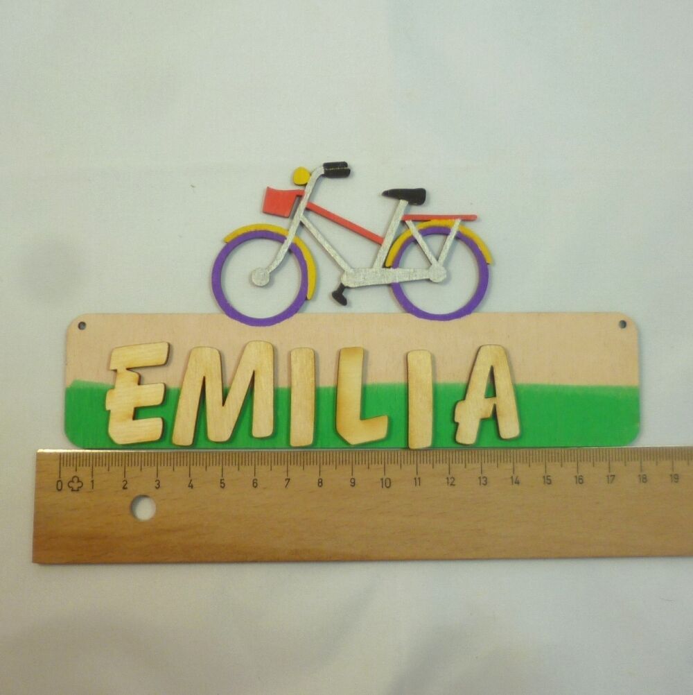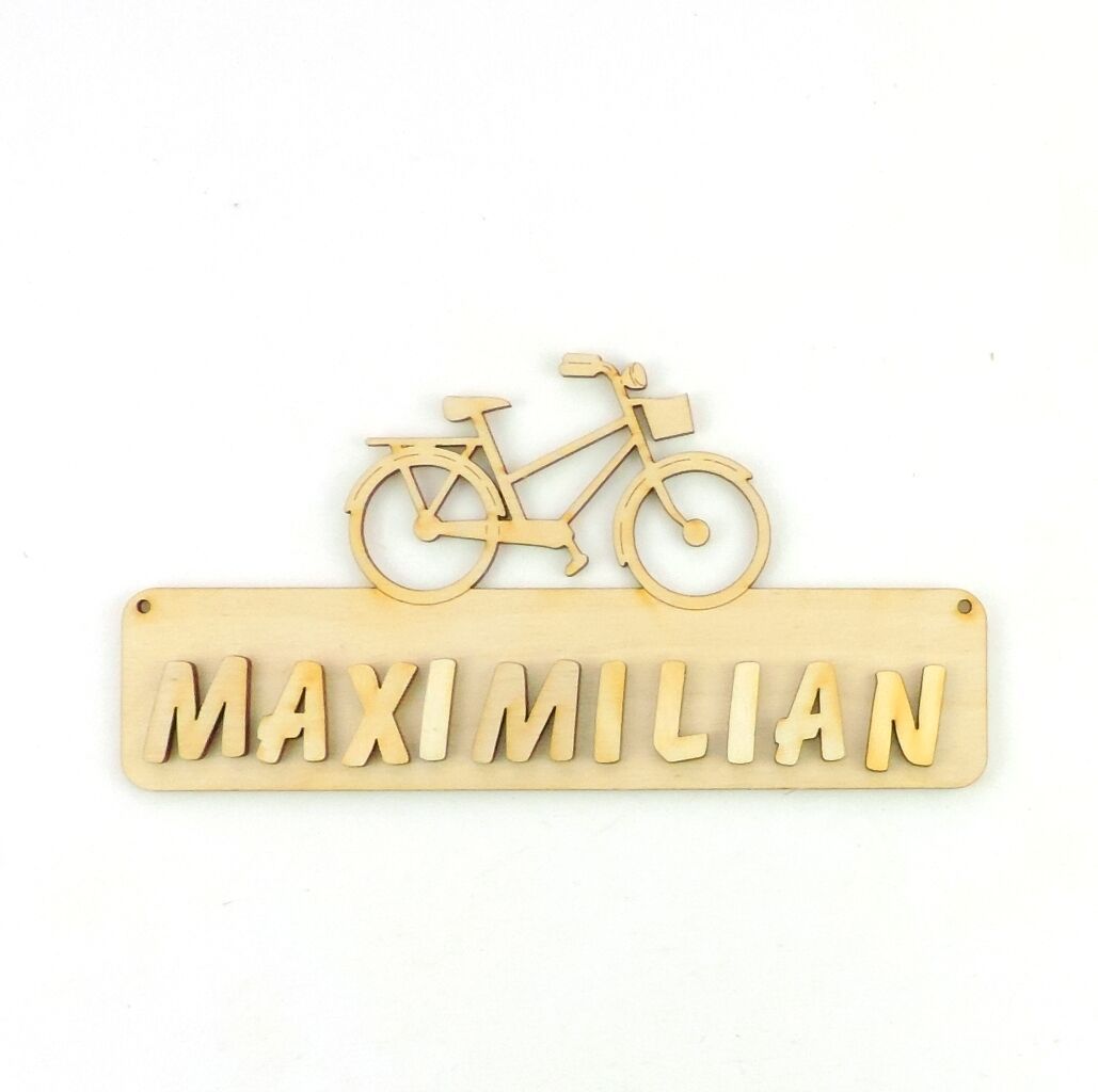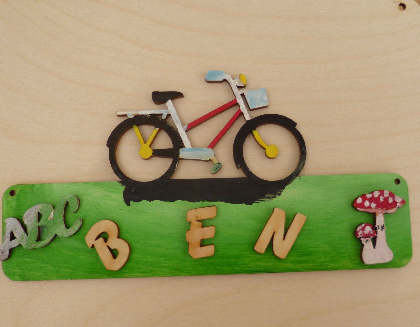 Türschild Kinderzimmer mit Name in farbigen Buchstaben, 18cm Holz, Fahrrad