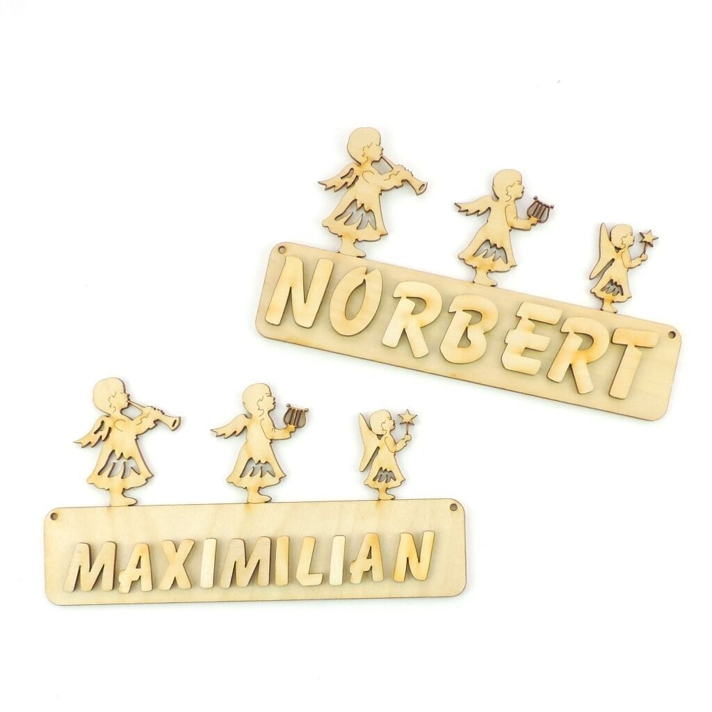 Türschild 3 Engel Das Türschild aus Sperrholz ist 18 cm lang und 3 mm stark. Optional mit Buchstaben 21 mm in rot, blau, grün oder natur, 30 mm in natur. Damit Sie das Türschild besser gestalten können, erhalten Sie dazu Ihren gewünschten Namen mit losen Buchstaben. Bitte geben Sie nach dem Kauf an,