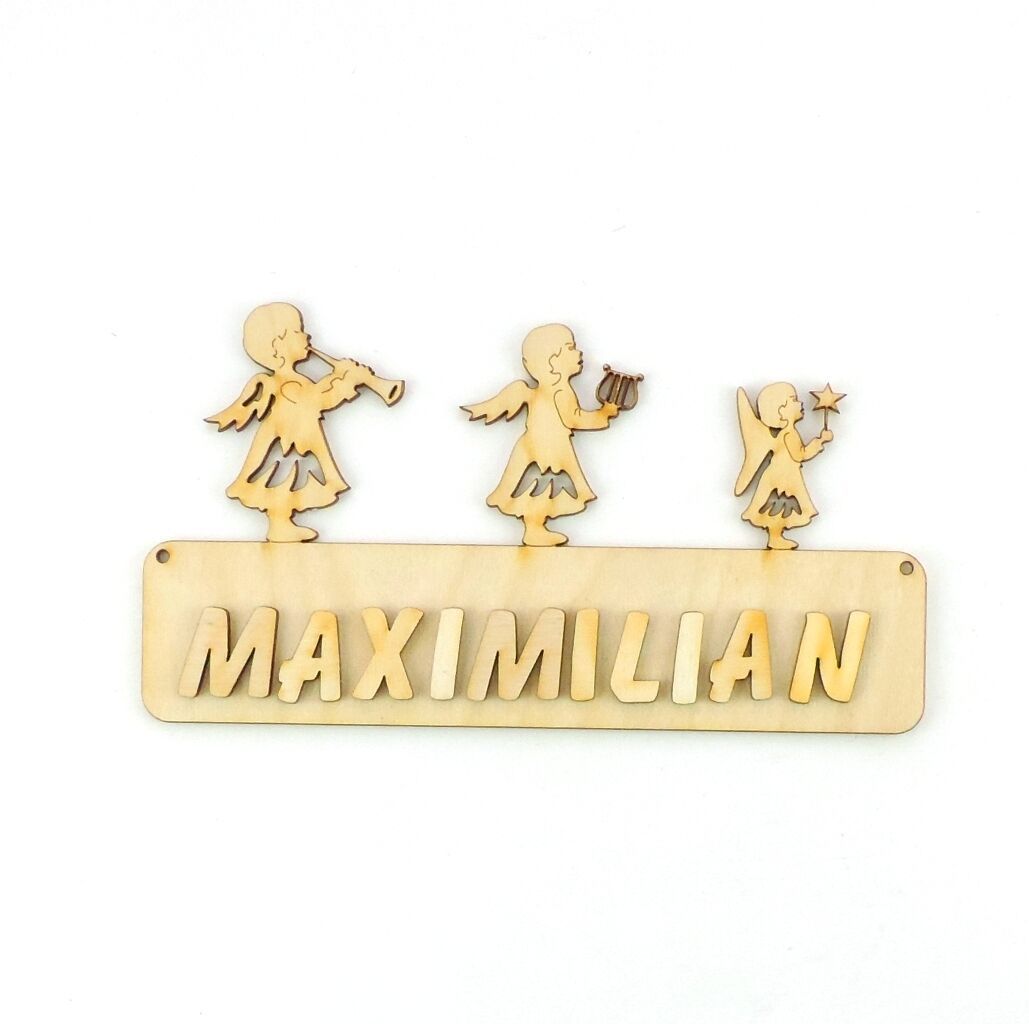 Türschild Kinderzimmer mit Namen, farbigen Buchstaben, 18cm Holz, 3 Engel