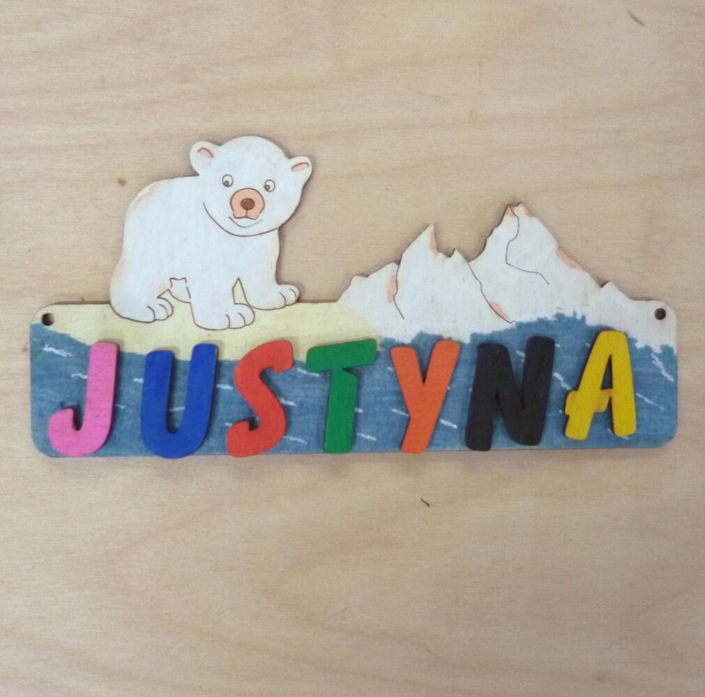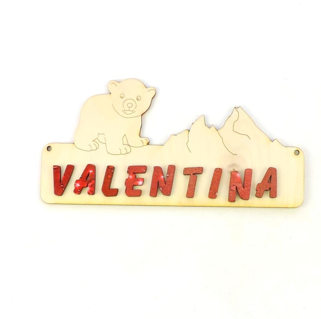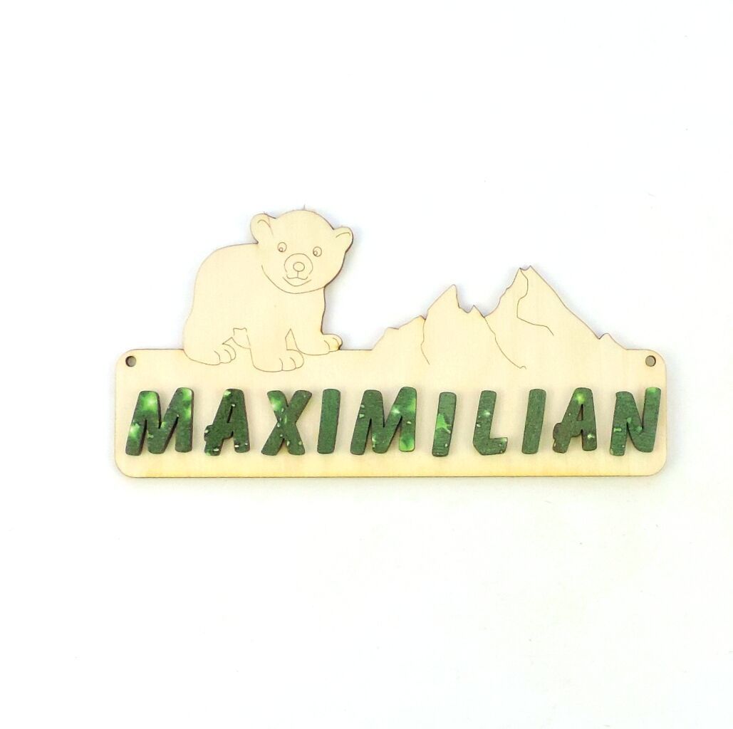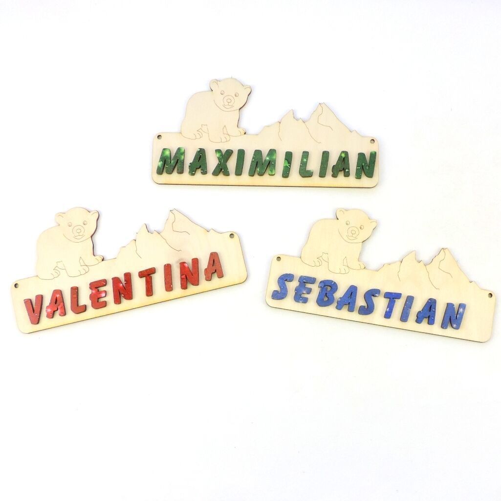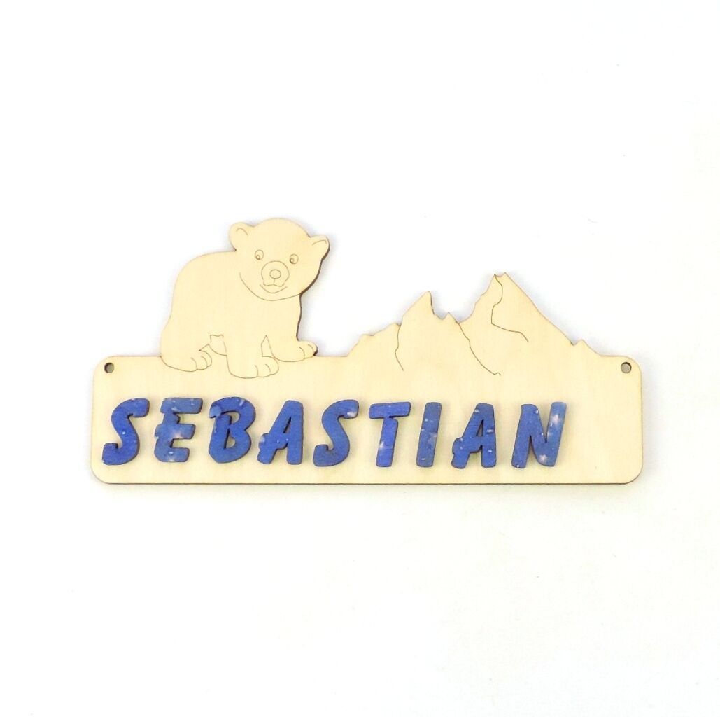 Türschild Eisbär und Berg Das Türschild aus Sperrholz ist 18 cm lang und 3 mm stark. Optional mit Buchstaben 21 mm in rot, blau, grün oder natur, 30 mm in natur. Damit Sie das Türschild besser gestalten können, erhalten Sie dazu Ihren gewünschten Namen mit losen Buchstaben. Bitte geben Sie nach dem