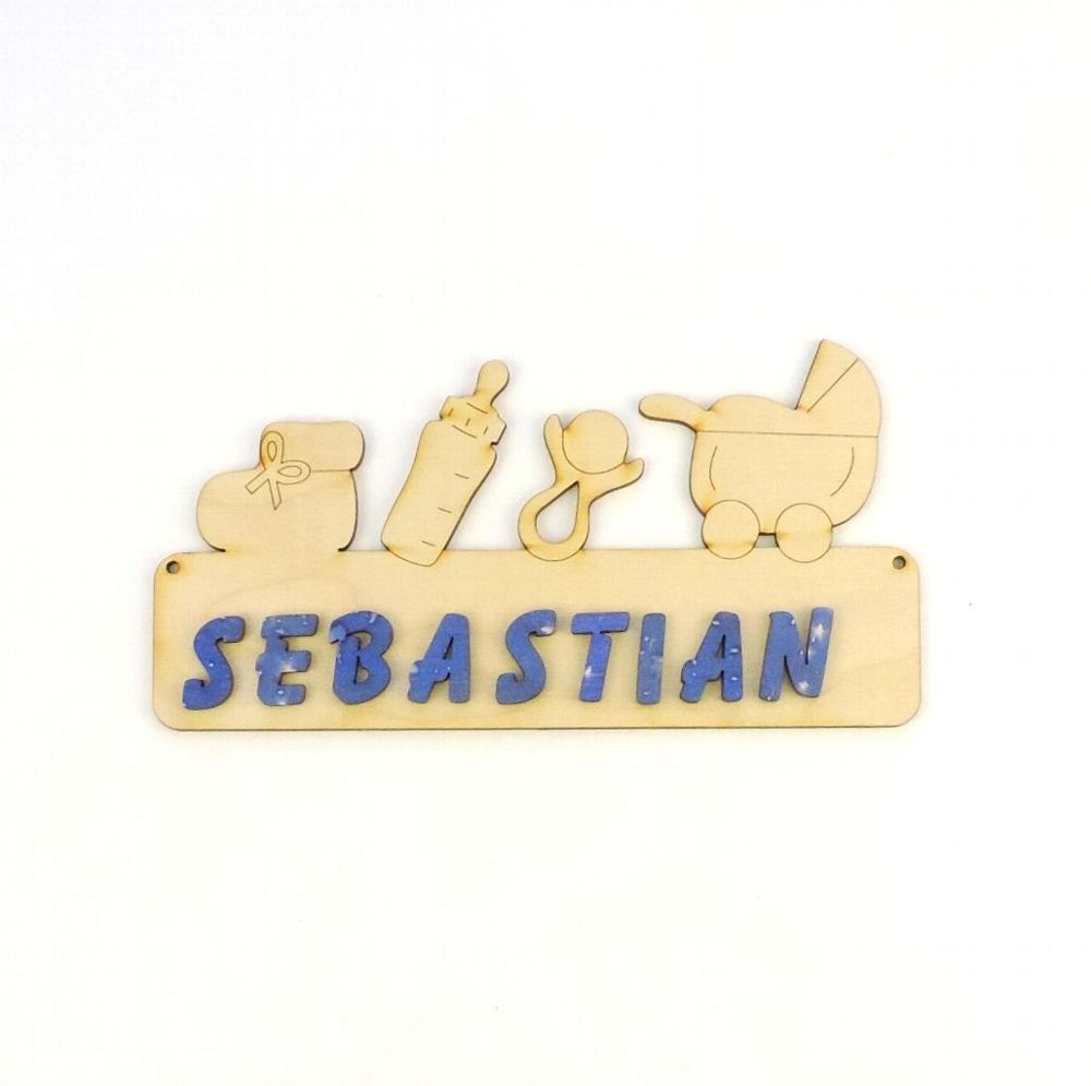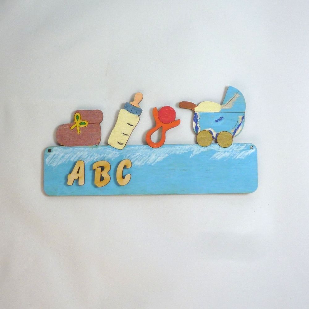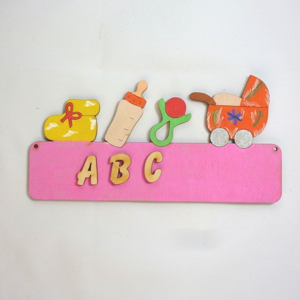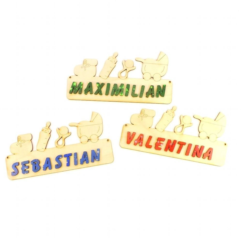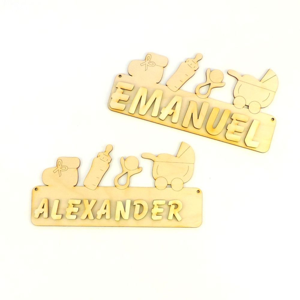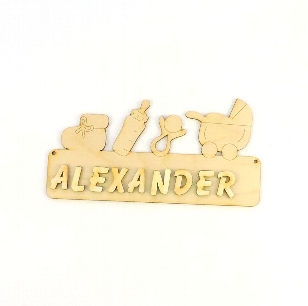 Türschild mit Name, Buchstaben 18cm Holz Babysachen Flasche Rassel Kinderwaagen