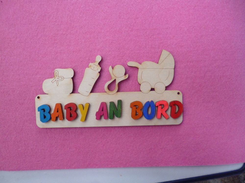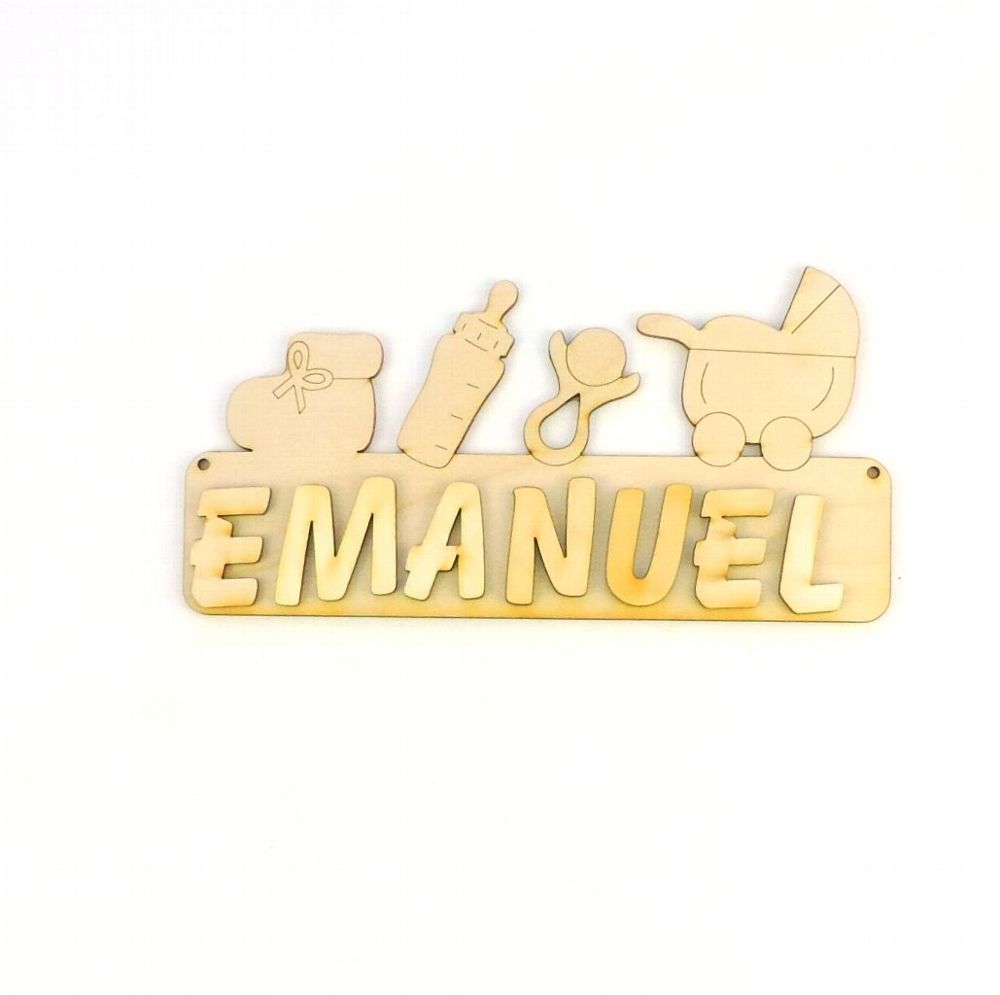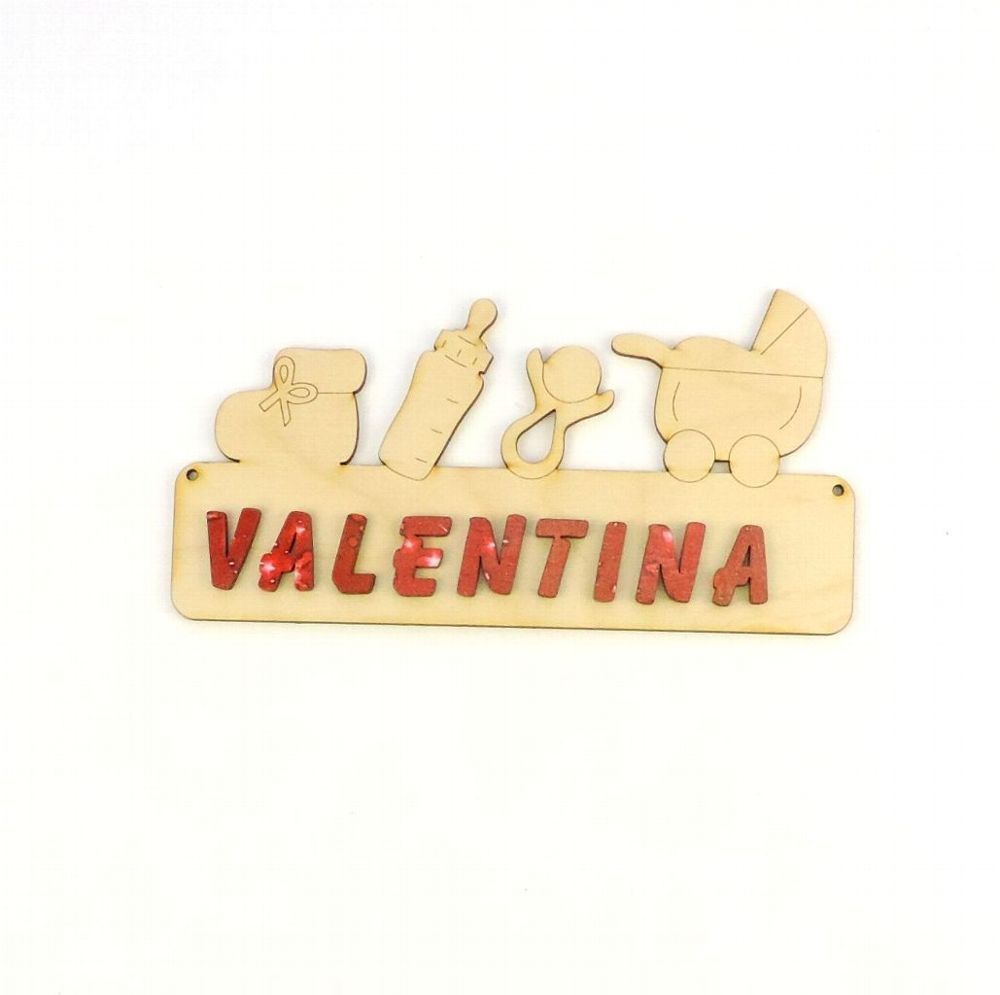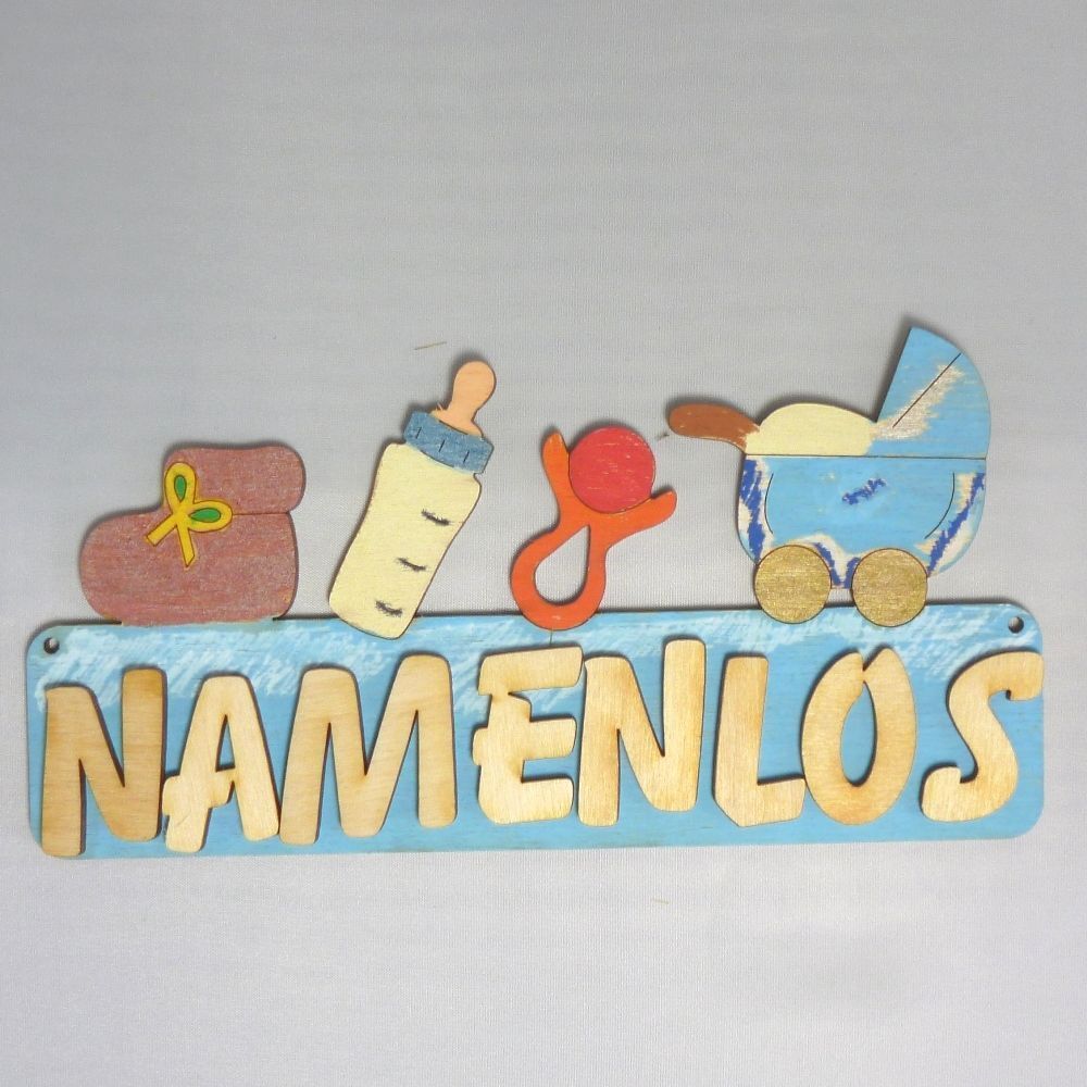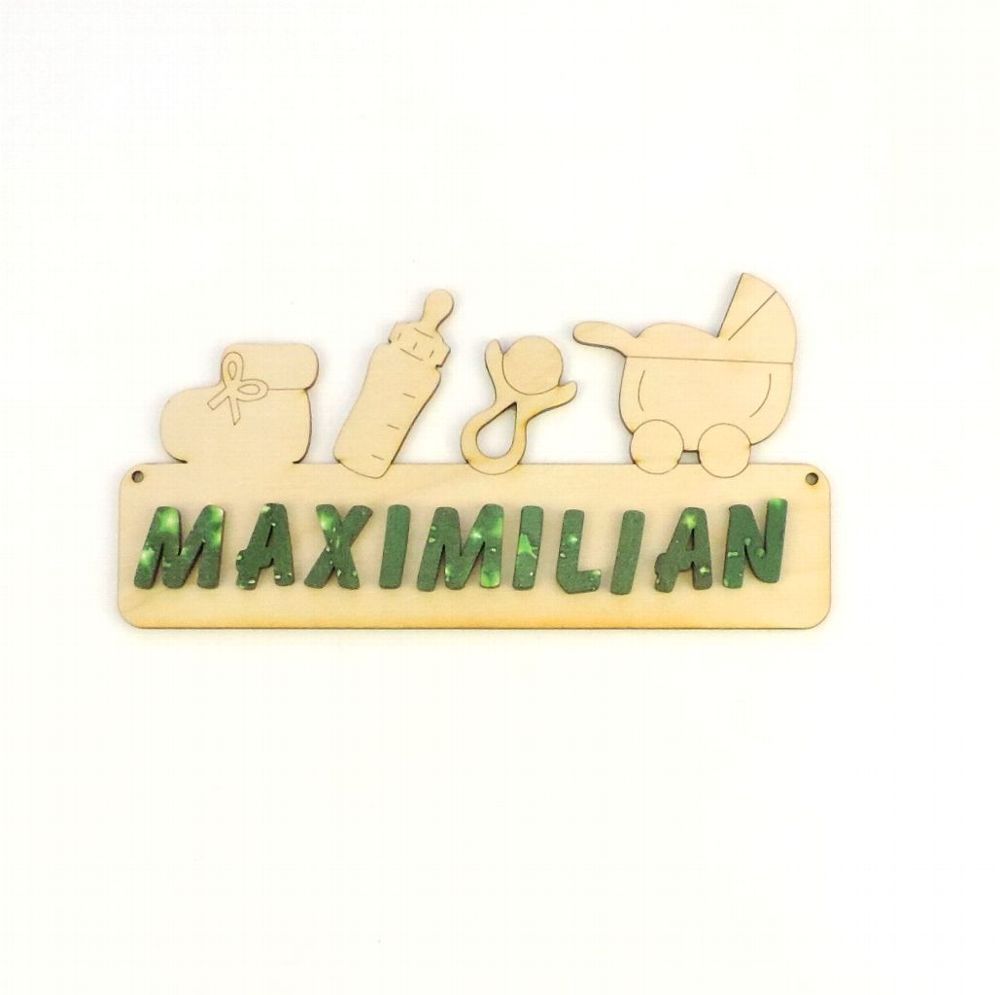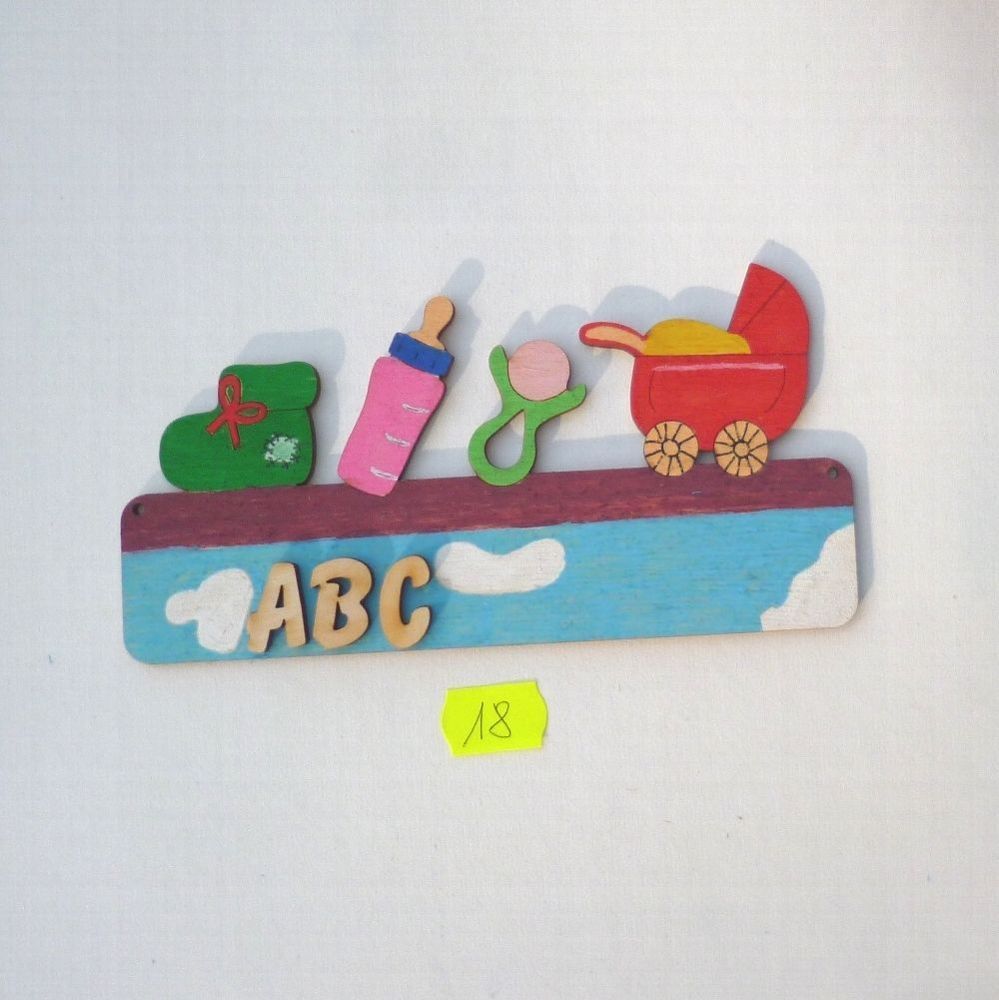 Türschild mit Name, Buchstaben 18cm Holz Babysachen Flasche Rassel Kinderwaagen