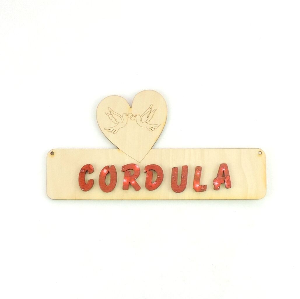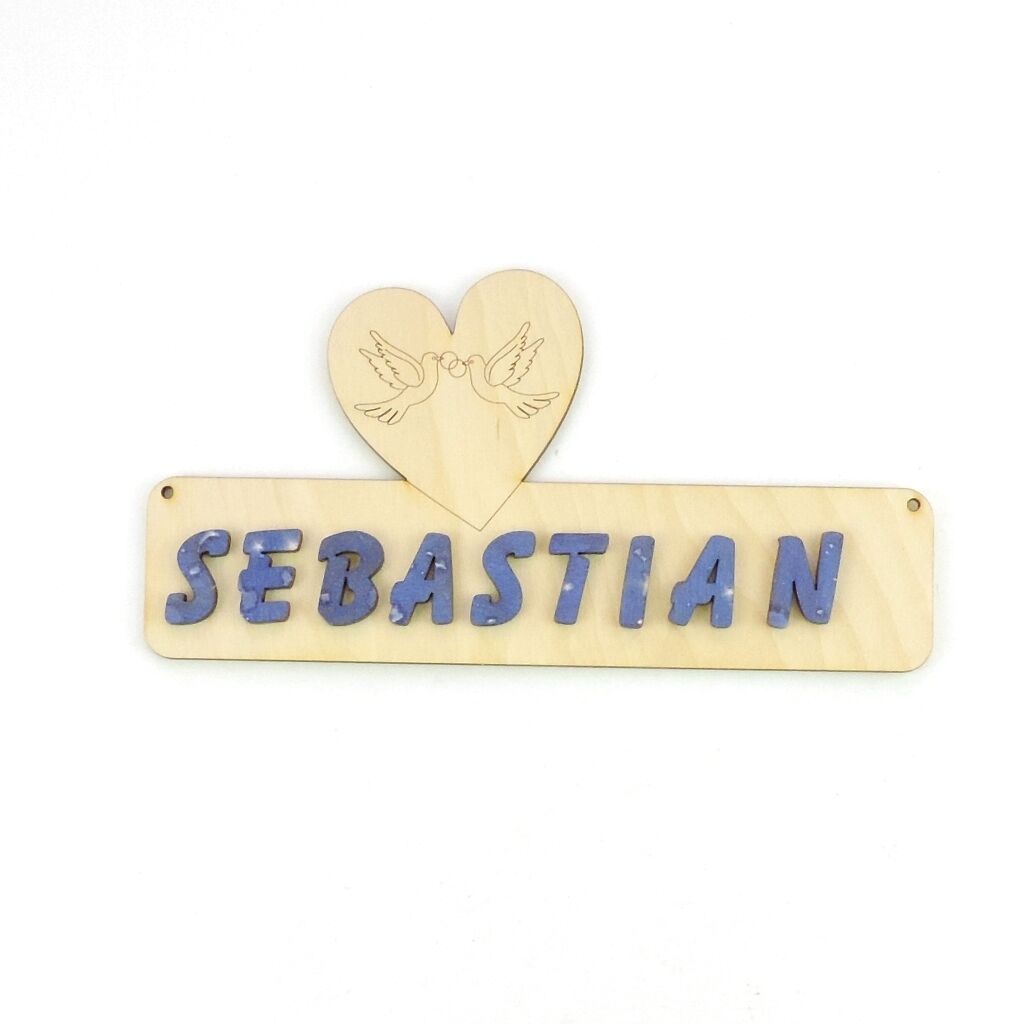 Türschild Herz mit Tauben Das Türschild aus Sperrholz ist 18 cm lang und 3 mm stark. Optional mit Buchstaben 30 mm in natur. Damit Sie das Türschild besser gestalten können, erhalten Sie dazu Ihren gewünschten Namen mit losen Buchstaben. Bitte geben Sie nach dem Kauf an, welcher Name mitgesendet wer