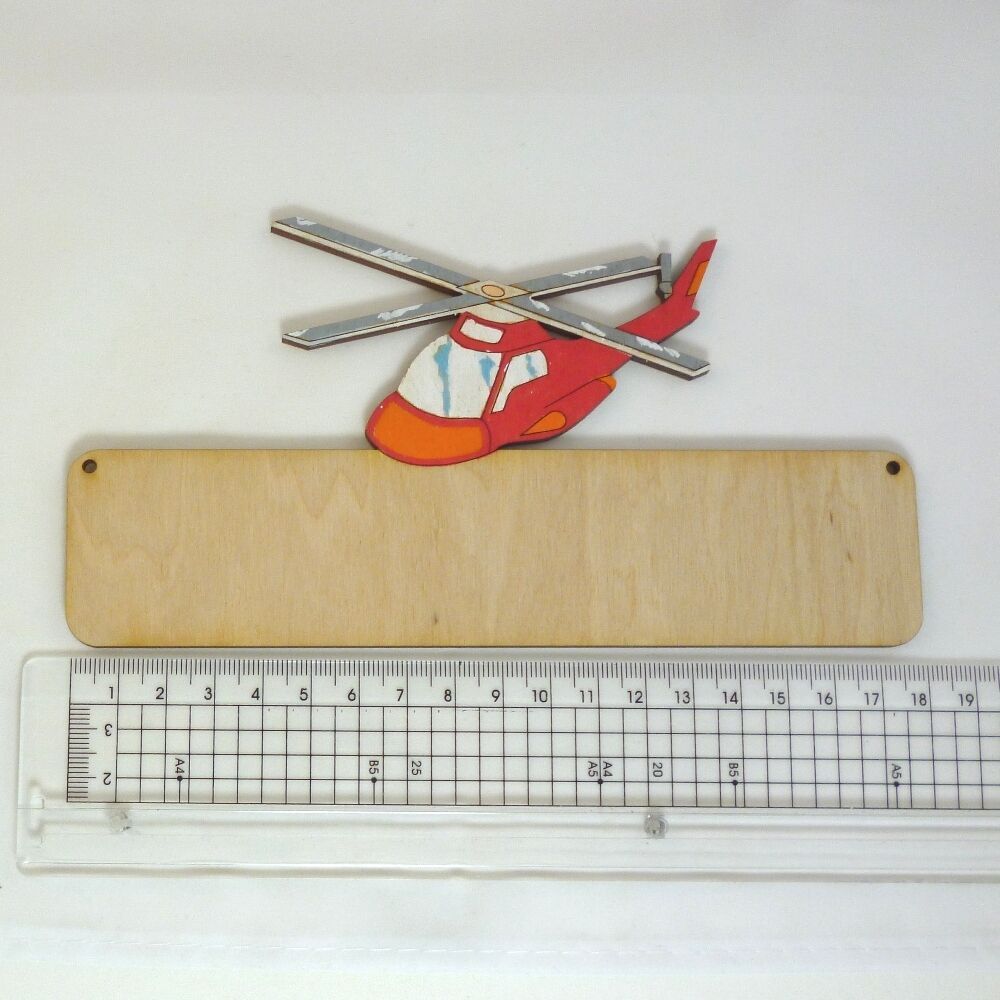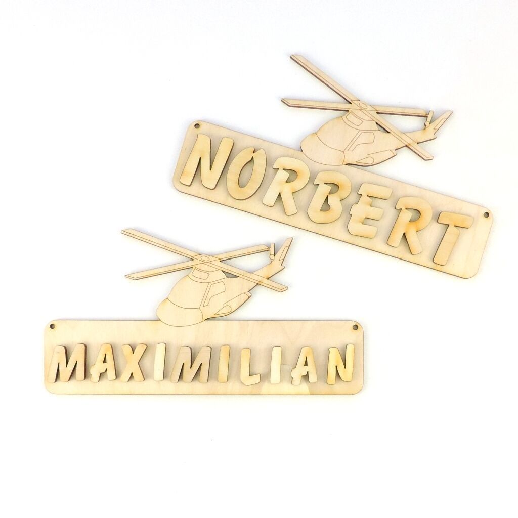 Türschild Hubschrauber Das Türschild aus Sperrholz ist 18 cm lang und 3 mm stark. Optional mit Buchstaben 21 mm in Natur, 30 mm in Natur. Damit Sie das Türschild besser gestalten können, erhalten Sie dazu Ihren gewünschten Namen mit losen Buchstaben. Bitte geben Sie nach dem Kauf an, welcher Name mi