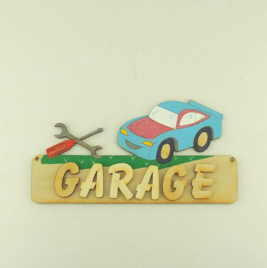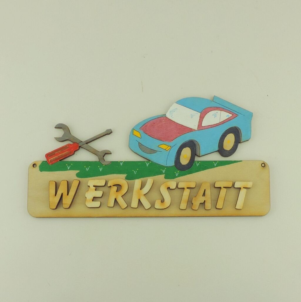 Türschild personalisiert, farbige Buchstaben 18cm Holz Auto mit Werkzeug