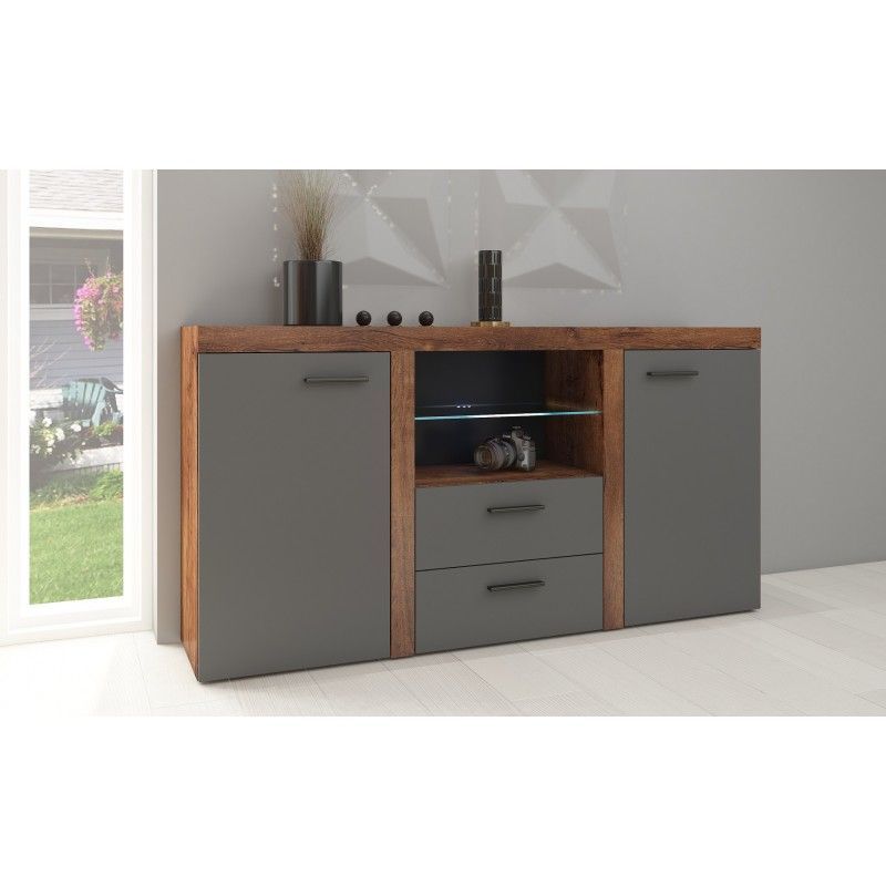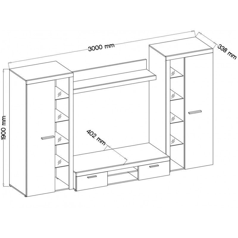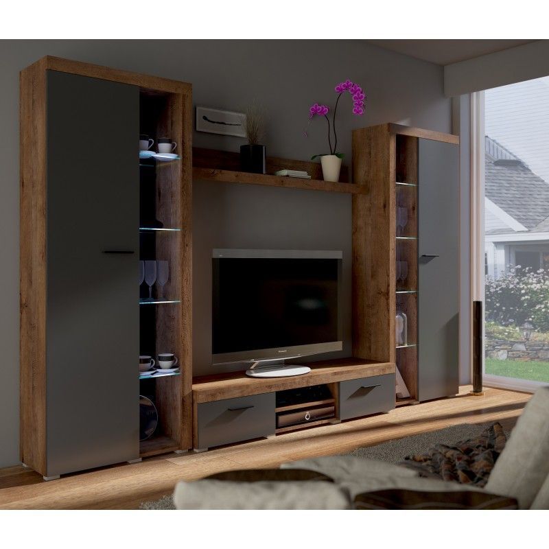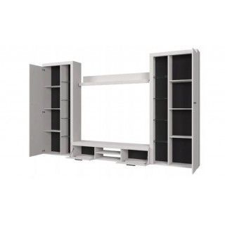 Die Wohnwand TUMBA ist das perfekte Set für Ihr Wohnzimmer. In einem modernen und originellen Stil gefertigt, wird es Ihrem Raum ein ästhetisch ansprechendes Aussehen verleihen. Die verglasten Türen lassen die Schränke geräumiger erscheinen, und sie können auch die Familienandenken oder Dekorationen, die für die Familie wichtig sind, auffällig präsentieren. Das im Set enthaltene RTV-Regal ermöglicht die einfache Installation von Multimedia-Geräten.
