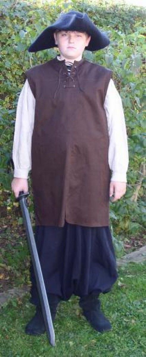 Mittelalterliche Tunika ohne Ärmel aus brauner Baumwolle zum Tragen über dem Hemd. Am vorderen Saum geschlitzt zum bequemeren Sitzen. Die Tunika ist am Kragen vorne über ein Baumwollband zum Schnüren, dadurch wird das An- und Ausziehen erleichtert. Die Tunika ist ab dem Ärmelausschnitt gerade geschnitten.